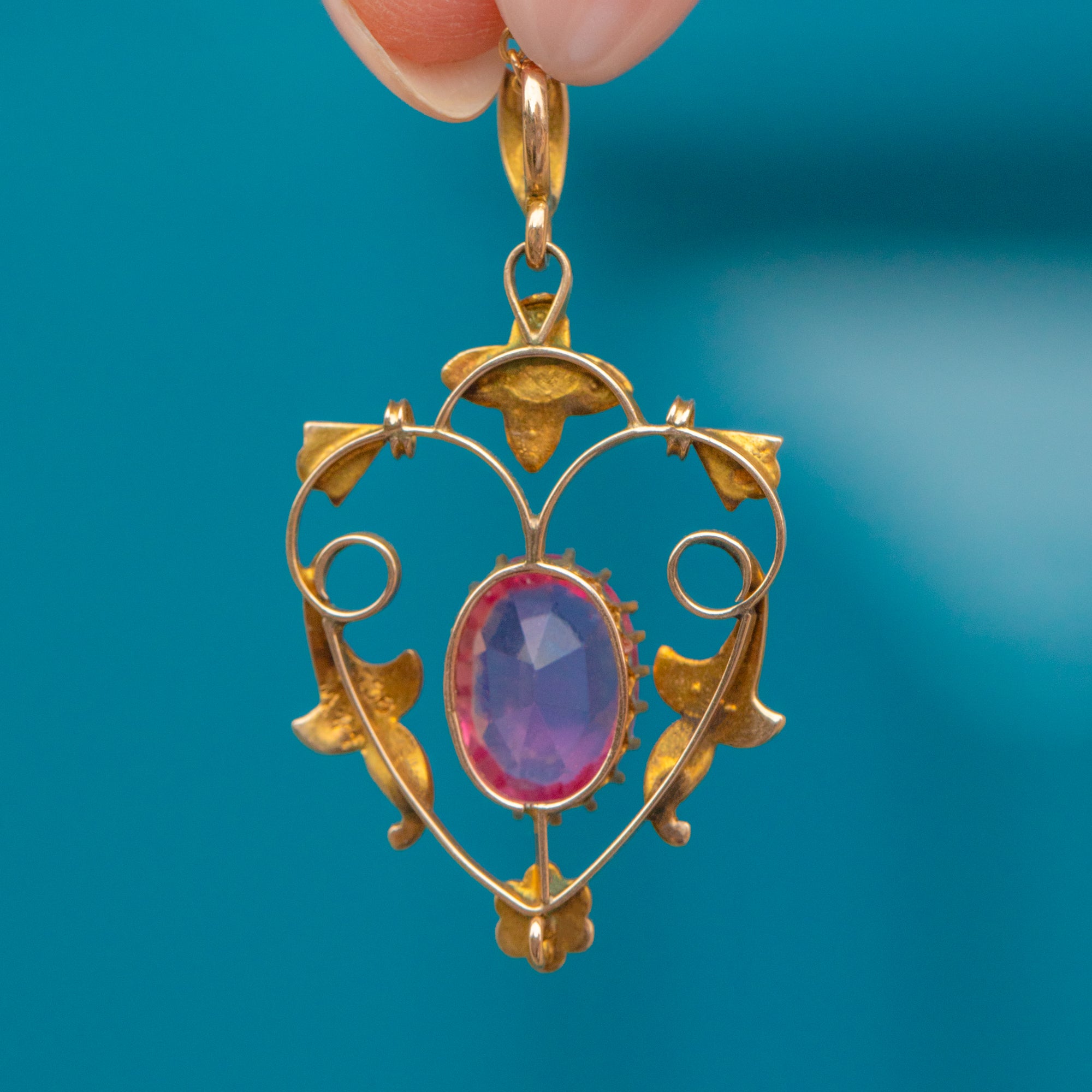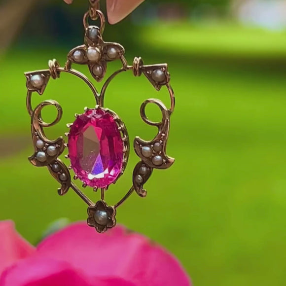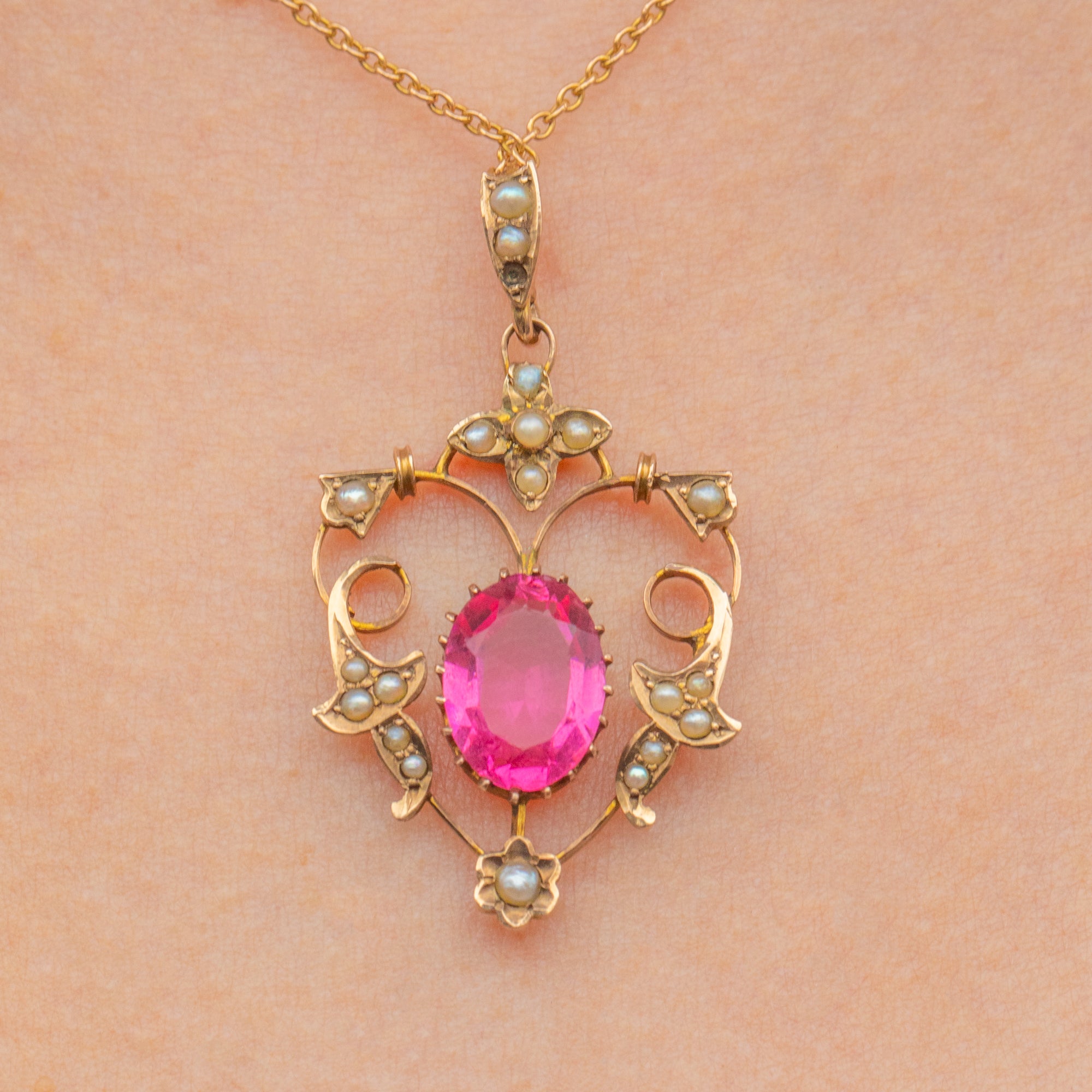 Edwardian 9ct Gold Pink Paste Pearl Heart Pendant