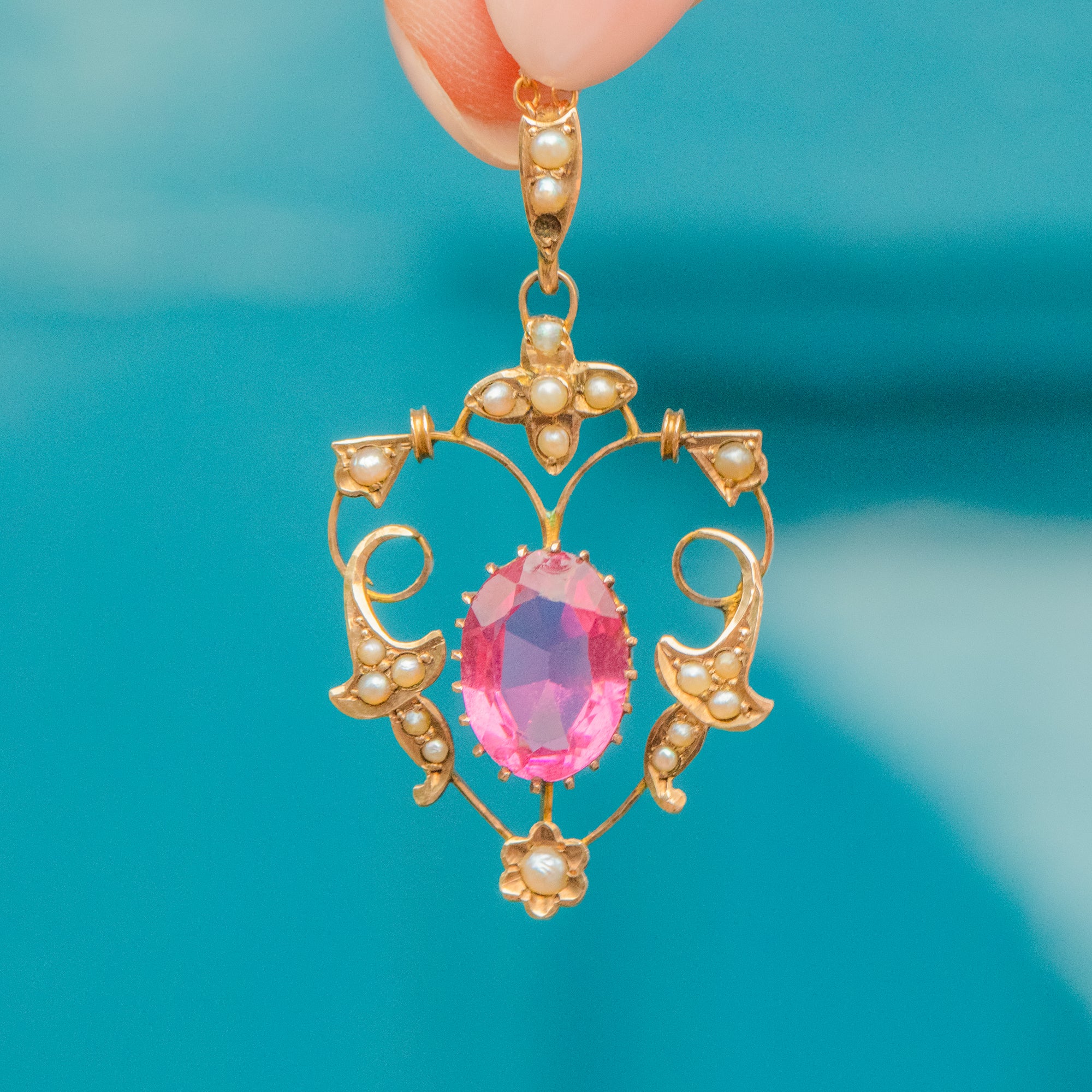 This exquisite Edwardian 9ct Gold pink Paste and Pearl heart pendant showcases a delicate heart-shaped design, elegantly crafted from rich, warm 9ct Gold. Her ornate heart is beautifully adorned with lustrous dainty Pearls dancing delicately around a large pink Paste stone that shimmers with a soft, romantic glow, perfectly capturing the essence of graceful glamour.