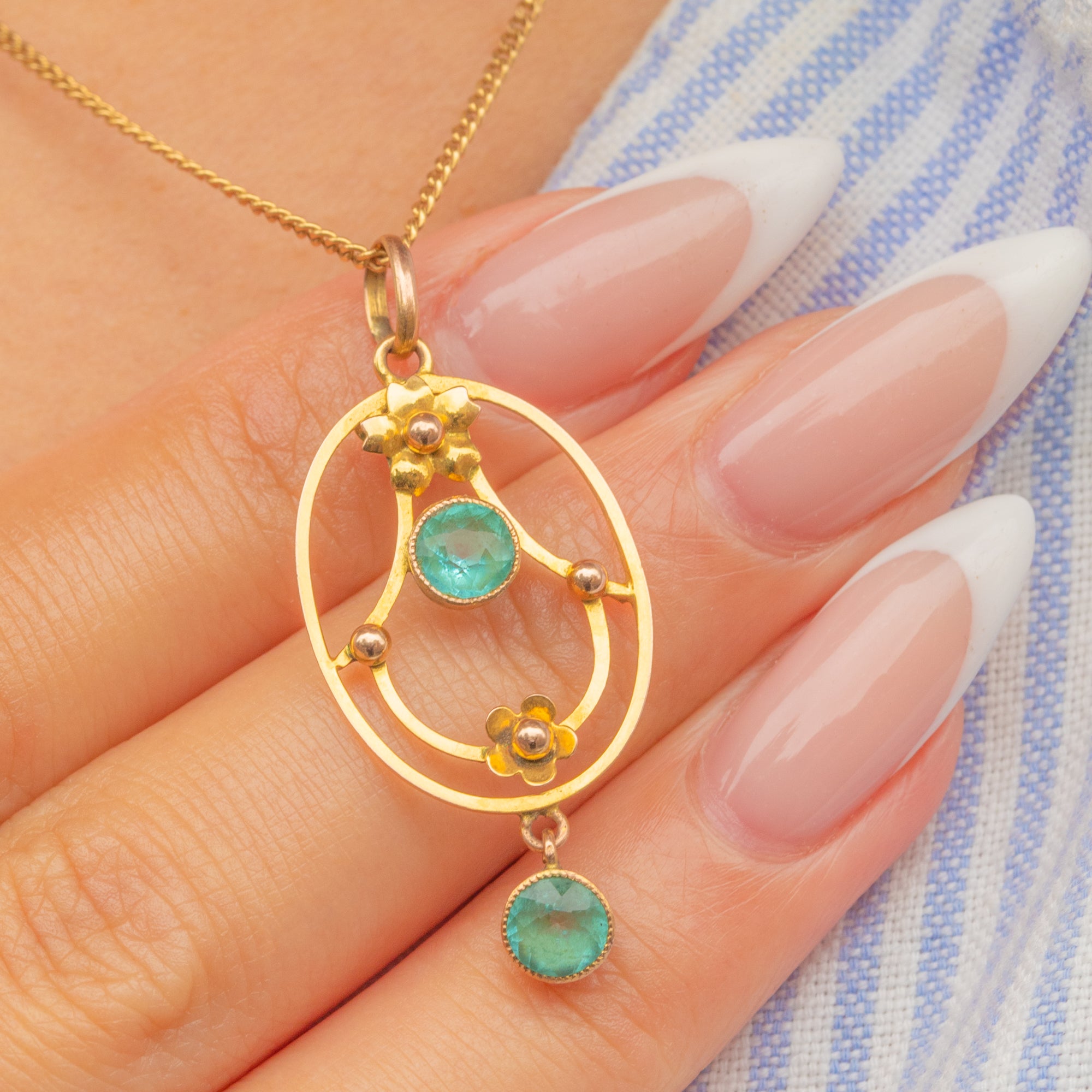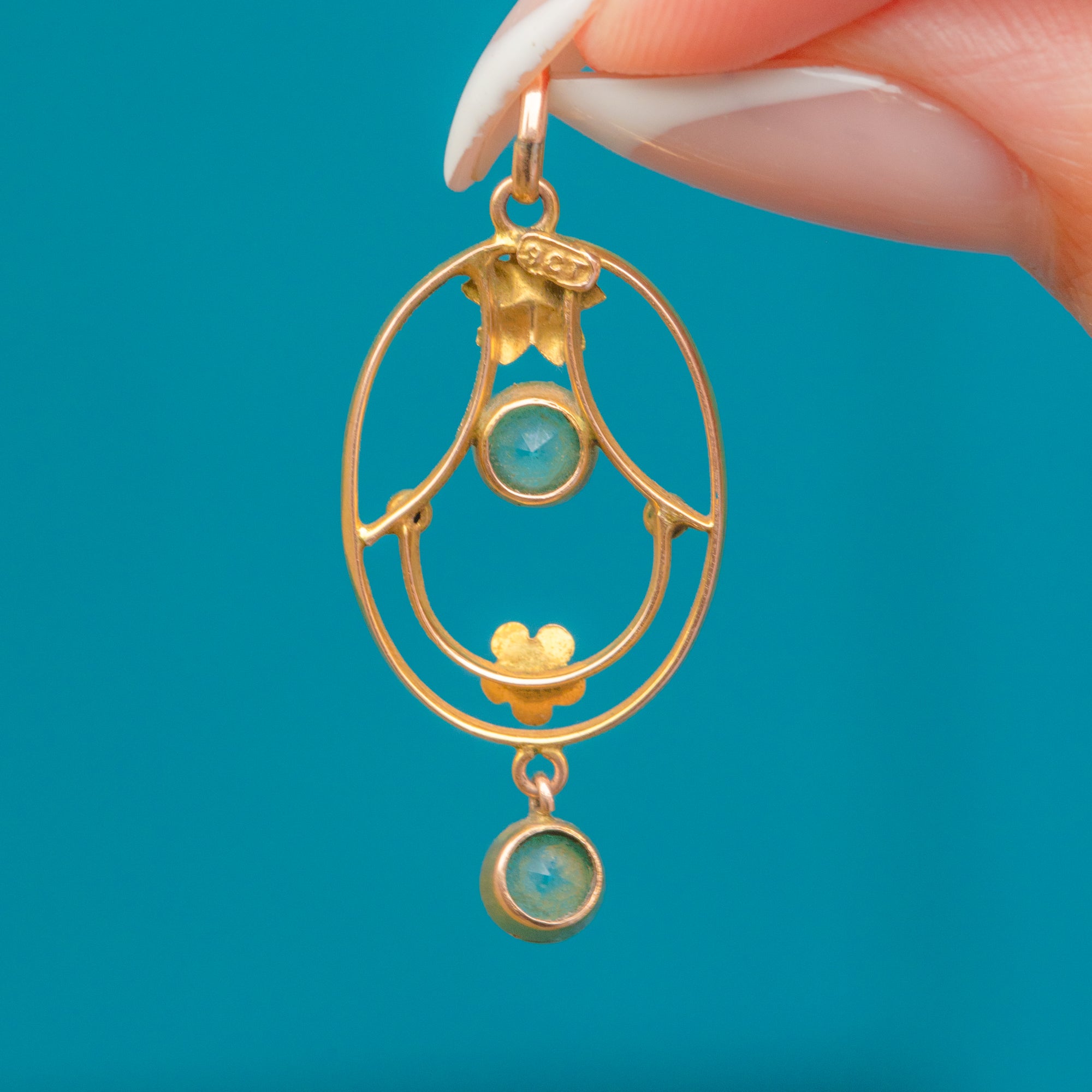 An elegant Edwardian pendant crafted in 9ct Gold, featuring two round teal-blue Paste gemstones set within a delicate openwork frame.