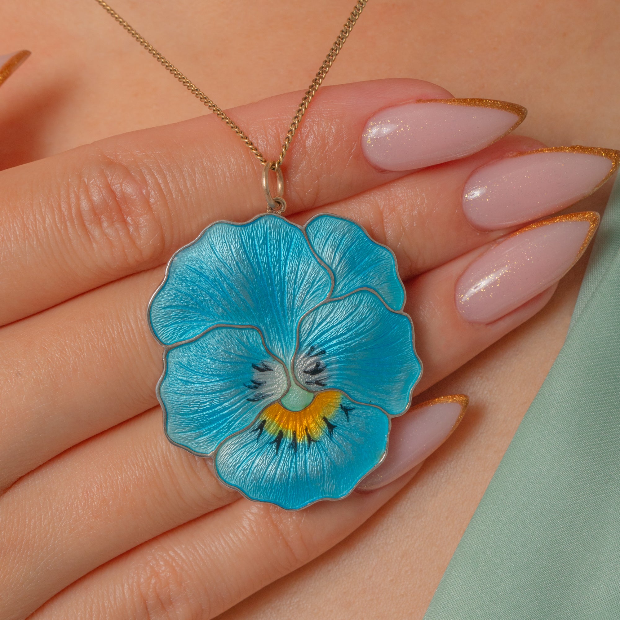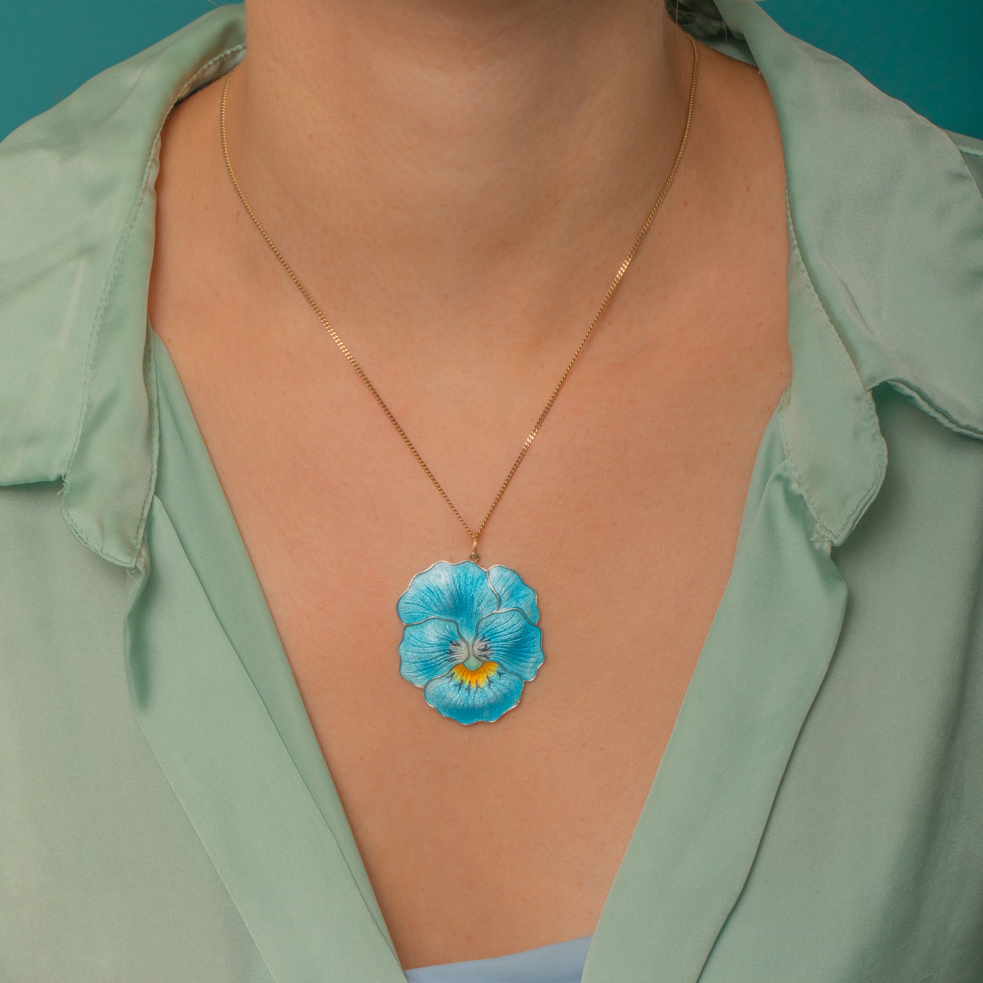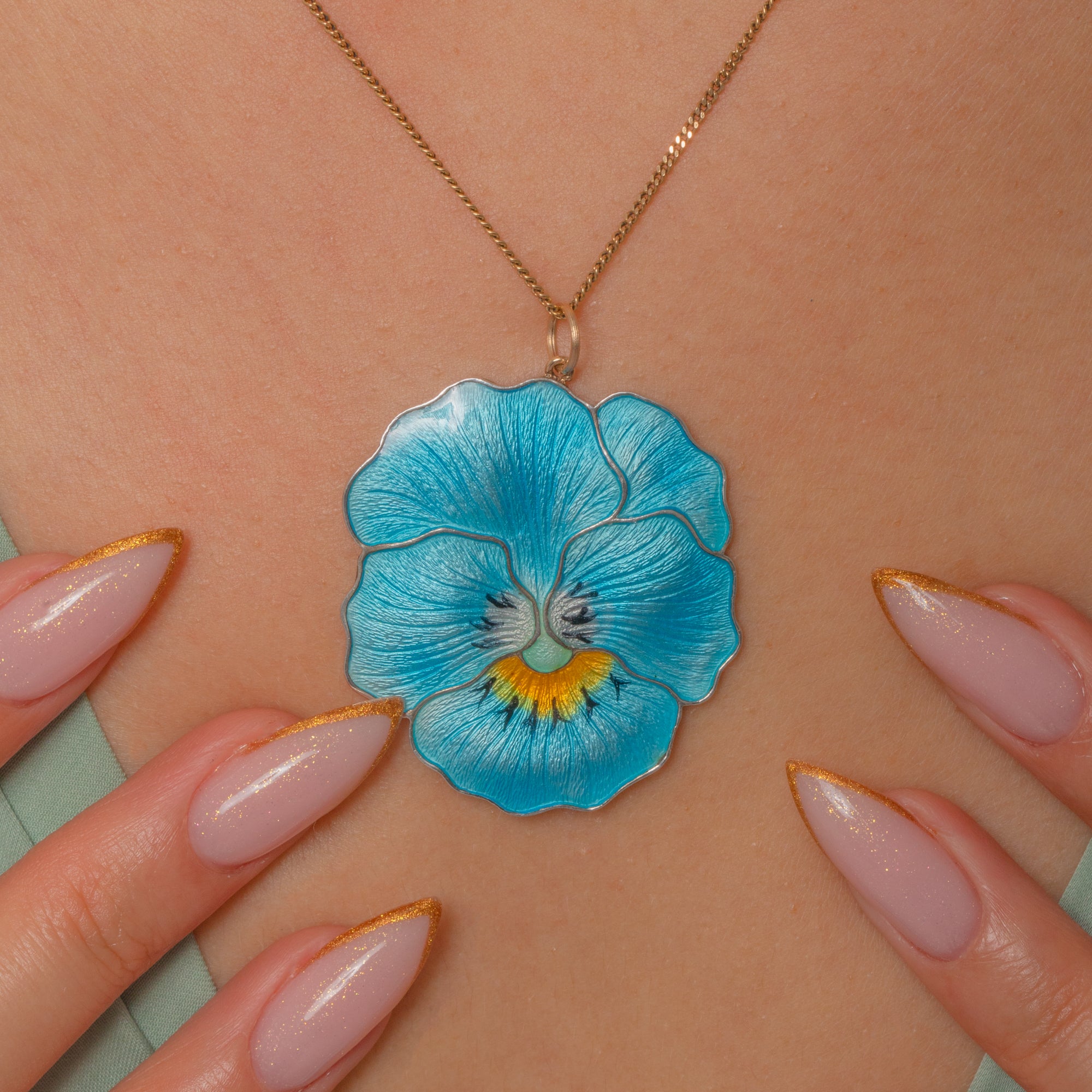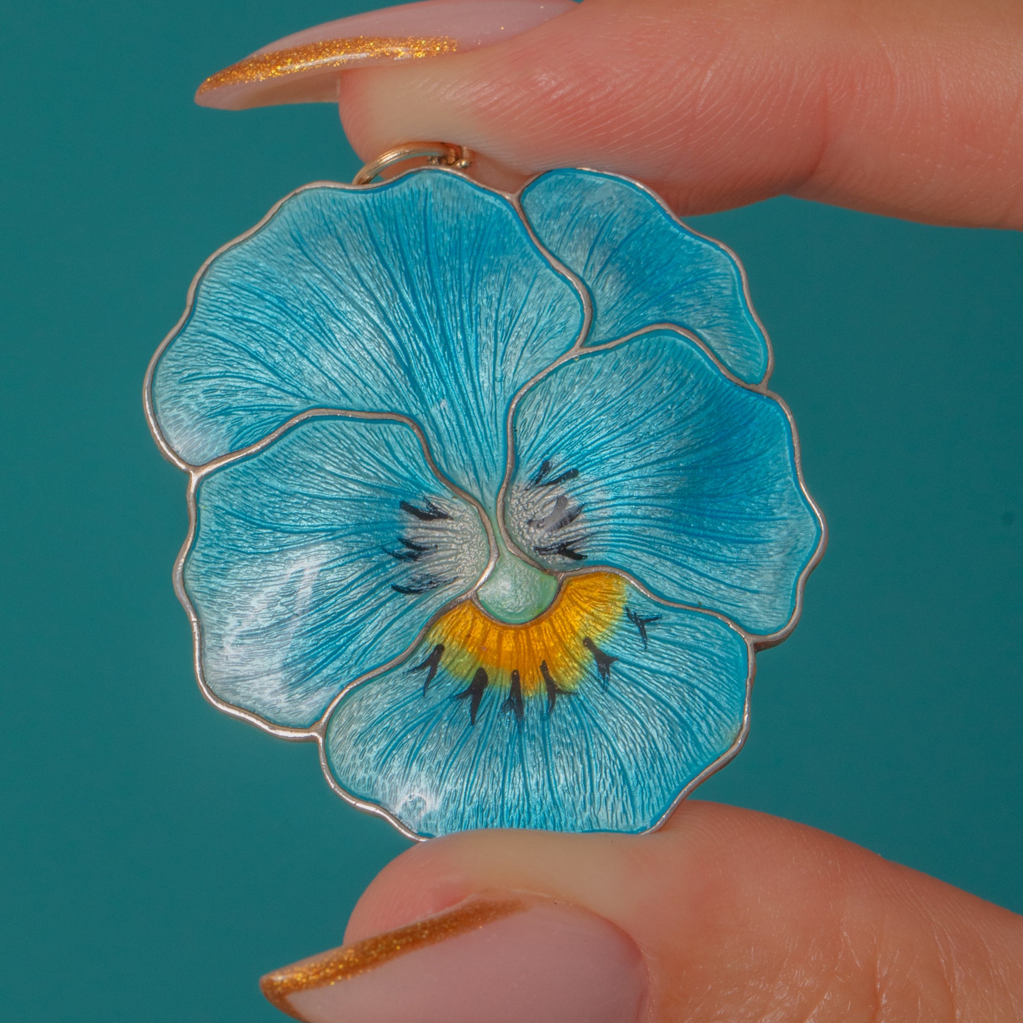 This exquisite Edwardian pendant captures the natural beauty of a pansy in radiant Guilloché Enamel. Crafted in Sterling Silver, its petals shimmer in shades of blue with delicate yellow and black detailing at the centre, beautifully showcasing the artistry of early 20th-century enamelling. The level of craftsmanship is outstanding—each fine vein of the petal is visible beneath the translucent Enamel, bringing it to life.