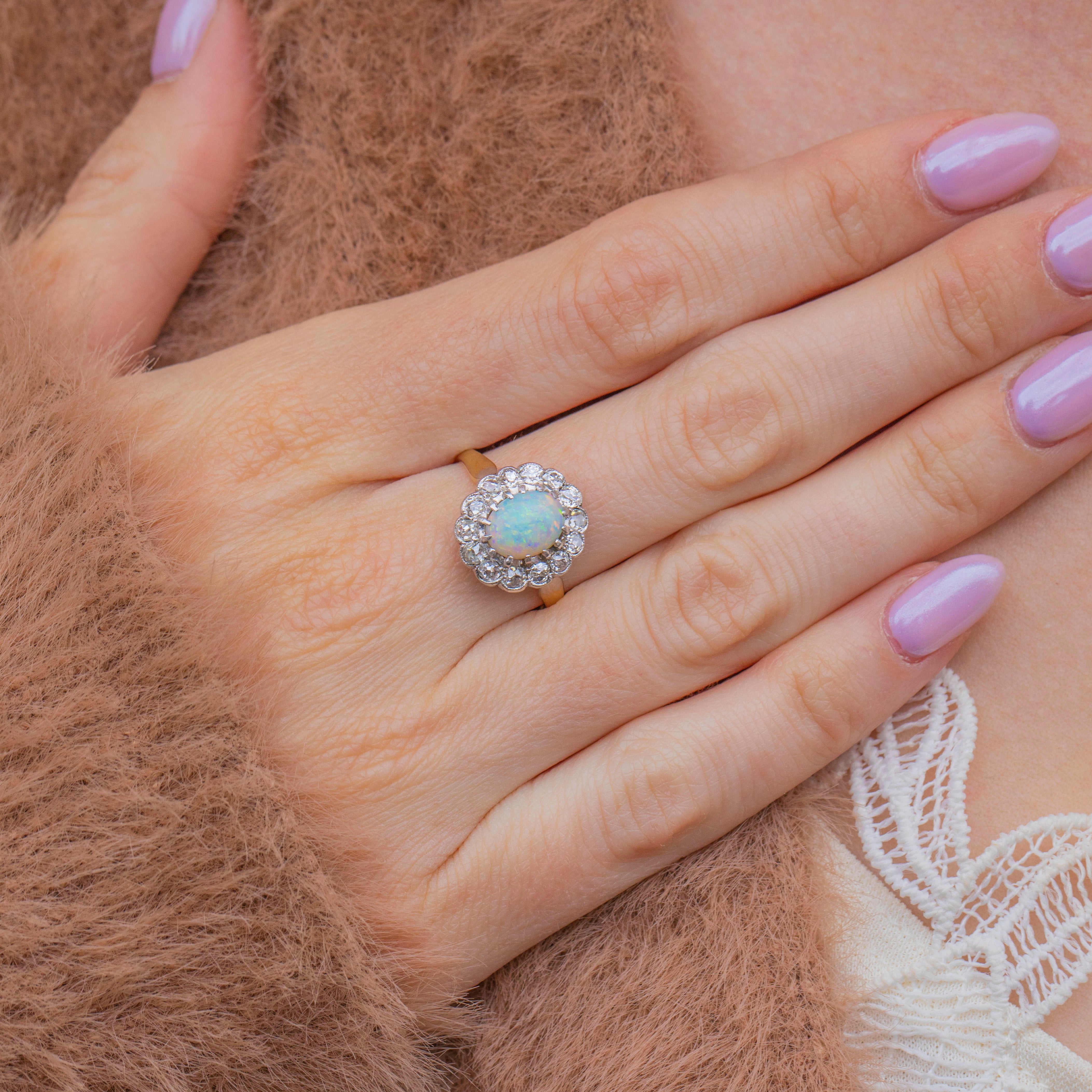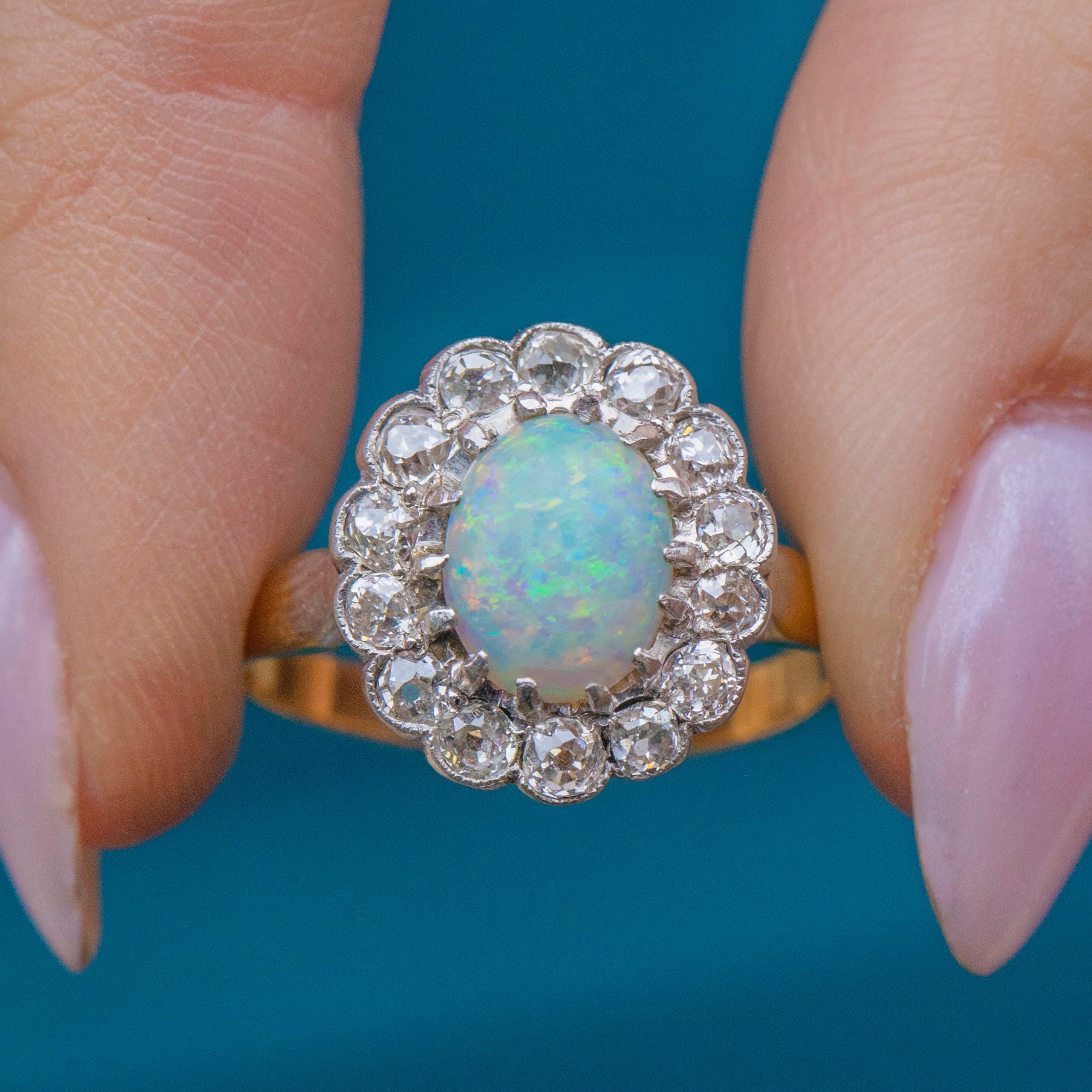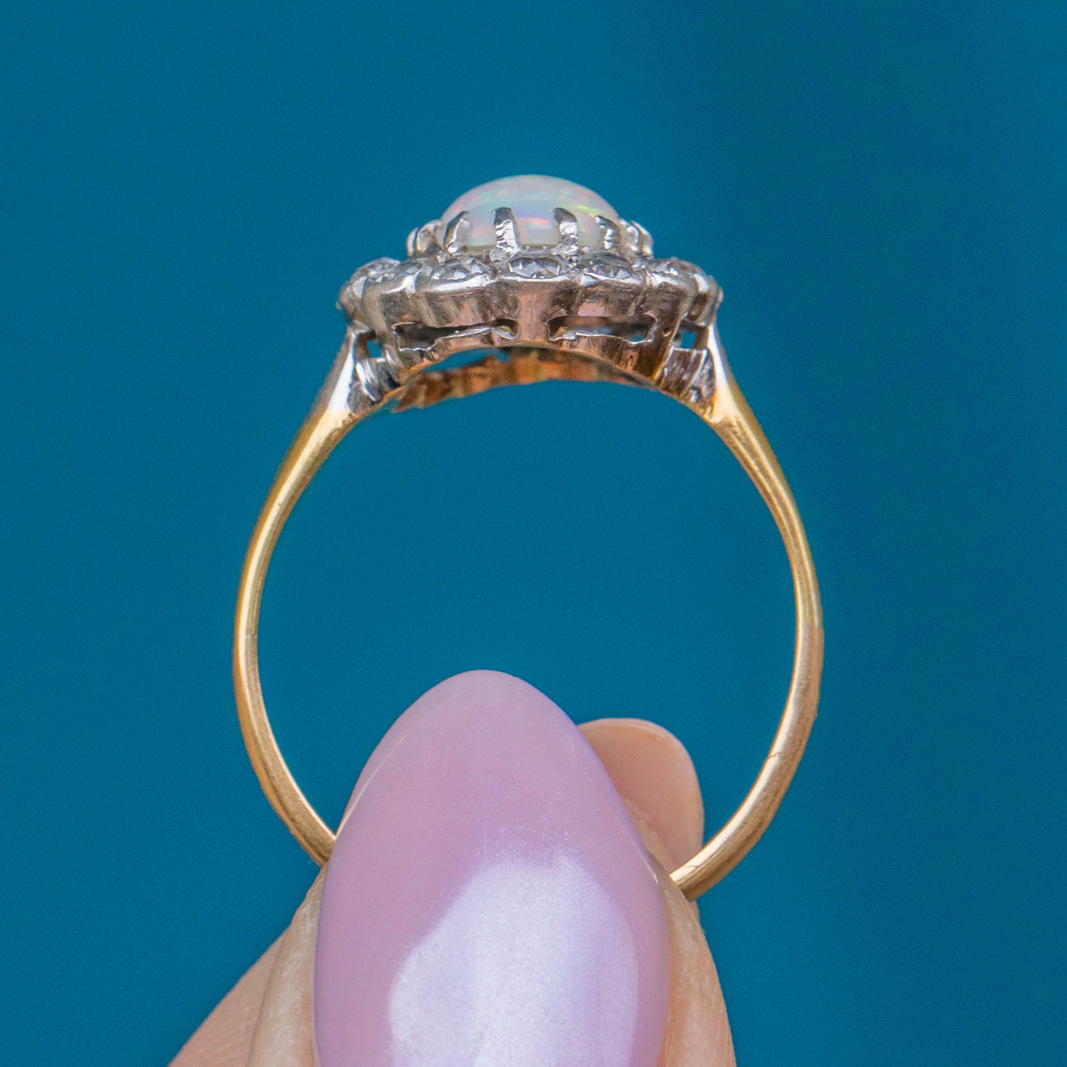 VERY GOOD-EXCELLENT. This Edwardian Opal Diamond cluster ring is in wonderful condition. Her cabochon-cut Opal is free from scuffs or chips, and although there is a slight movement within the claw setting she still sits securely. Her fourteen haloing Diamonds are all present, securely set and free from abrasions or fleabites. The rich 18ct Gold band is in wonderful condition and has kept her saturated tone well over the years. This Edwardian treasure will become your newest obsession!