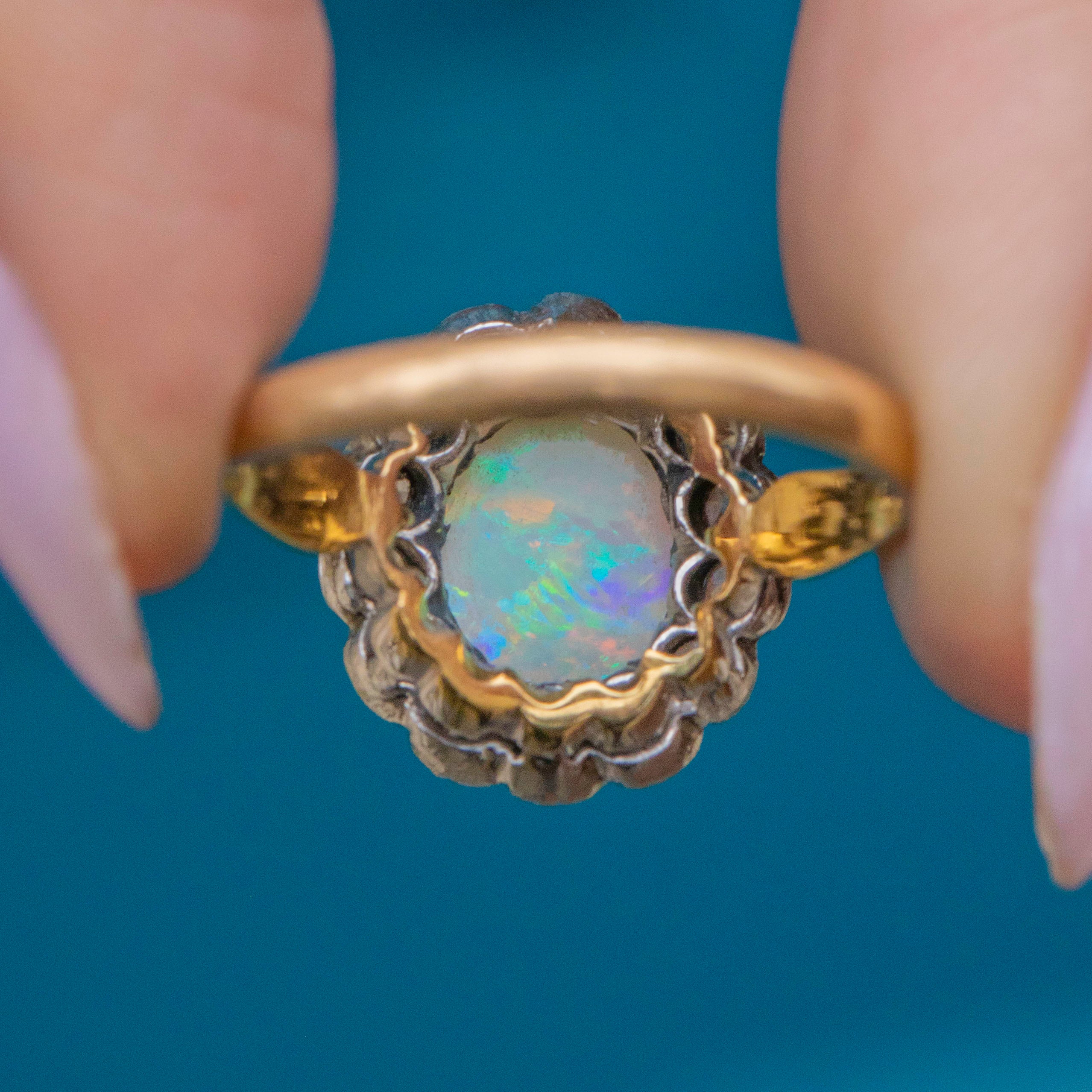 Haloed by fourteen twinkling Diamonds, with a combined carat weight of 0.40ct, this antique ring emanates beauty from every angle. Poised atop a slender, buttery 18ct Gold band, this antique Opal ring is the definition of luxury; she will exude opulence from your finger for years to come!