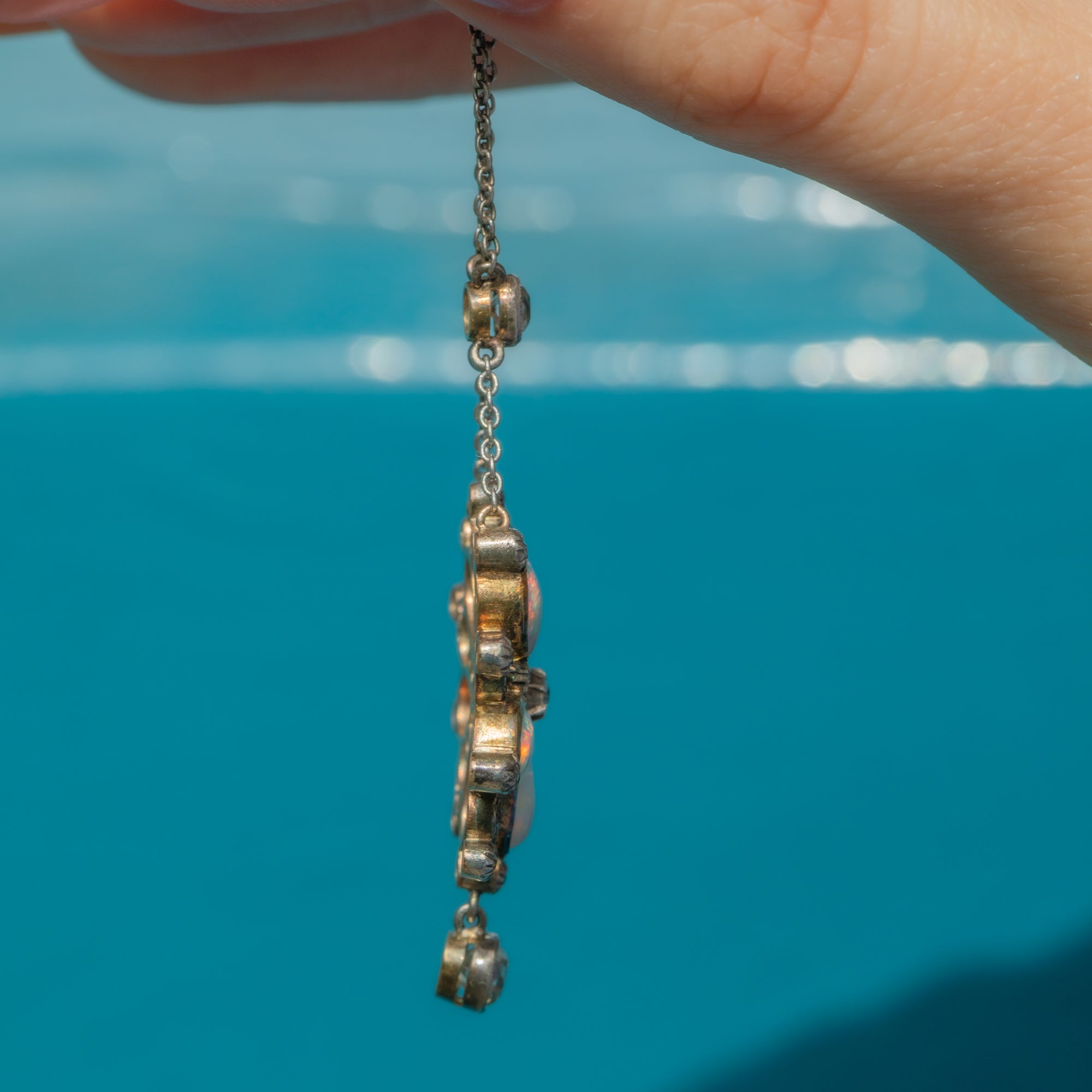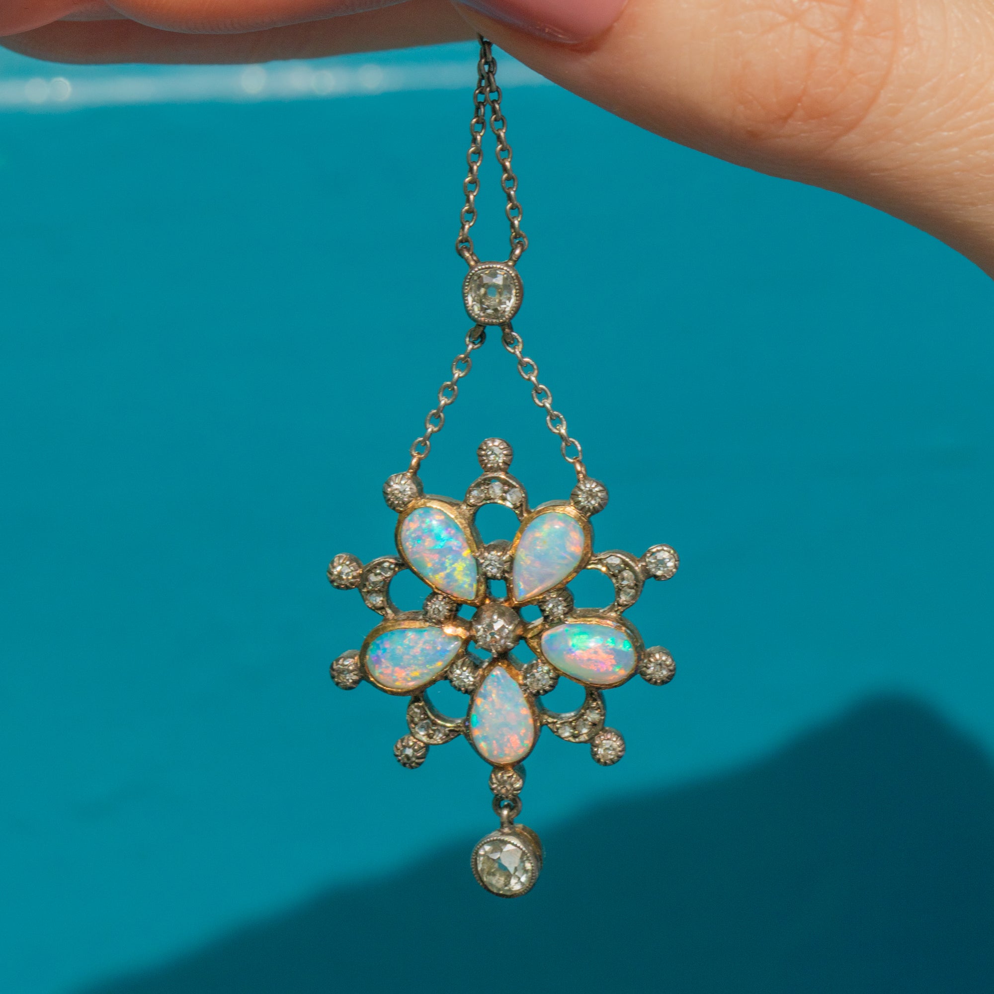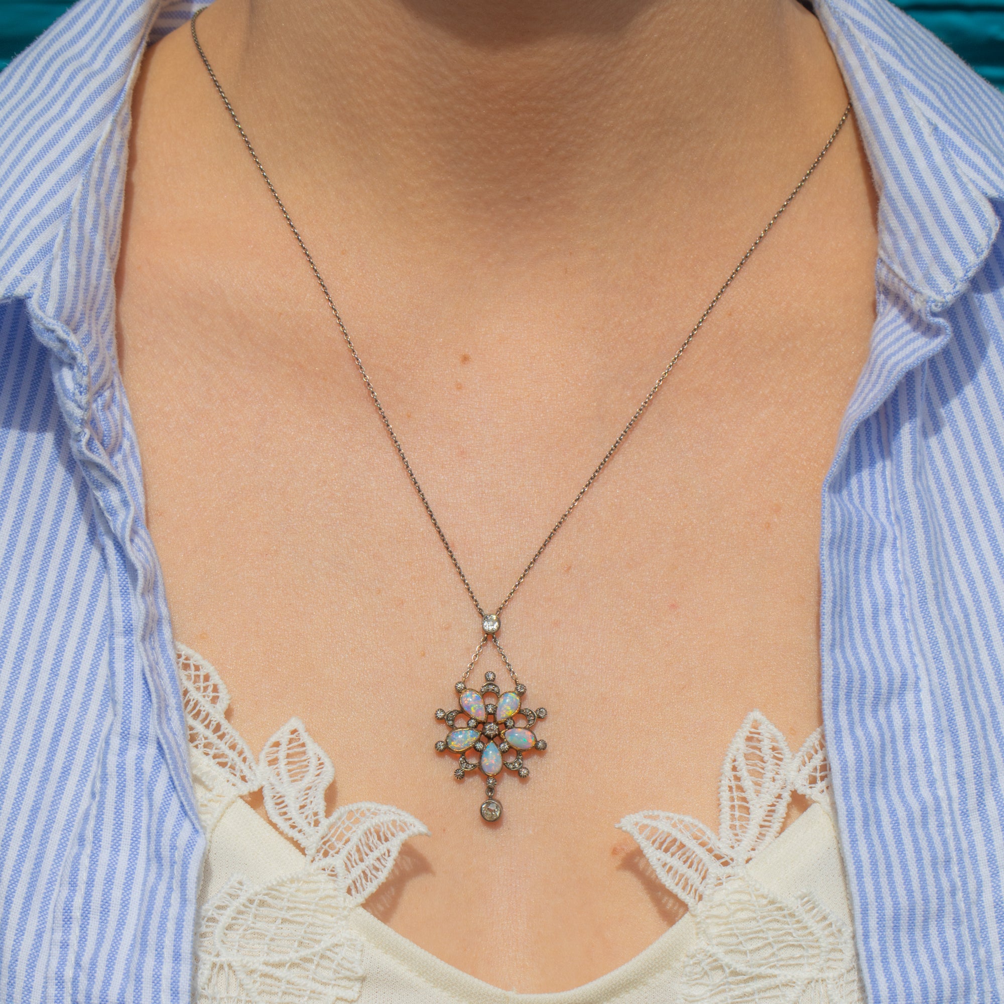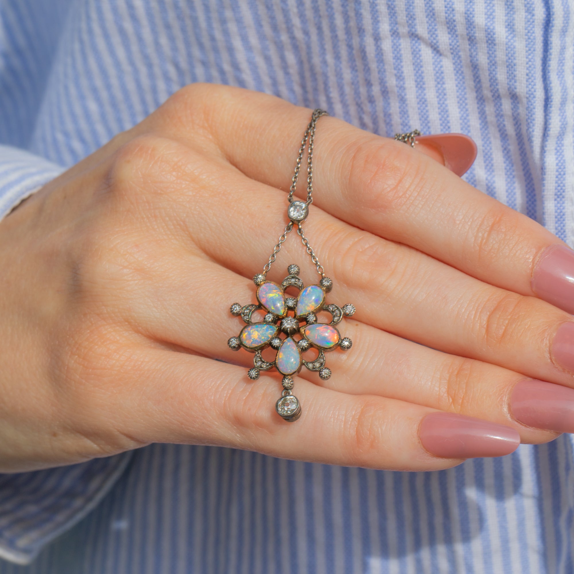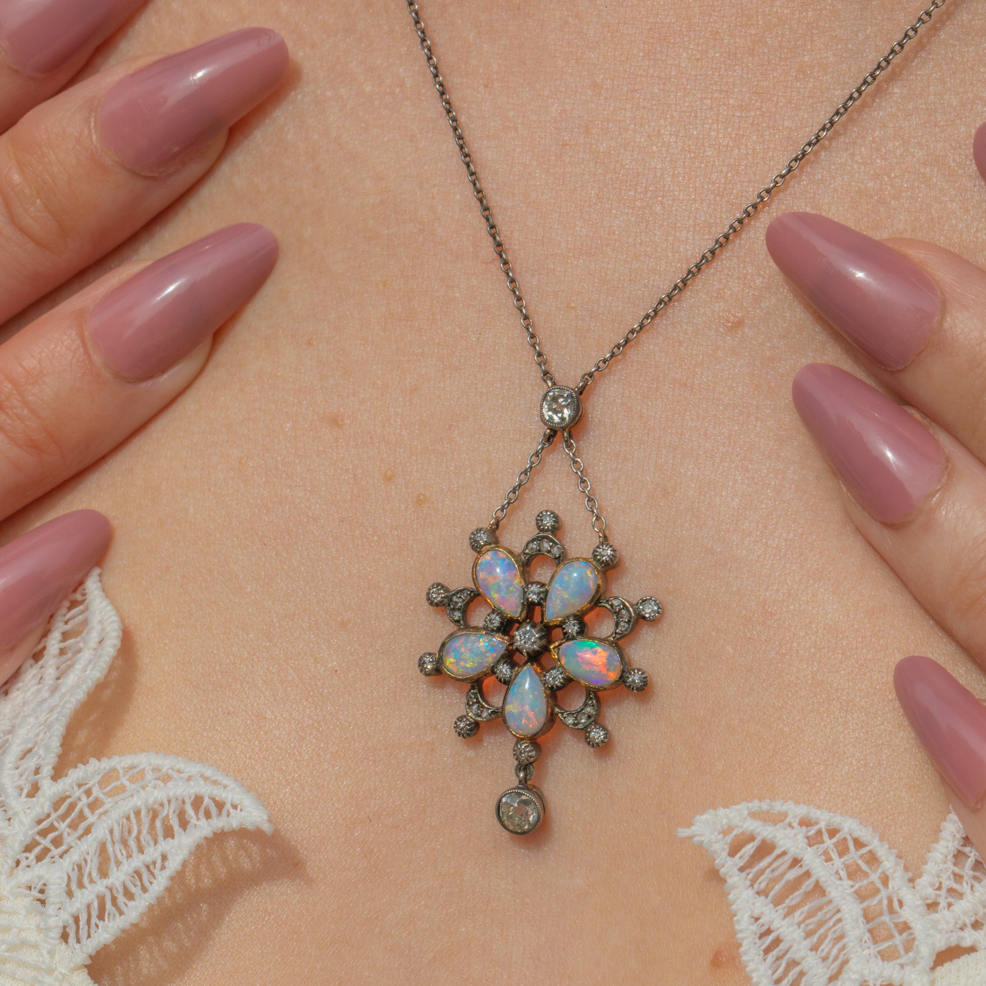 This Edwardian Opal & Diamond flower drop necklace will make an enchanting addition to your collection! Taking a feminine floral form, the pendant drop presents an impressive Opal & Diamond cluster suspended from a dainty Sterling Silver chain.