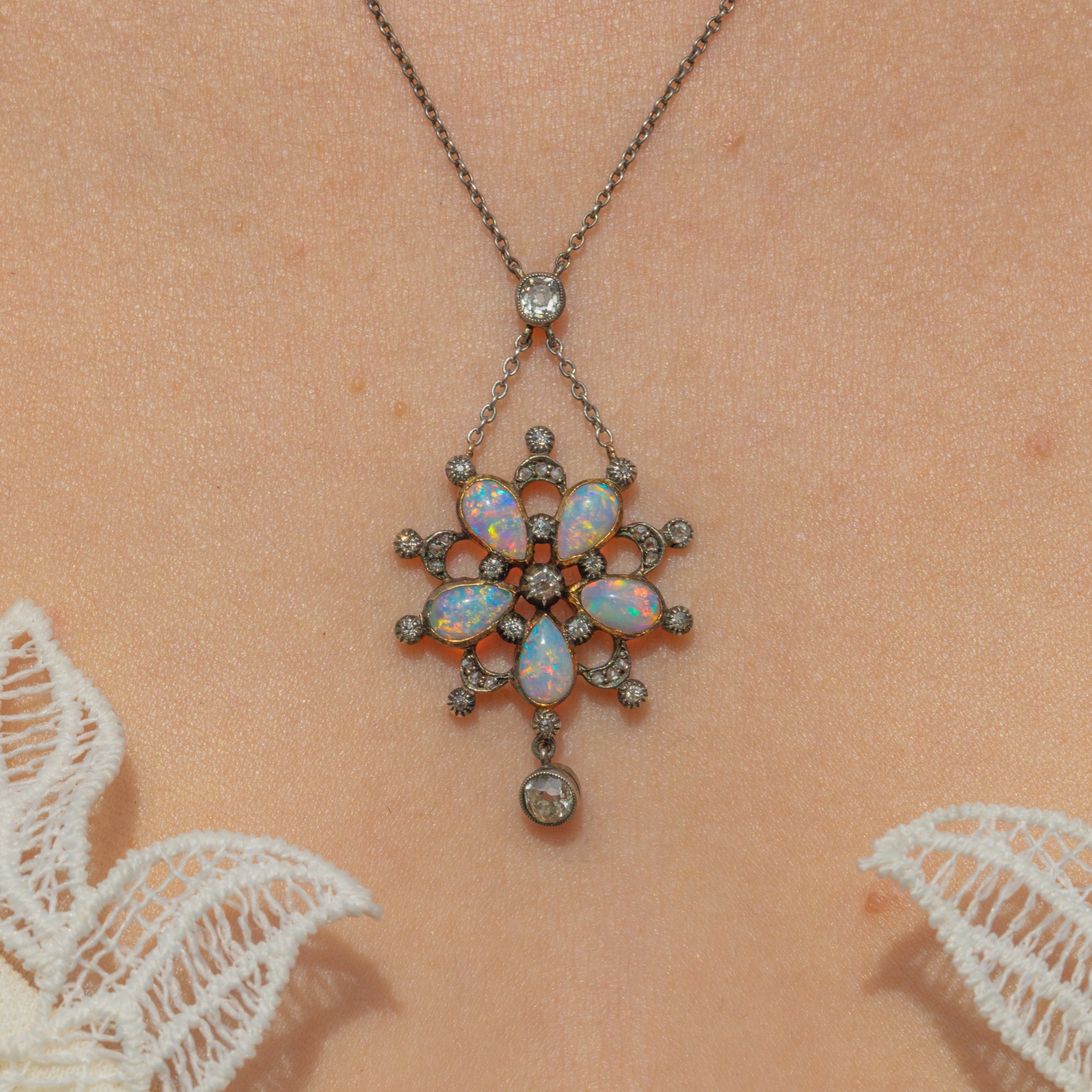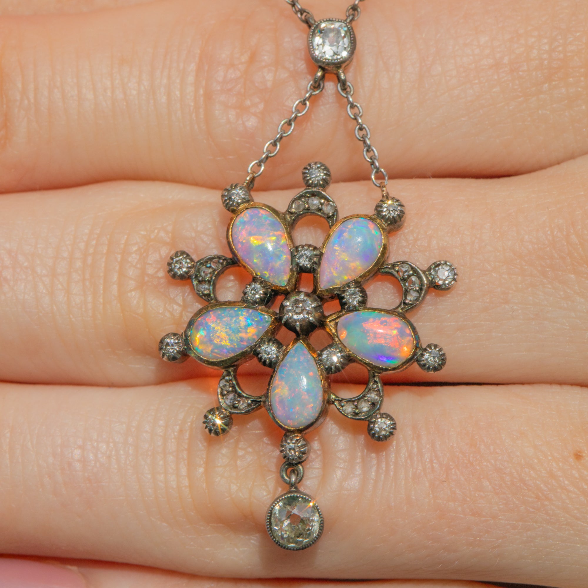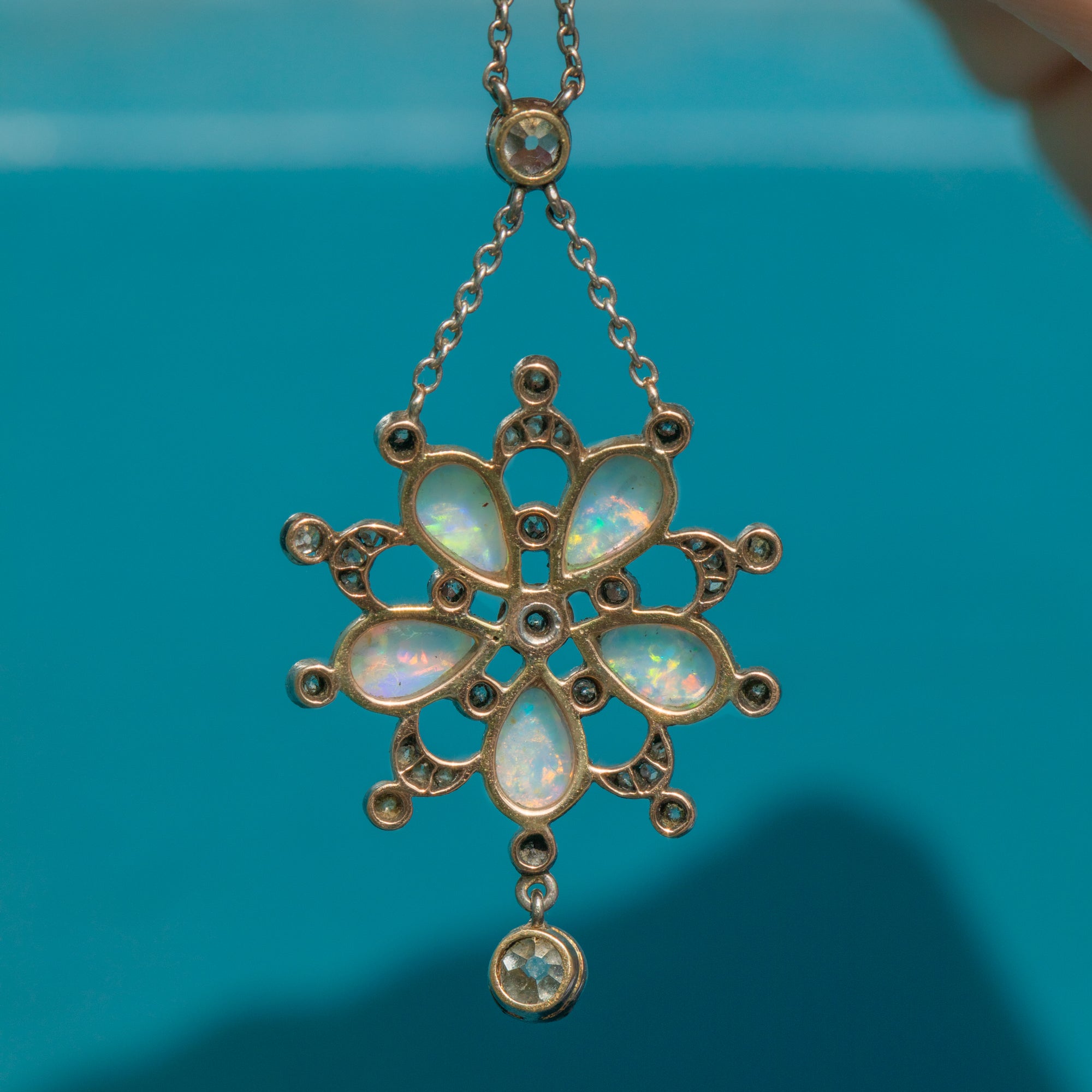 VERY GOOD TO EXCELLENT. This Edwardian Opal & Diamond flower drop necklace is in great condition. The Opal petals are securely set, with only one Opal petal possessing a small chip to the side closer to the centre (about the 9 o'clock mark). The Diamonds are a wonderful addition and sparkle prettily. The Silver chain will allow you to wear this piece beautifully for decades more.