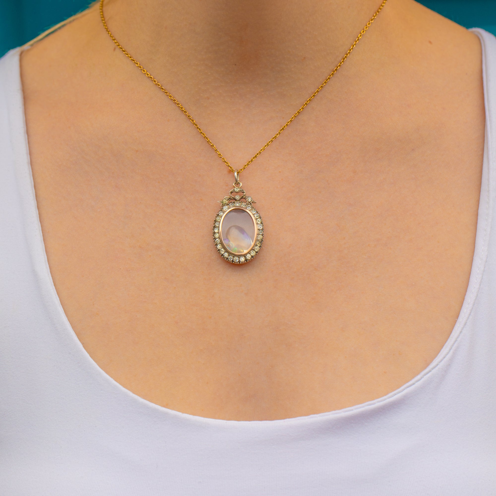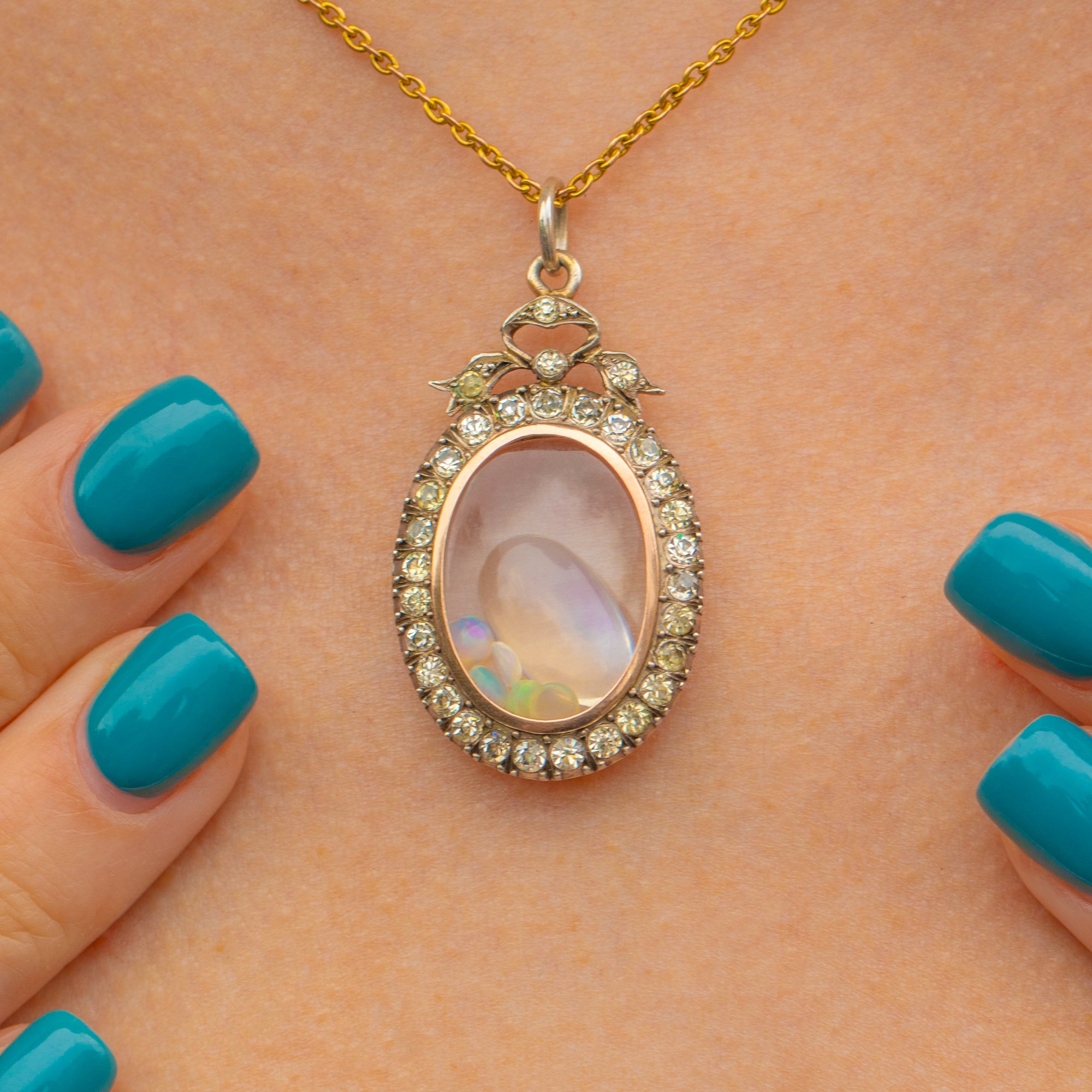With a party of gems nestled inside her glass, the iridescent Opals and luminous Moonstones look sublime when they catch in the light. We adore how her Diamond paste sparkles from afar, she is the prettiest locket for your antique jewellery collection!