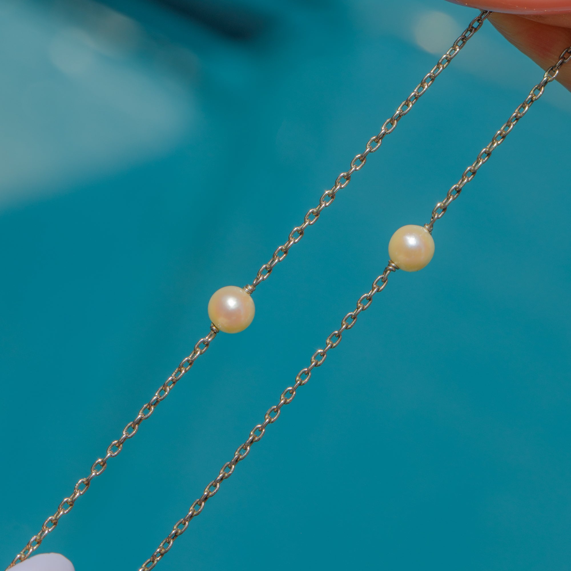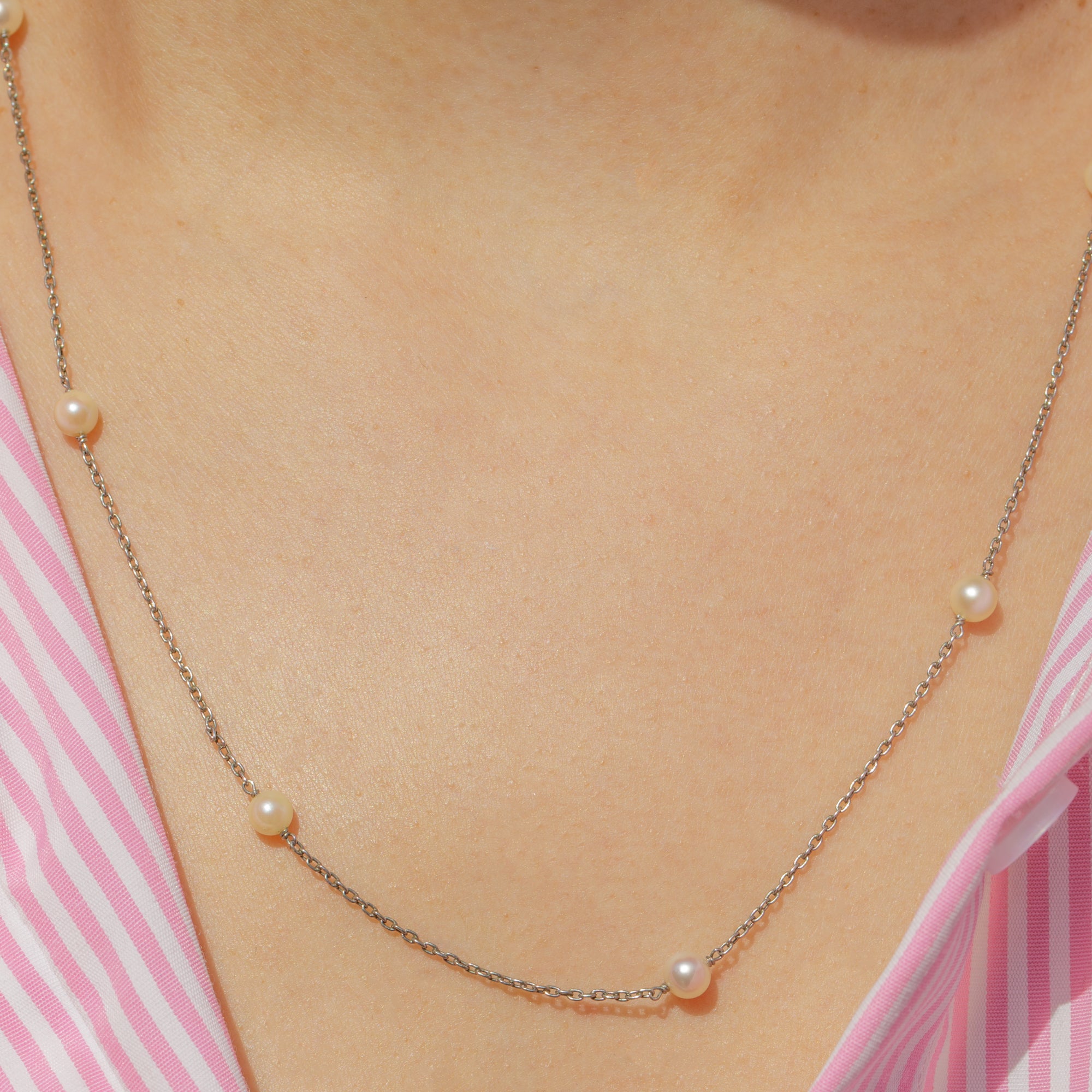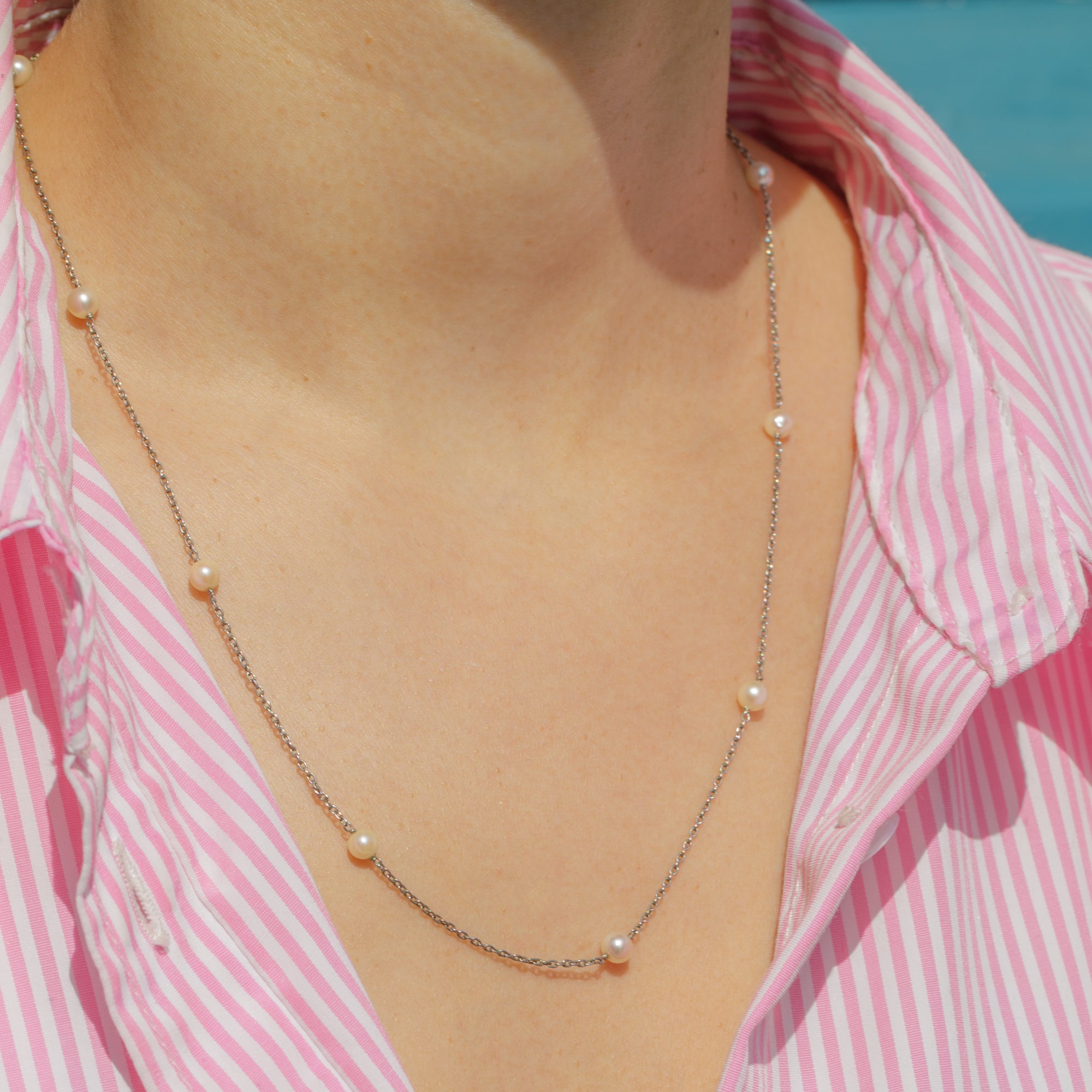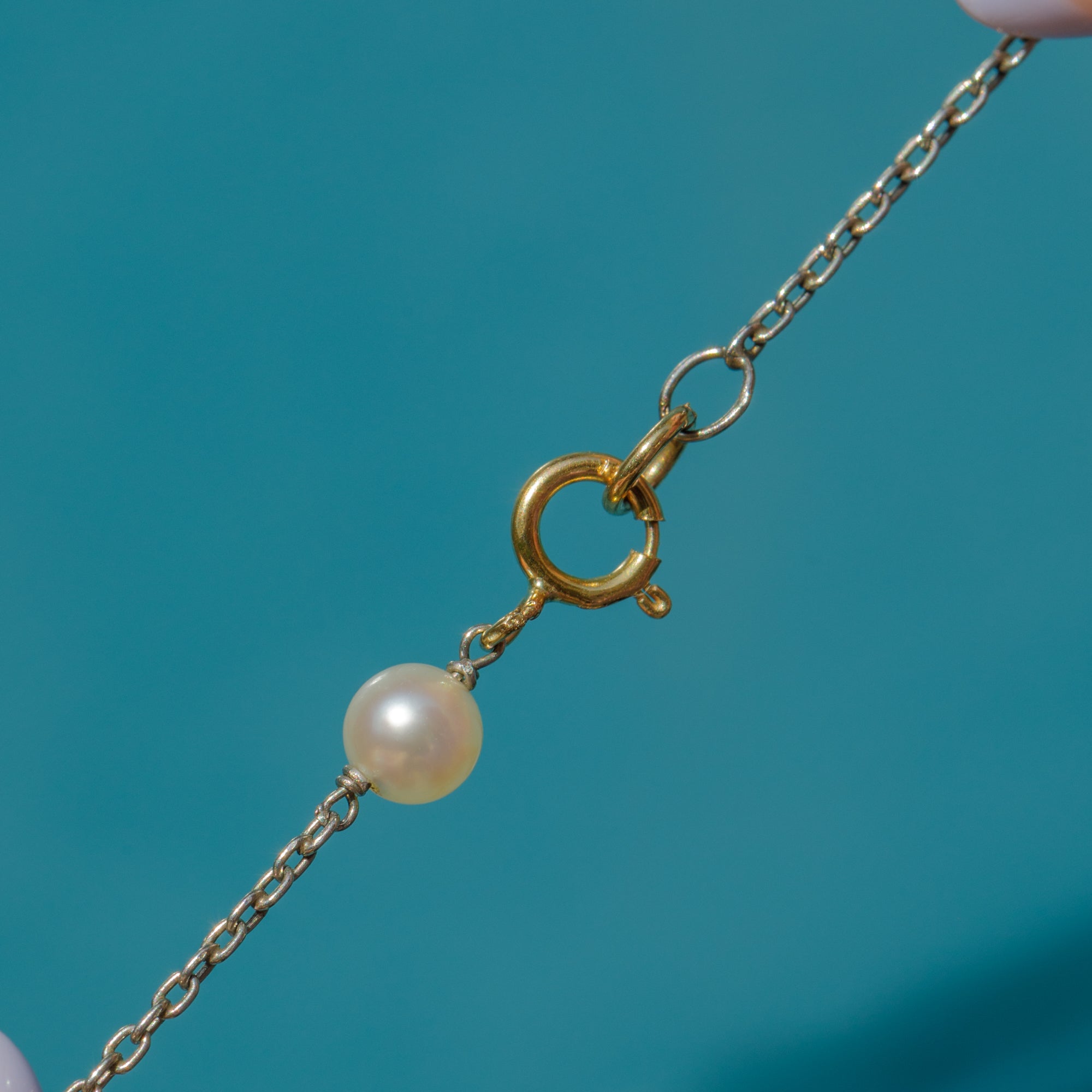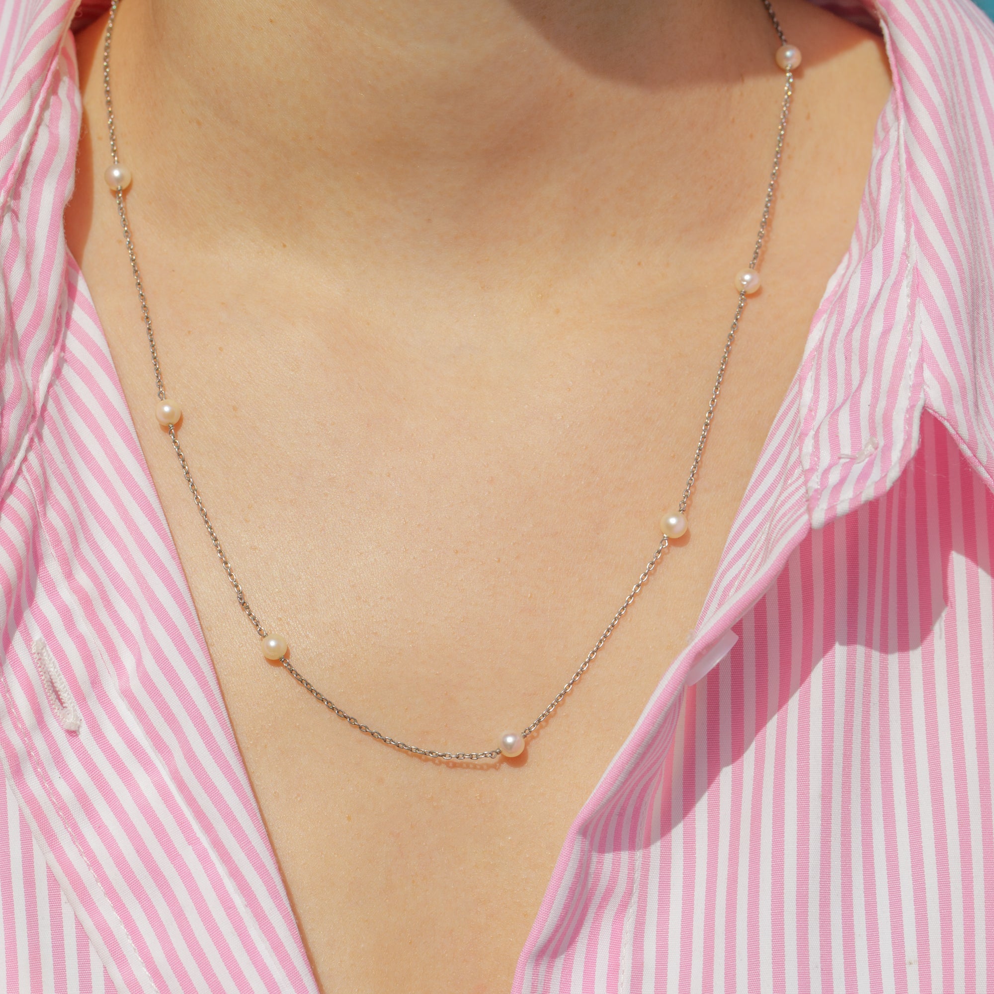 Edwardian Platinum Pearl Station Necklace with 18ct Gold Bolt Ring Clasp