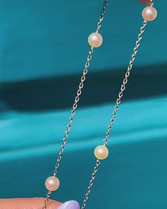 This Edwardian Platinum Pearl station necklace will bring undeniable elegance to your repertoire! The Platinum links are dainty and lustrous, giving the chain a delicate appeal, and are decorated with Pearl "stations" adding an iridescent shimmer.