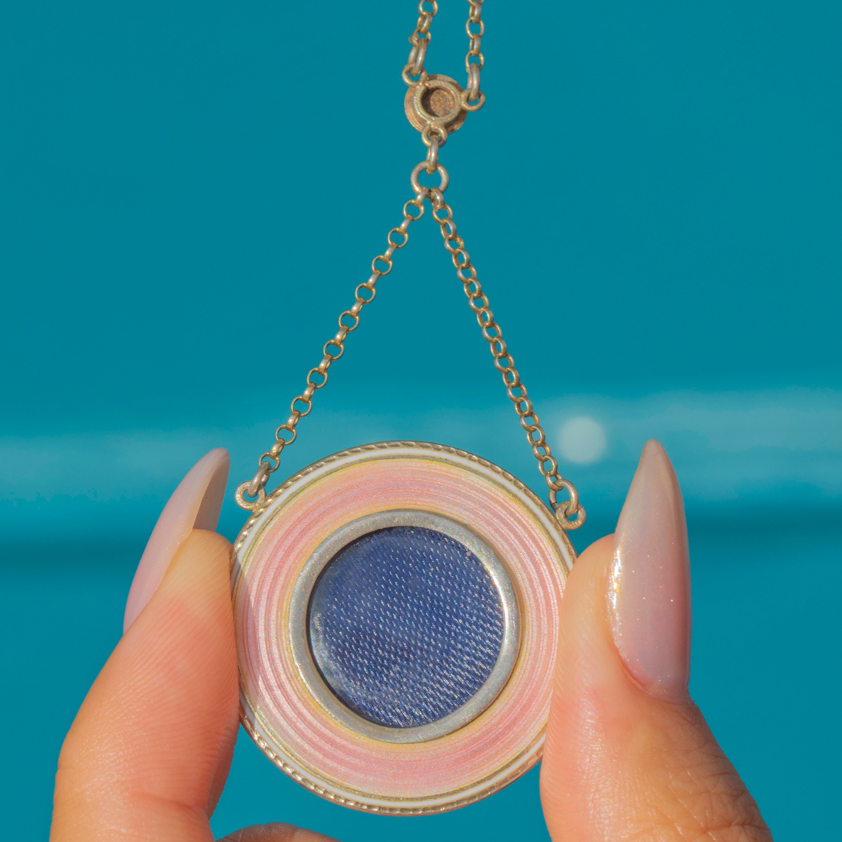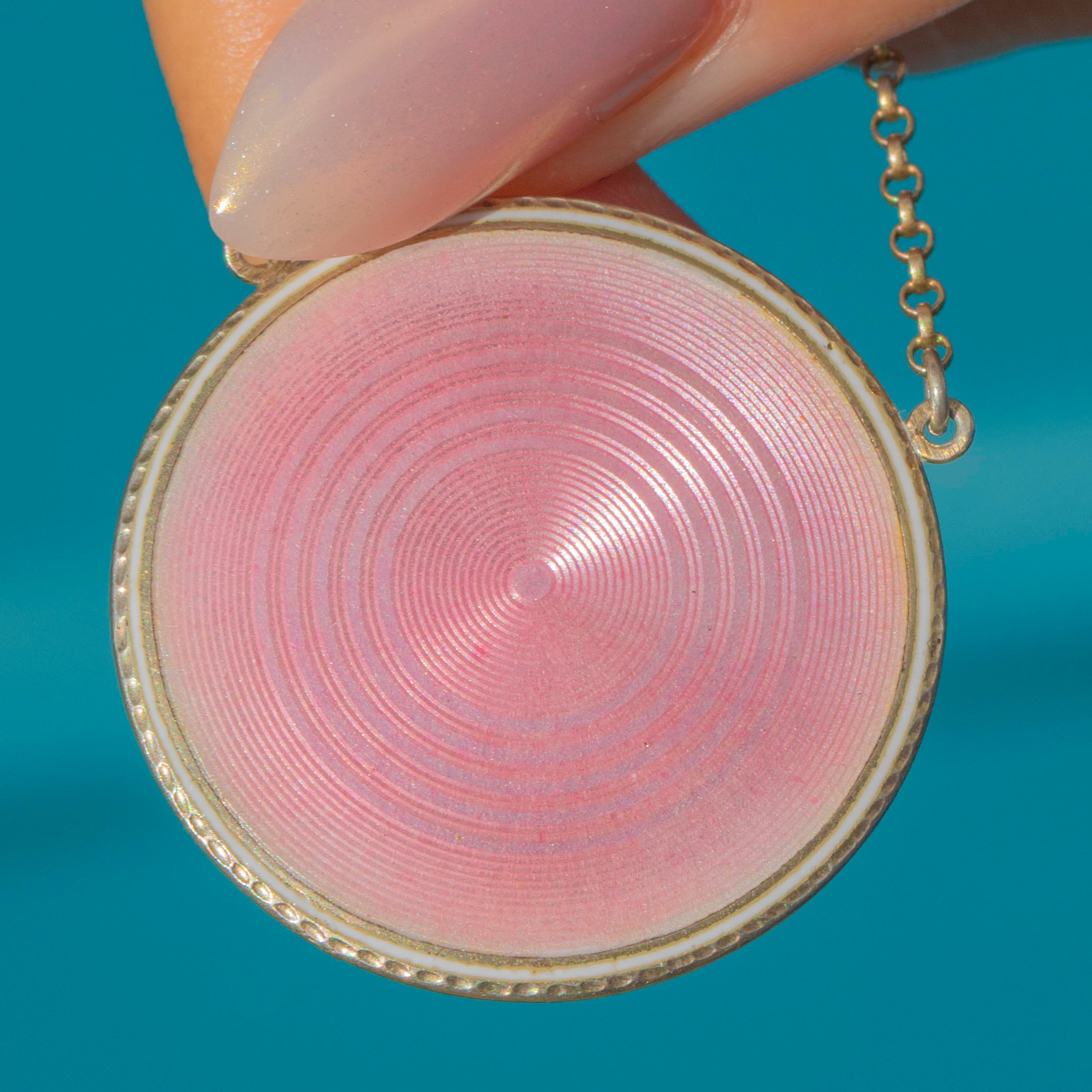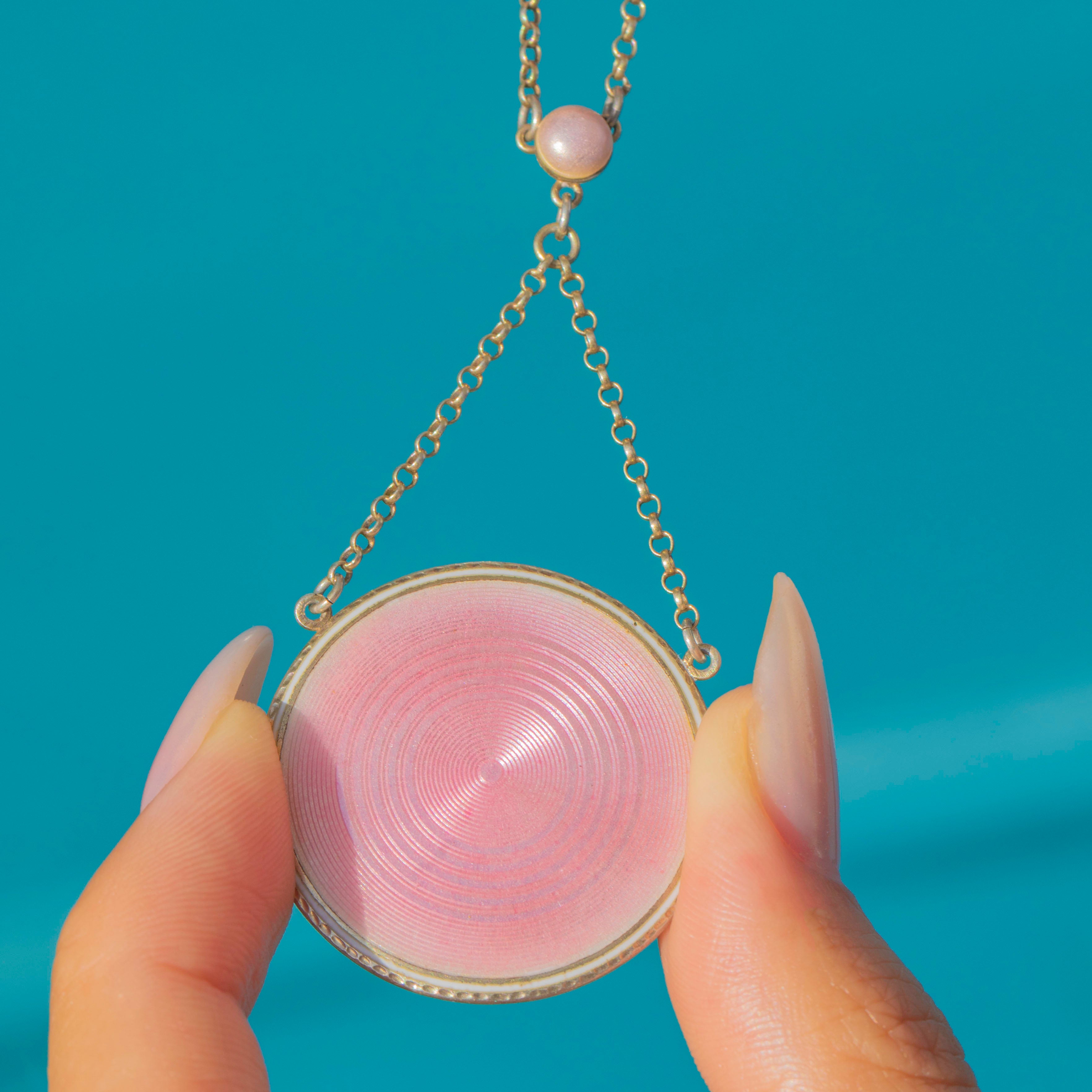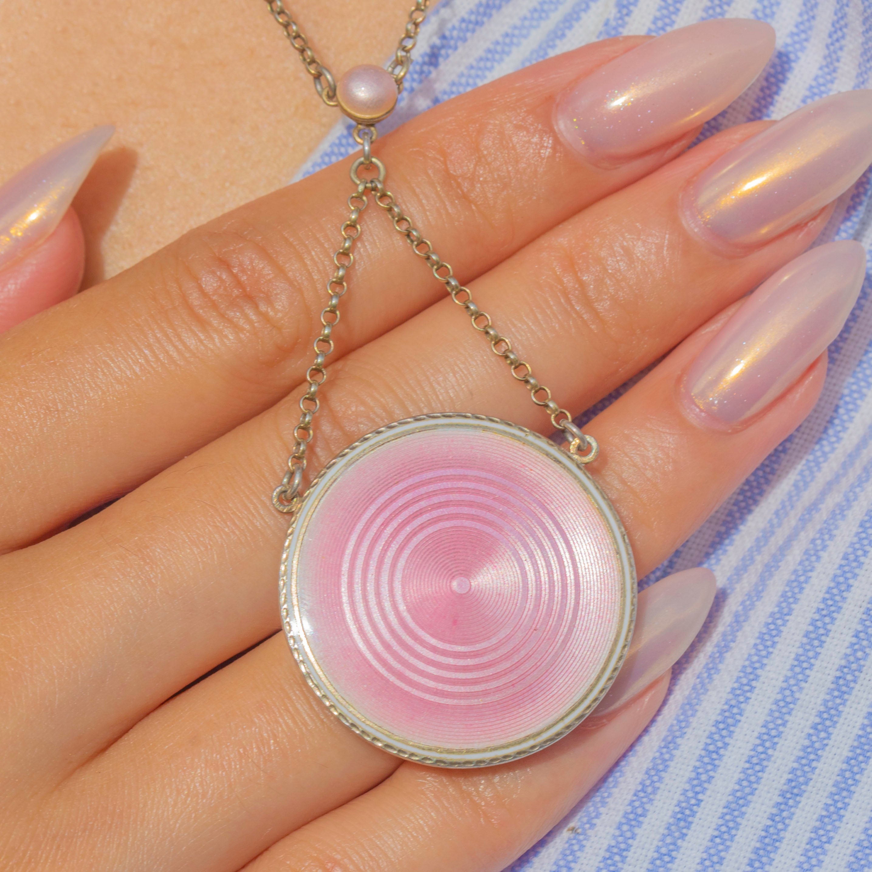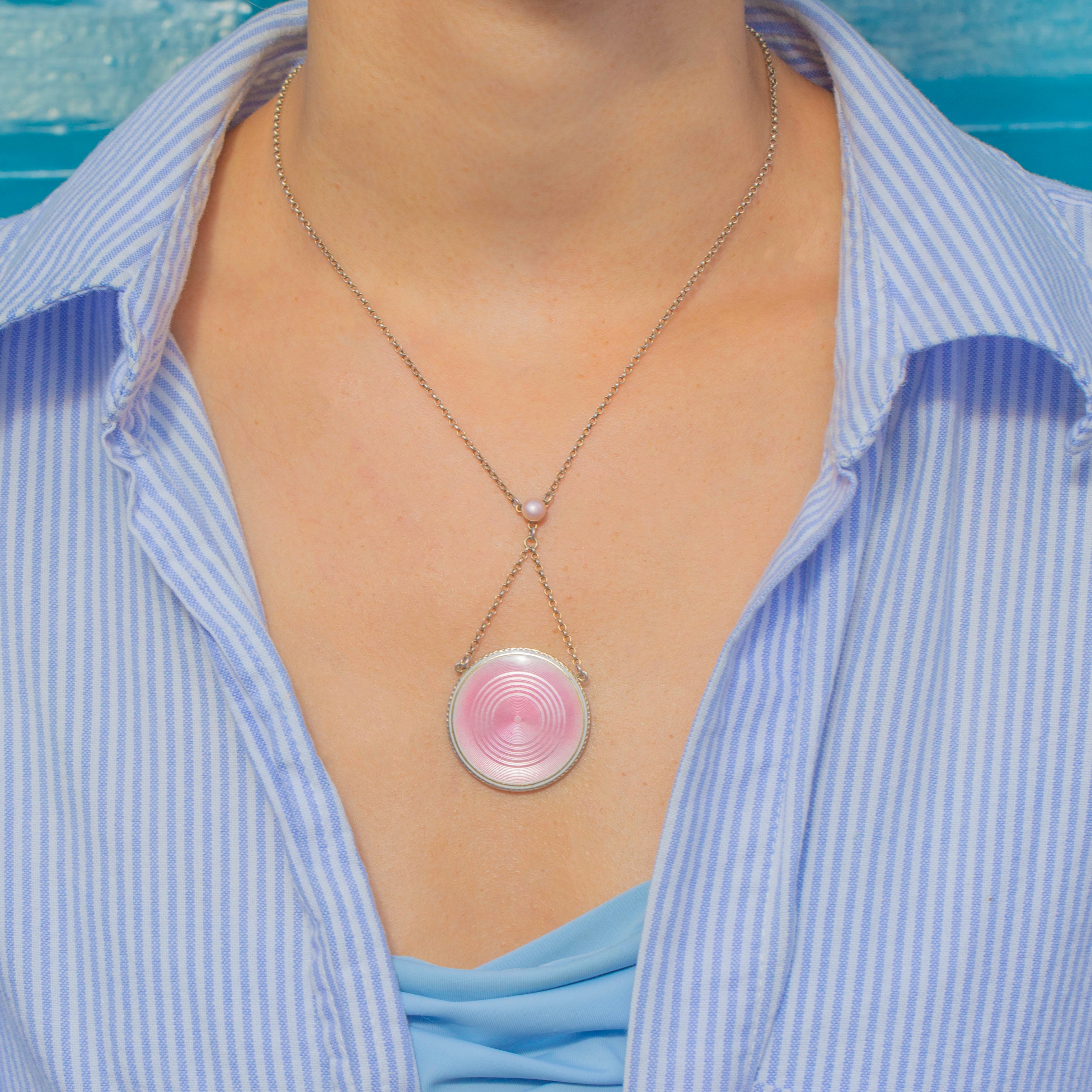 This elegant Edwardian pendant pairs soft Pink Enamel with cool-toned Silver for a clean, feminine look. The circular Guilloché Enamel face shows crisp concentric rings and sits within a neat Silver border for a refined finish.