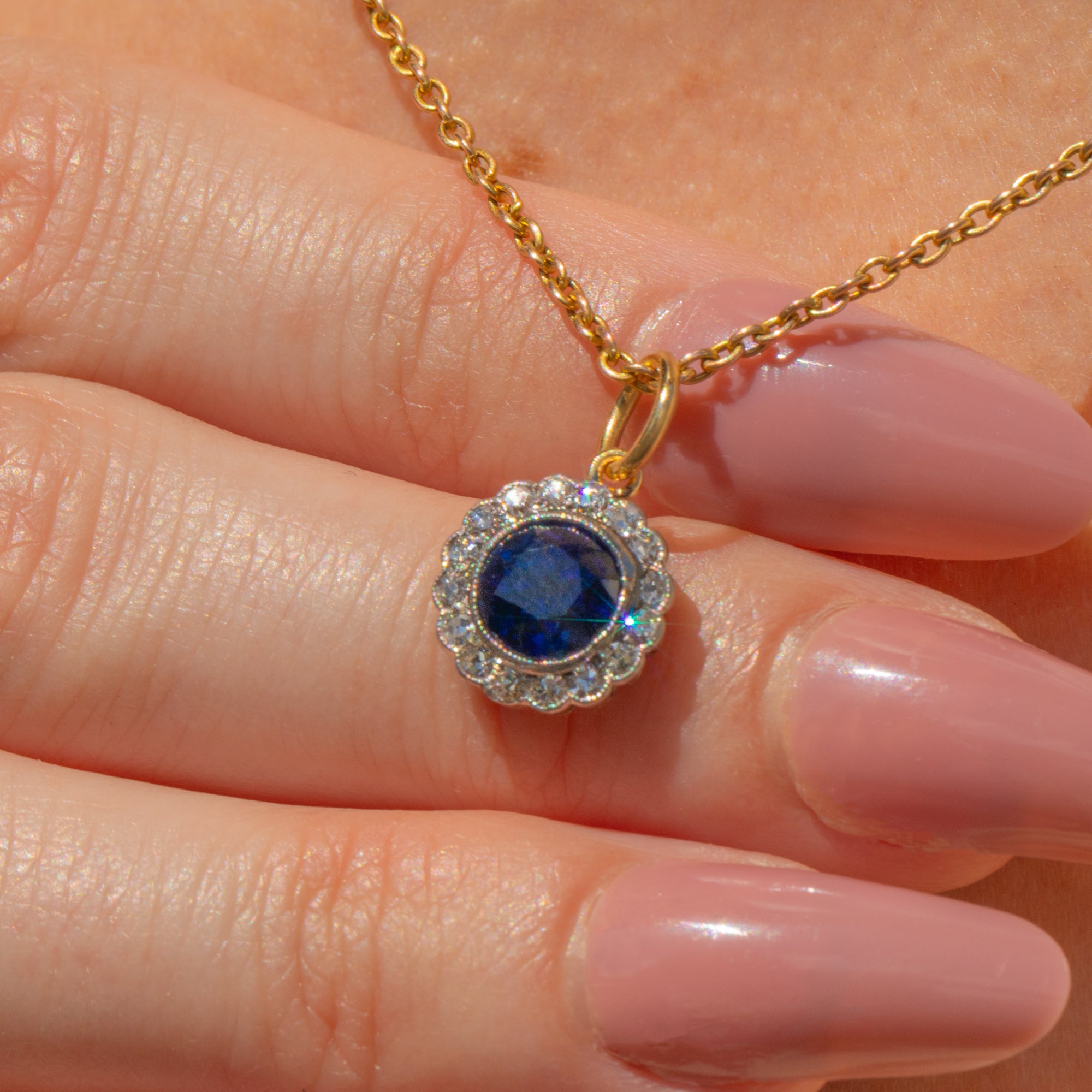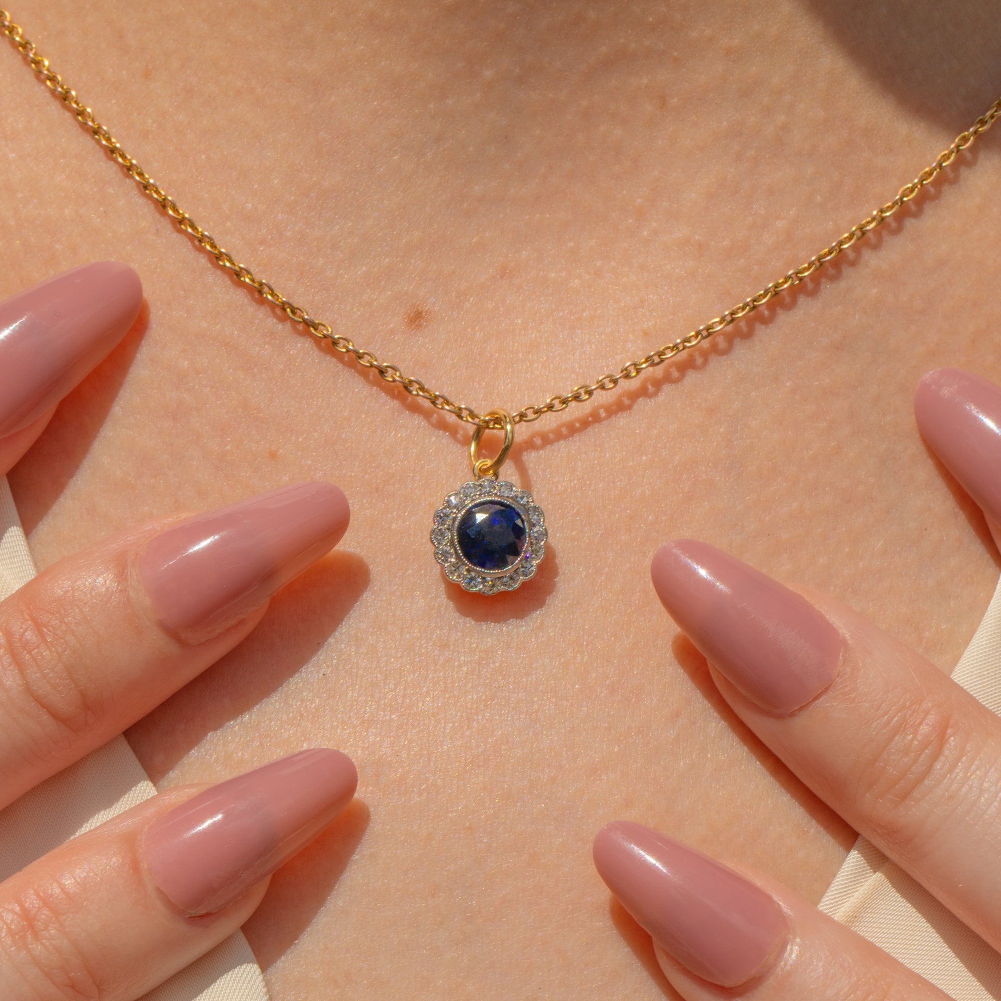 We are in awe of this Edwardian Sapphire Diamond cluster charm! The most splendorous flower we have laid eyes on, she boasts a deep midnight 1.00ct Sapphire with eye-catching glistens, surrounded by Diamond petals creating a striking contrast.
