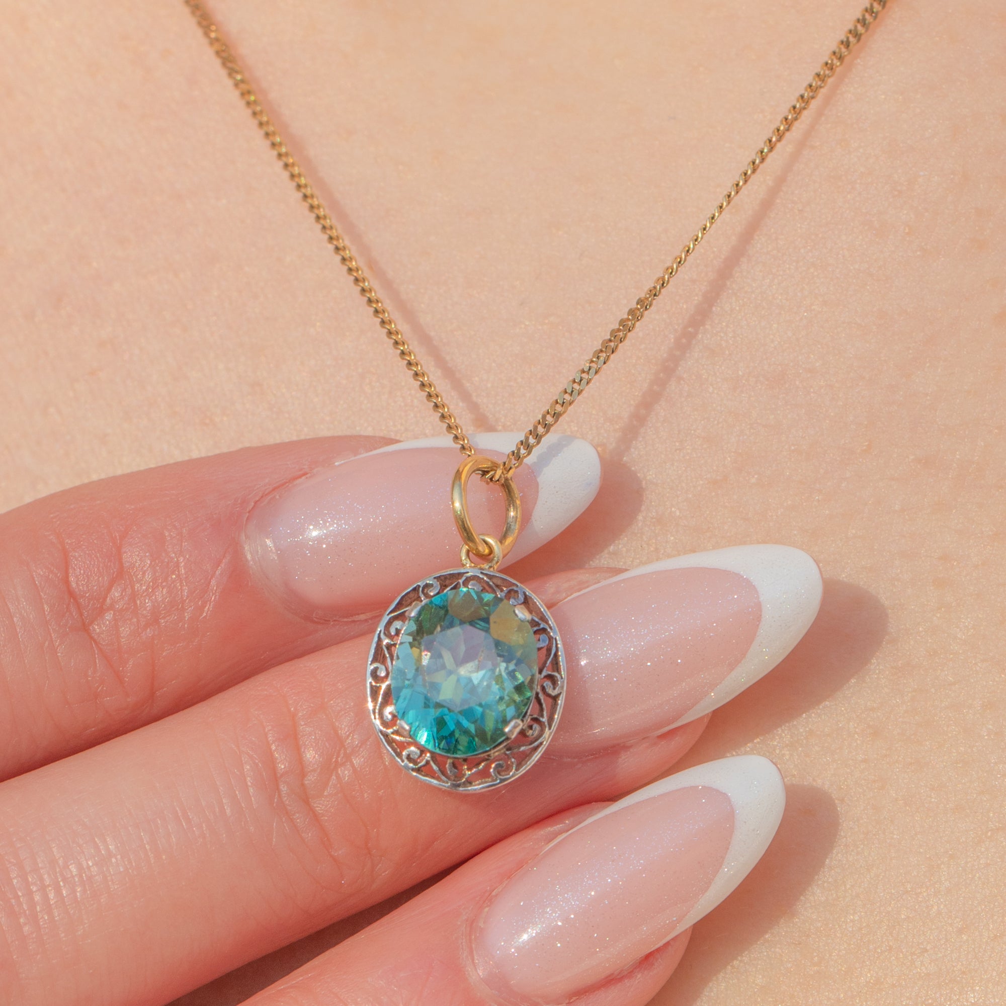 In her centre sits a radiant cool azure Zircon, faceted beautifully and glimmering in the light. She is displayed within glossy Silver filigree settings, providing a wonderful texture and depth.