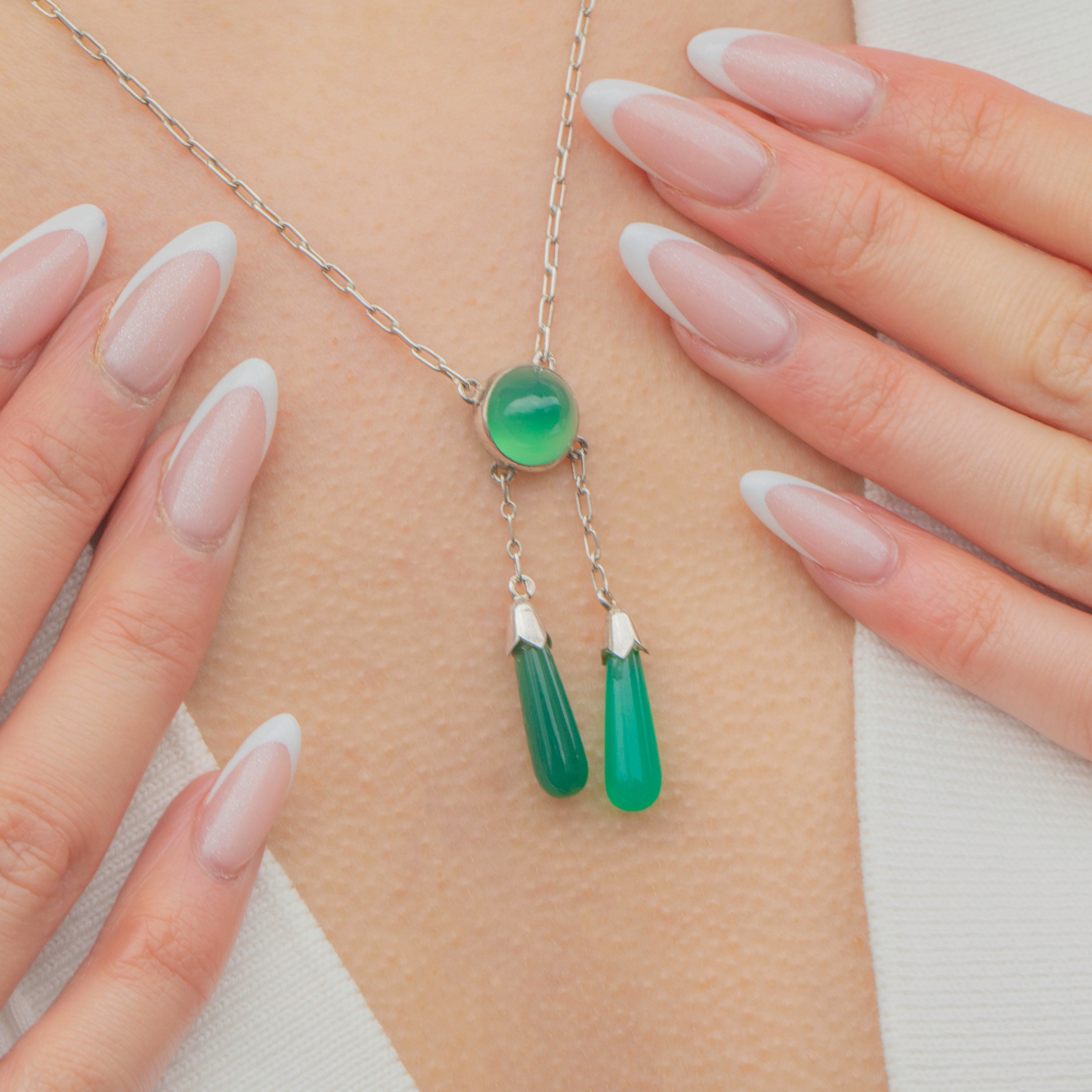 VERY GOOD-EXCELLENT: This Edwardian Silver Chrysoprase negligee necklace is in lovely condition. The Chrysoprase is perfectly smooth, with no chips or scuffs, and are secure within their settings. The Silver settings show some signs of age-related wear, which is noticeable under close inspection and does not impact the integrity of the piece. The links are robust and each component is securely affixed, allowing you to wear this antique Chrysoprase necklace with utmost confidence!