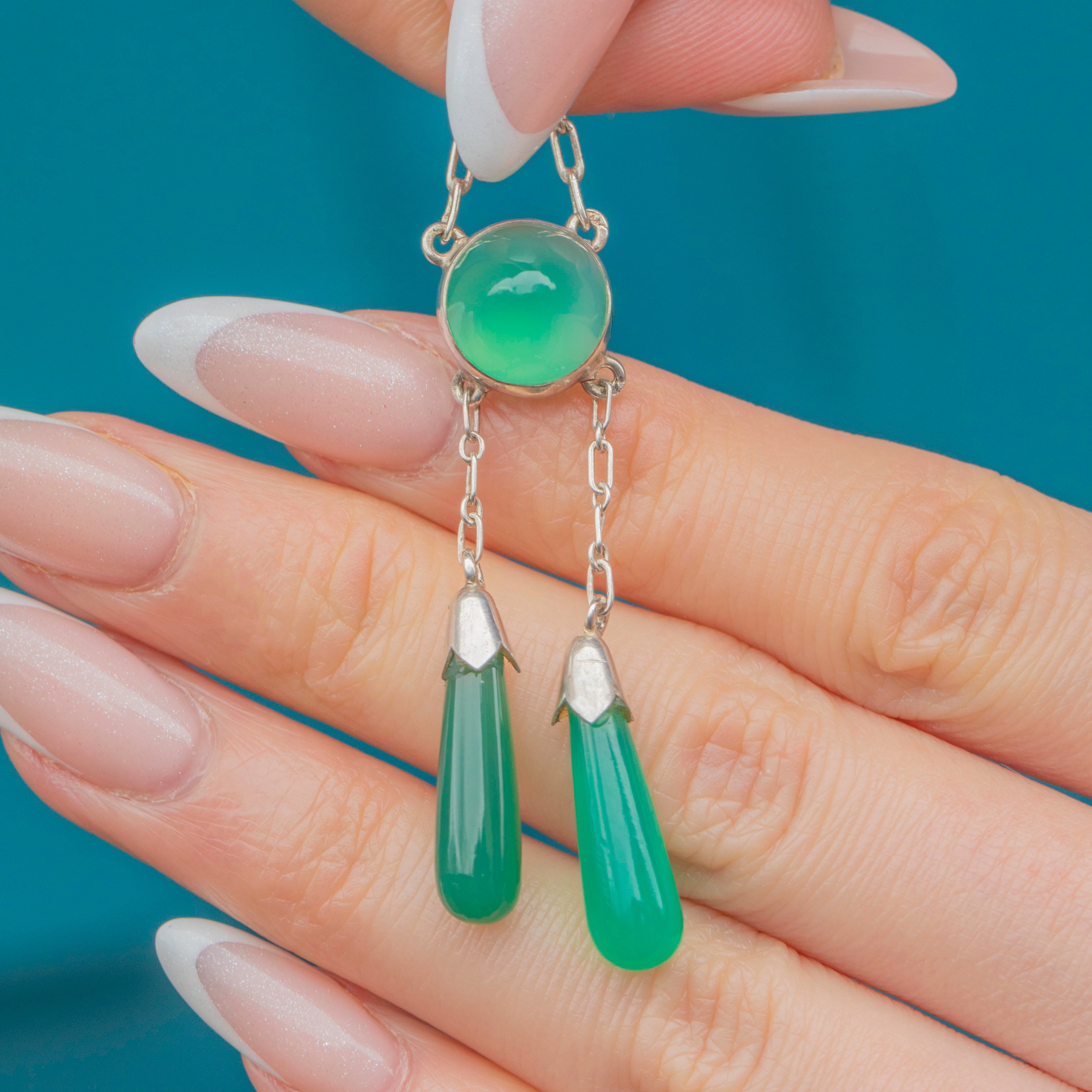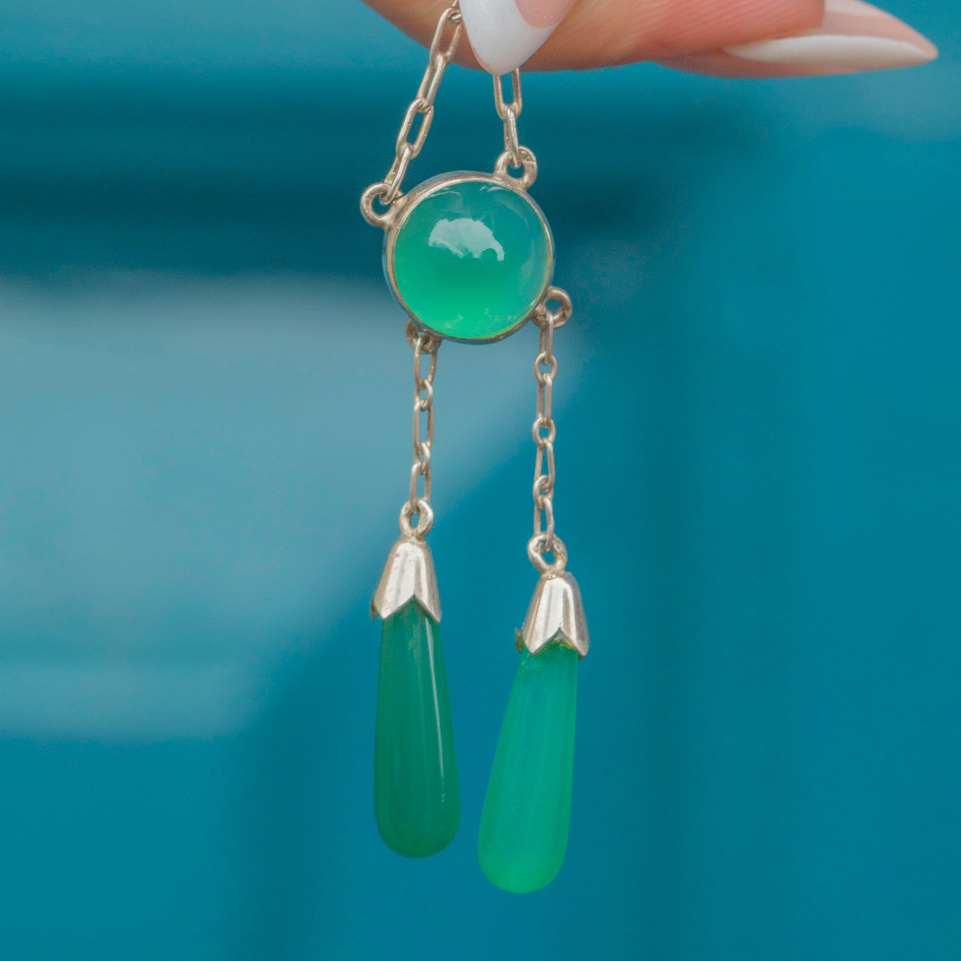 The high-domed Chrysoprase cabochon elegantly suspends two Chrysoprase torpedo drops in a classic negligee design, providing lovely movement and creating a striking silhouette that glows in the light!