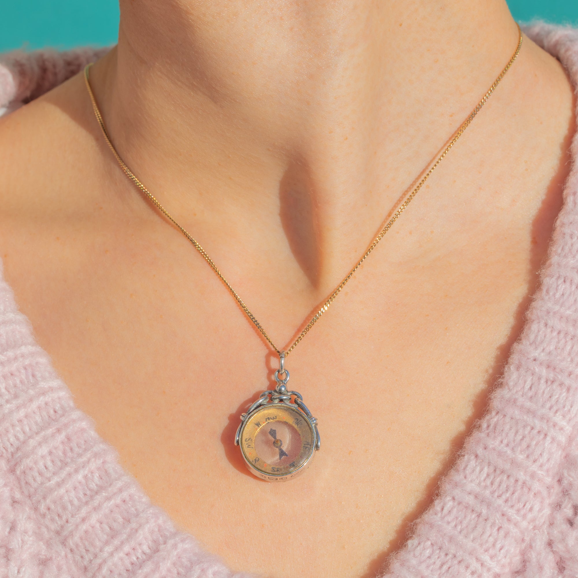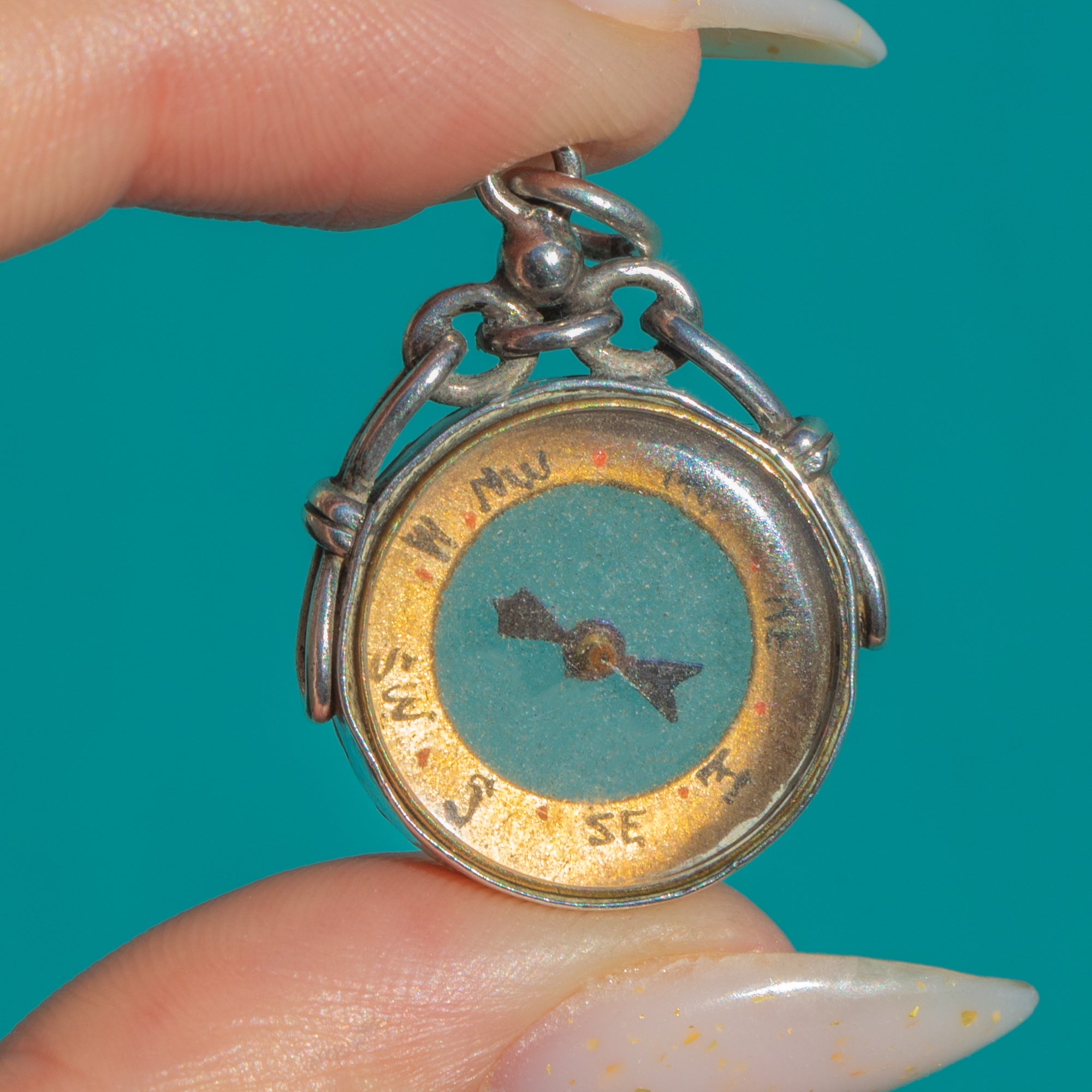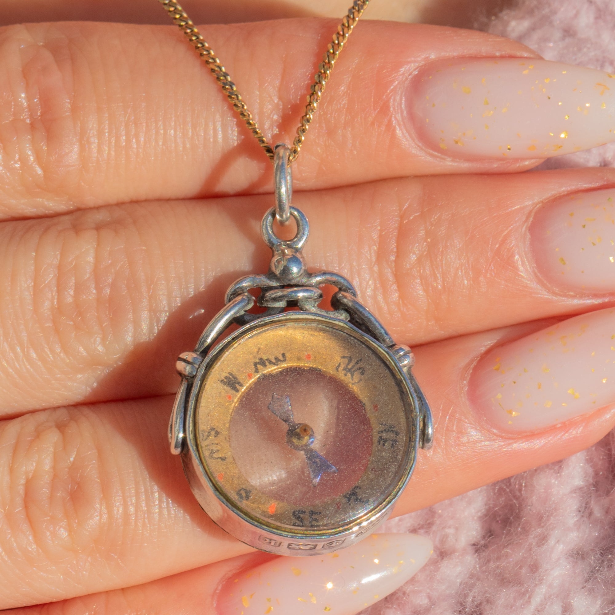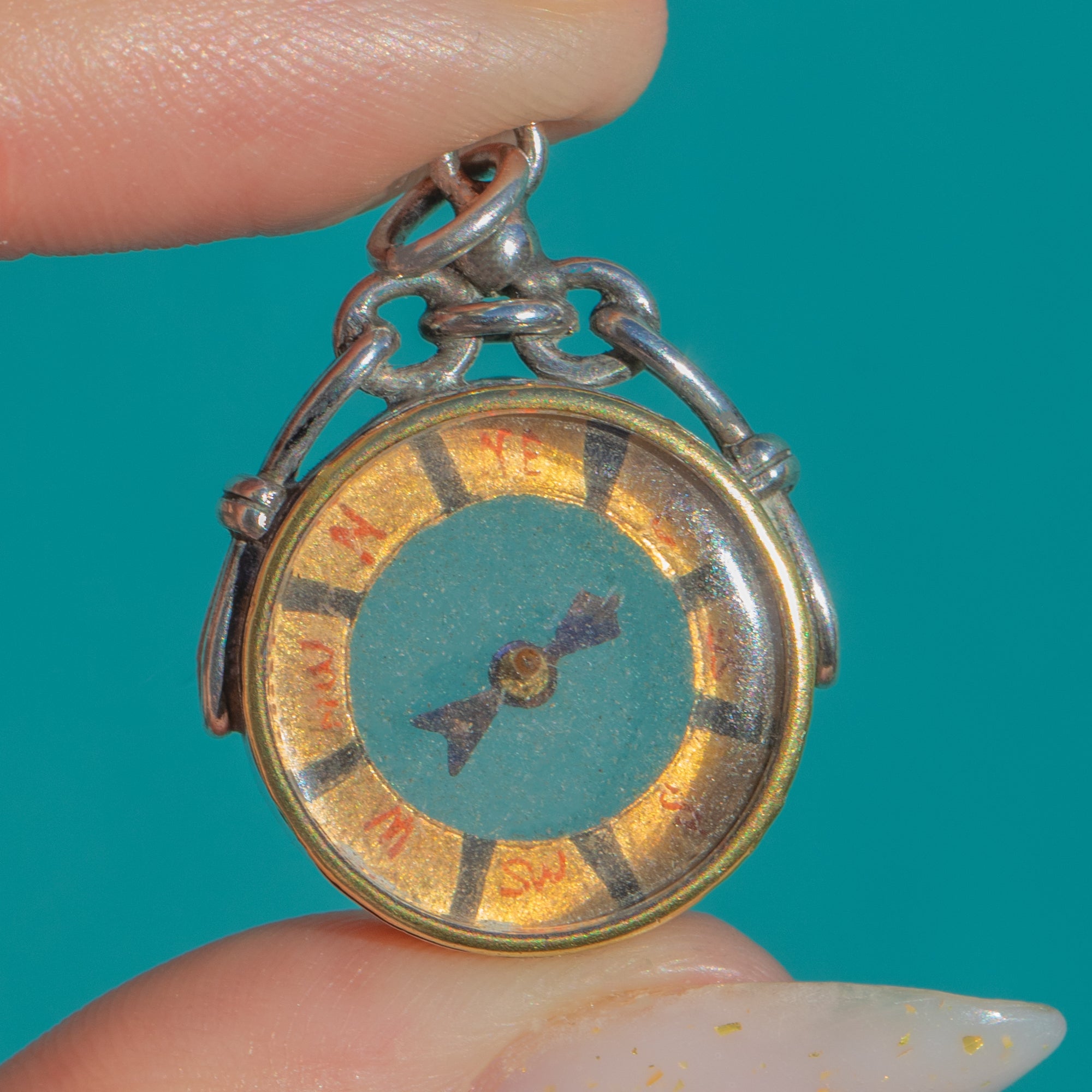 A charming Edwardian Silver compass pendant, hallmarked in Birmingham in 1909. Petite and beautifully detailed, it features a domed glass protecting a characterful dial with hand-applied cardinal letters and red dot markers, all suspended from a fixed jump ring for effortless wear.