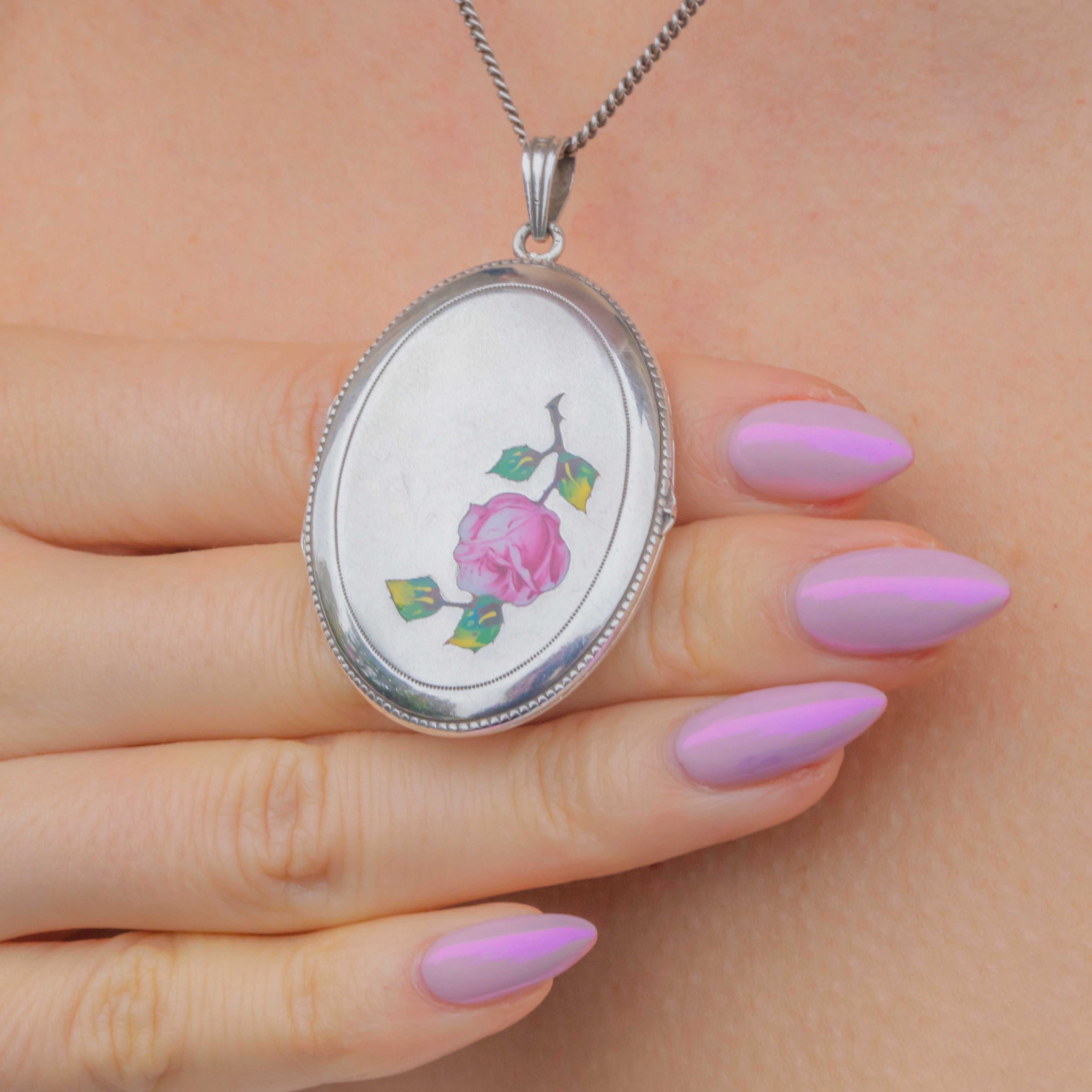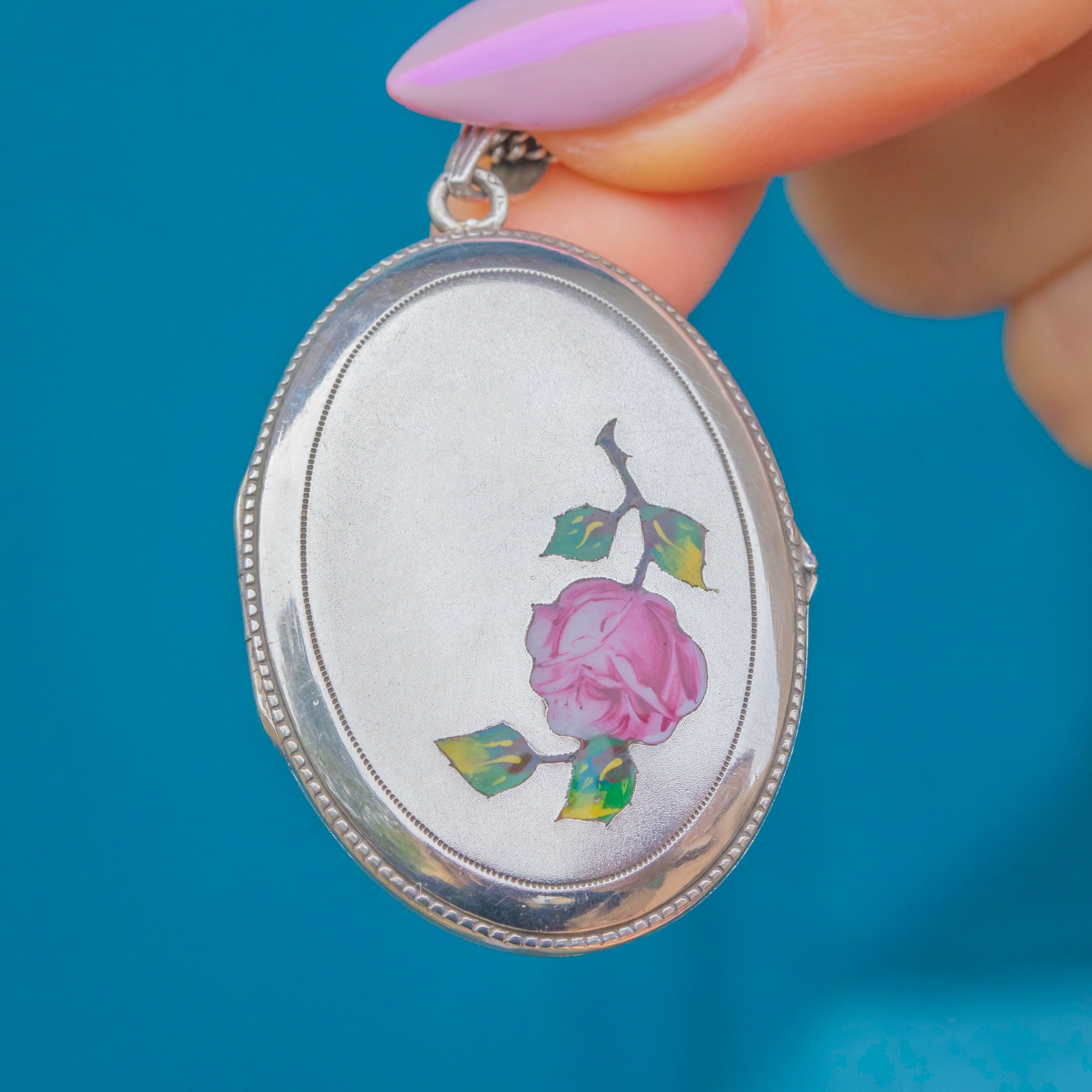 Edwardian Silver Enamel Rose Locket with 23" Chain