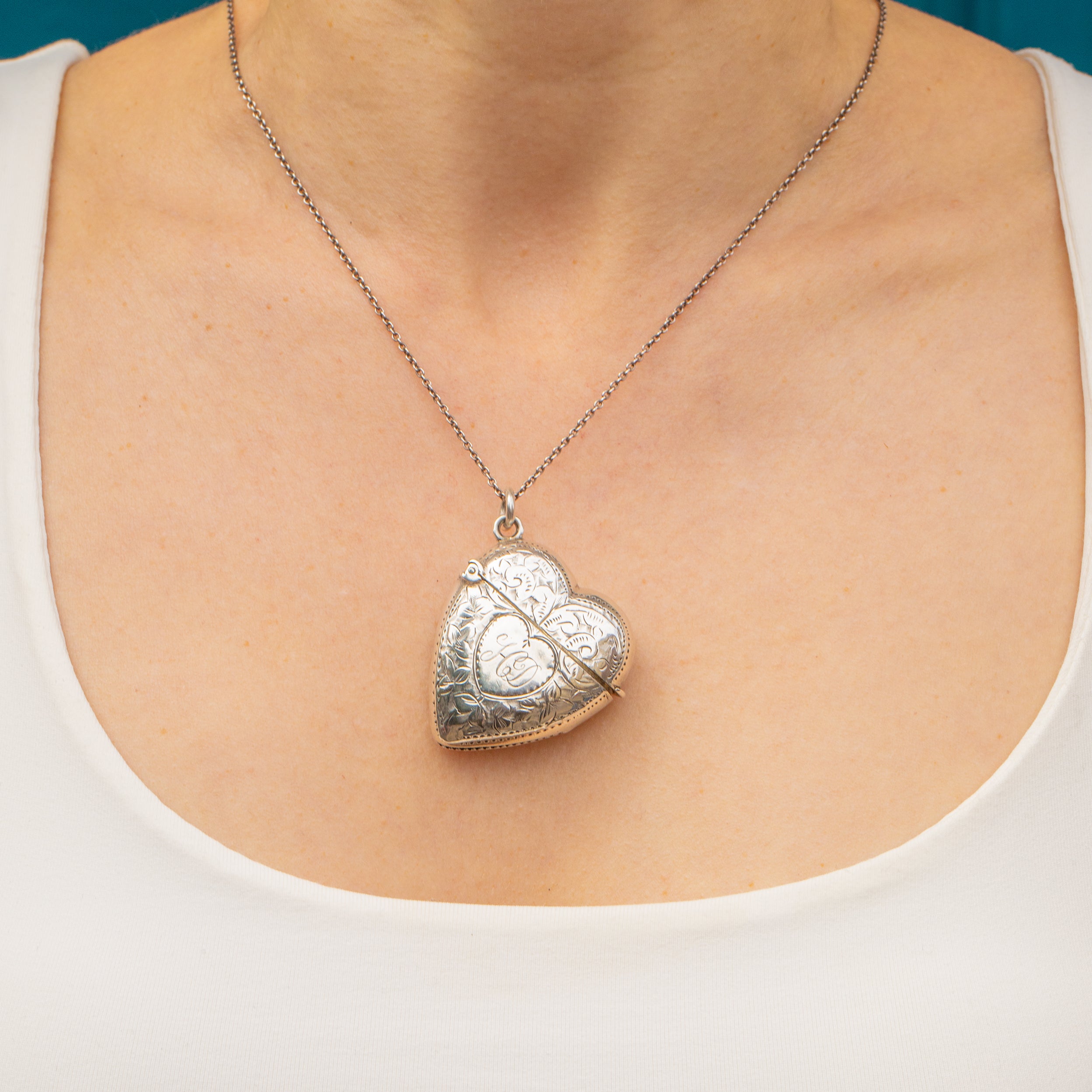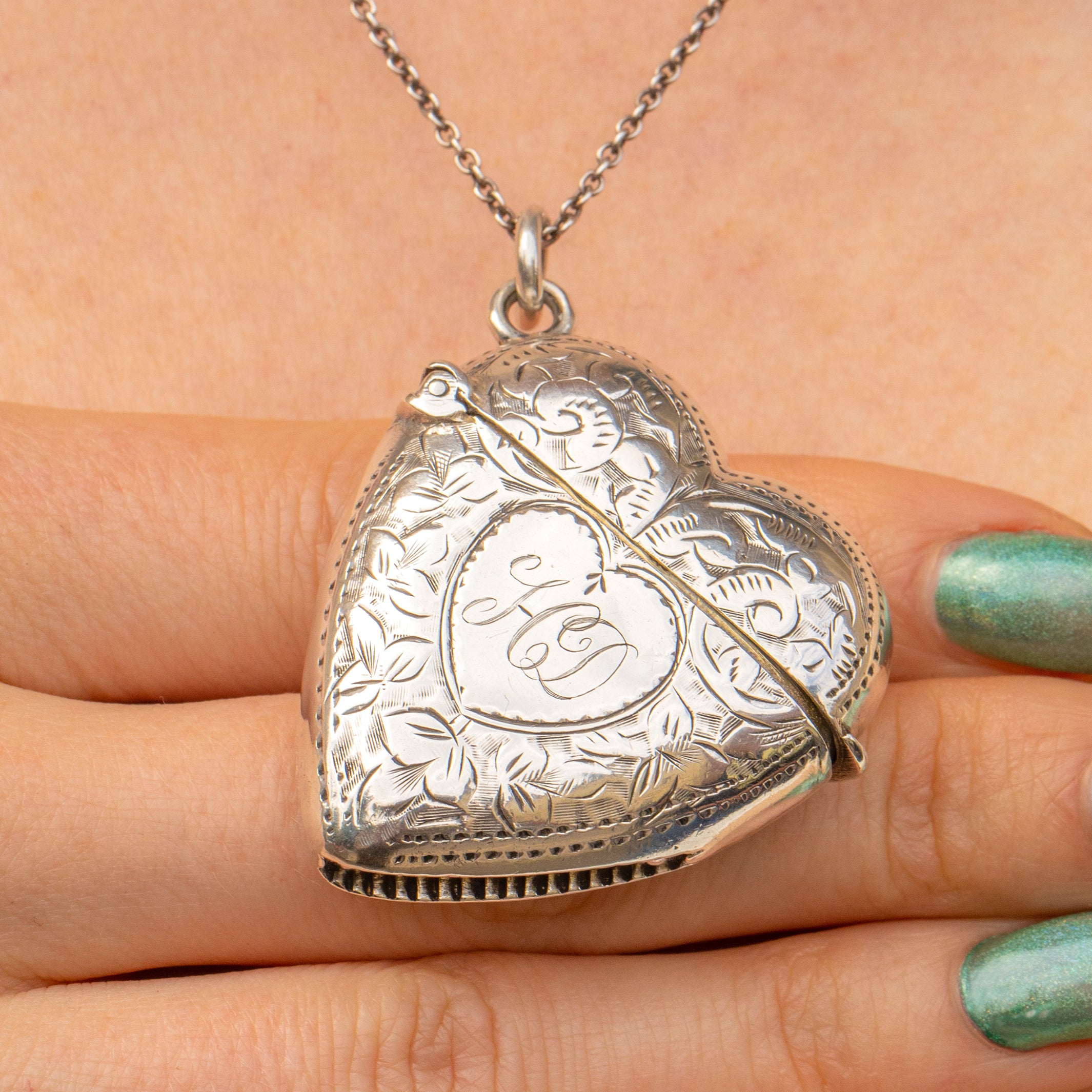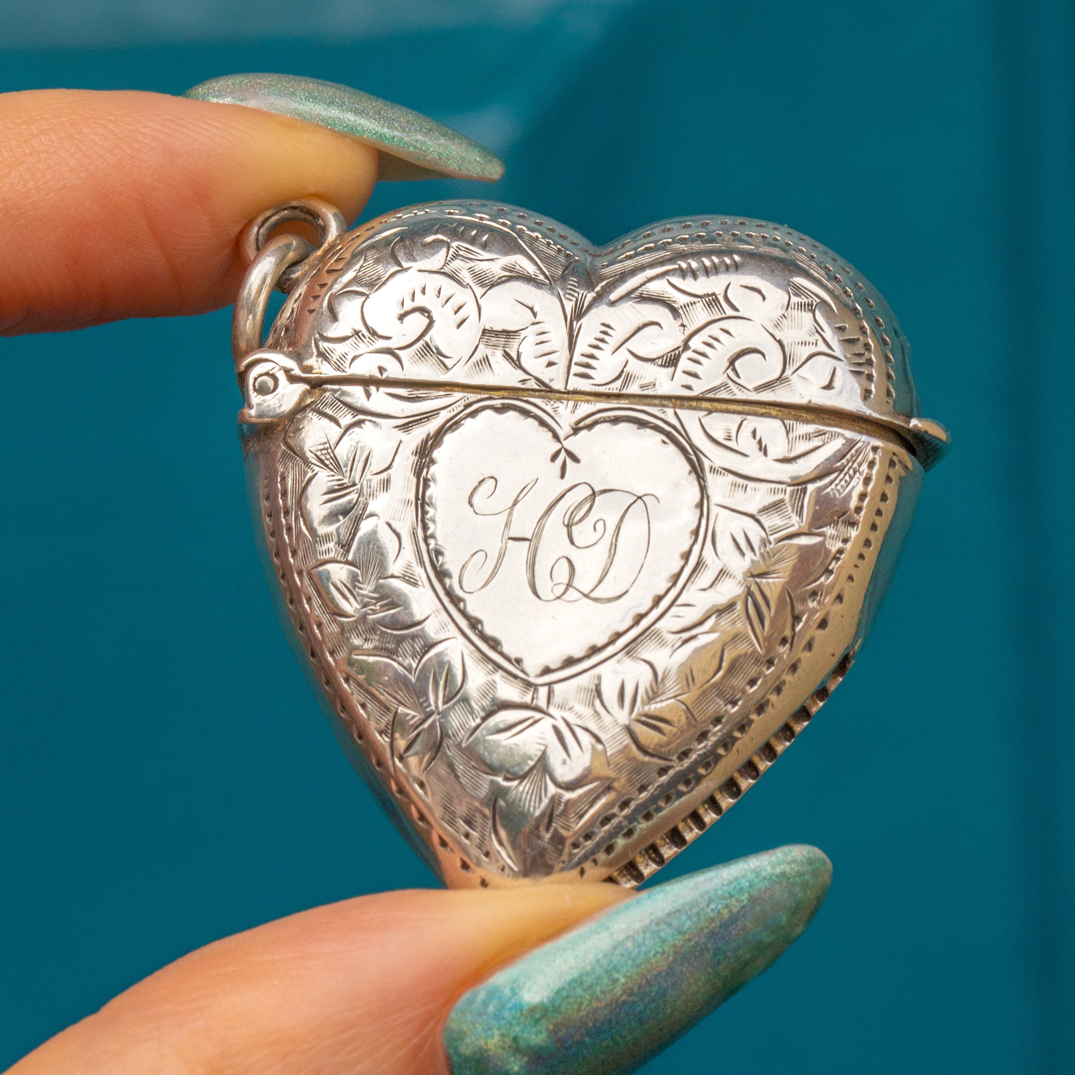 VERY GOOD. This Edwardian Silver engraved heart shaped vesta case is in very good condition! Her Sterling Silver is beautiful throughout, with her engravings having remained crisp and clear. There is a dark patina on the inside, commensurate with age, adding to her antique charm. Her hinge mechanism is in full working order keeping the lid firmly shut when suspended from the jump-ring. An overall exciting and characterful piece, sure to make a cute addition to your collection!