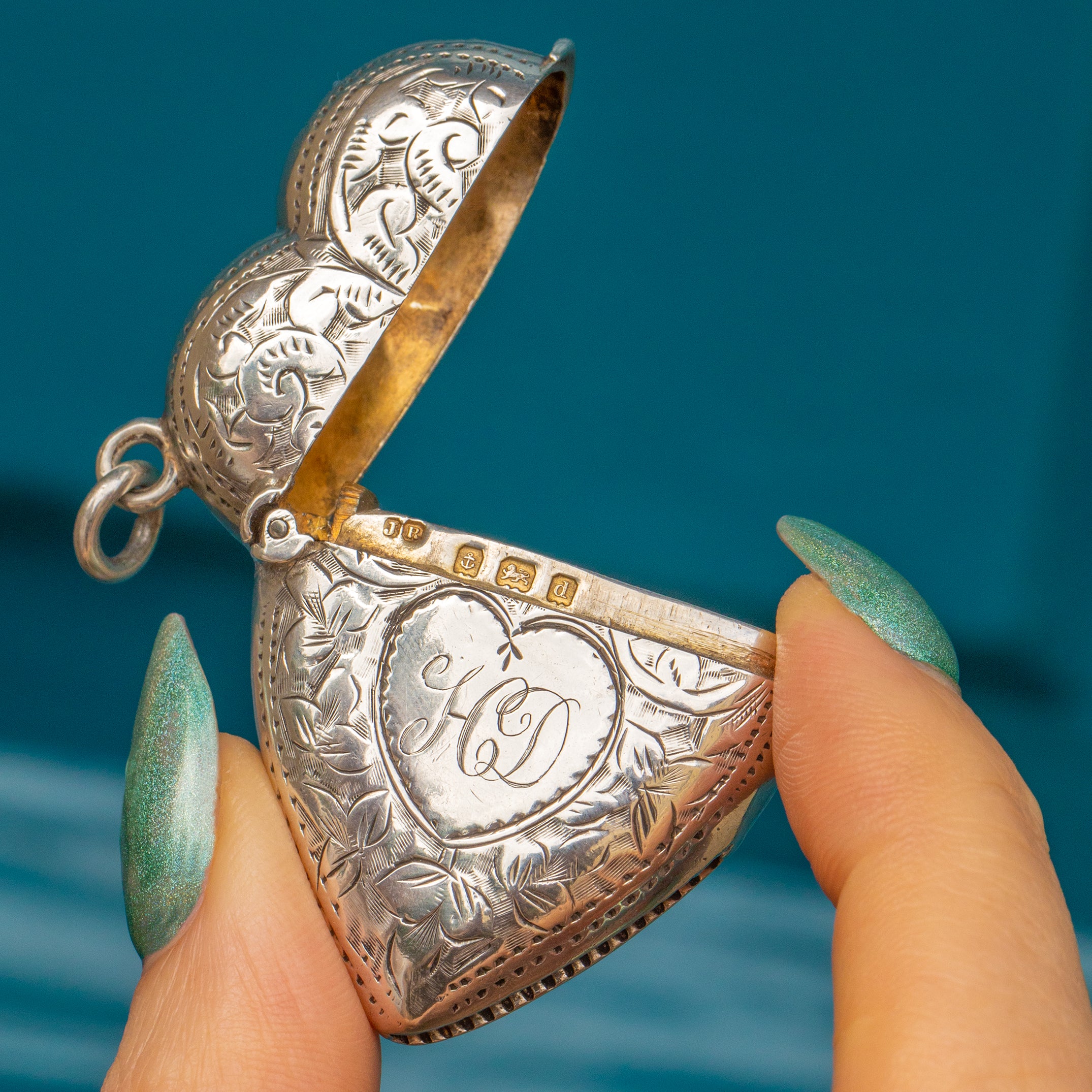 Crafted from lustrous Sterling Silver, her heart shape is encased in forget-me-nots and comes complete with a cartouche on her front reading 'HD'. With her chunky jump ring, she could become a statement piece adorning your neck by simply suspending her from a chunky Silver chain. This Edwardian vesta case will make a fun addition to your antique jewellery collection!