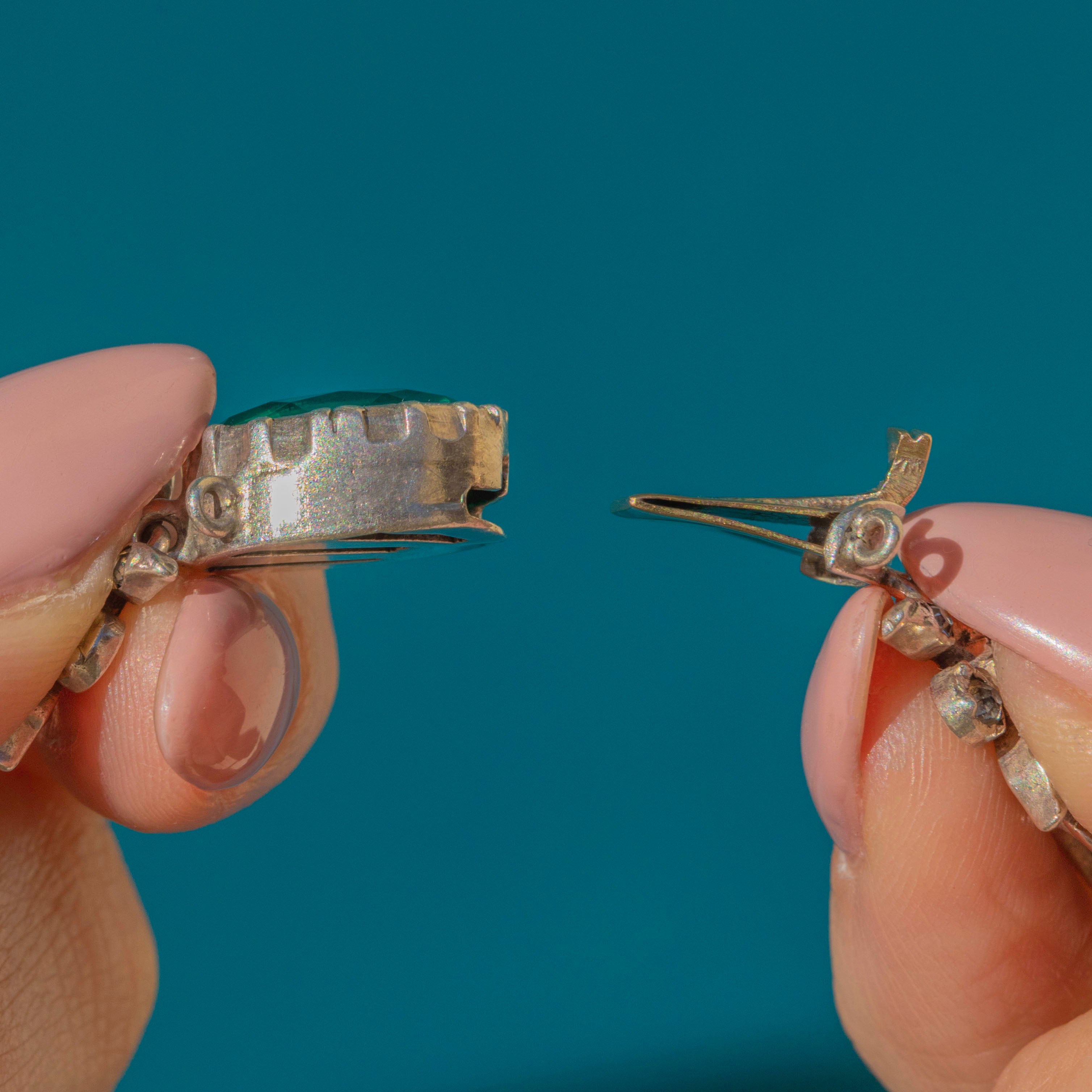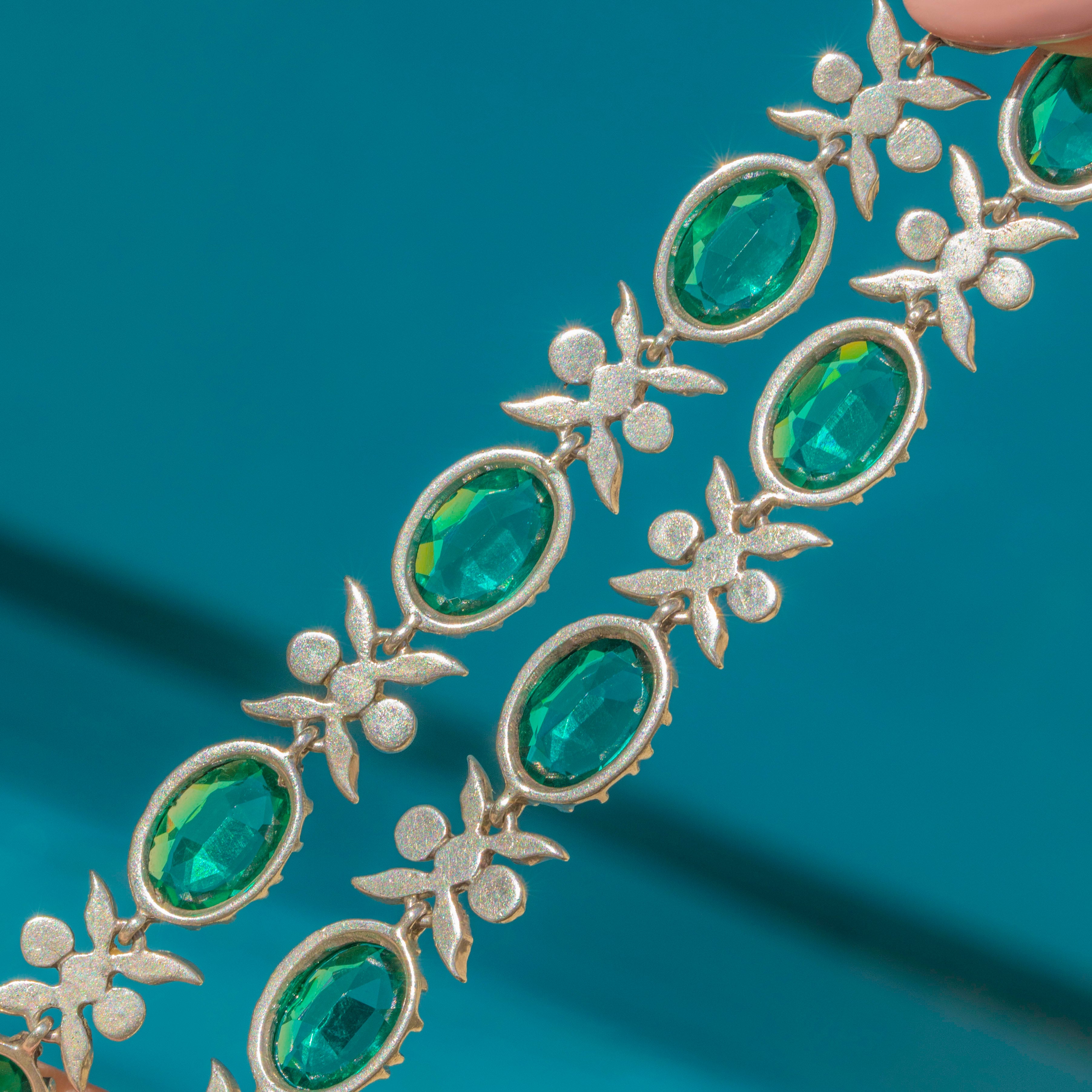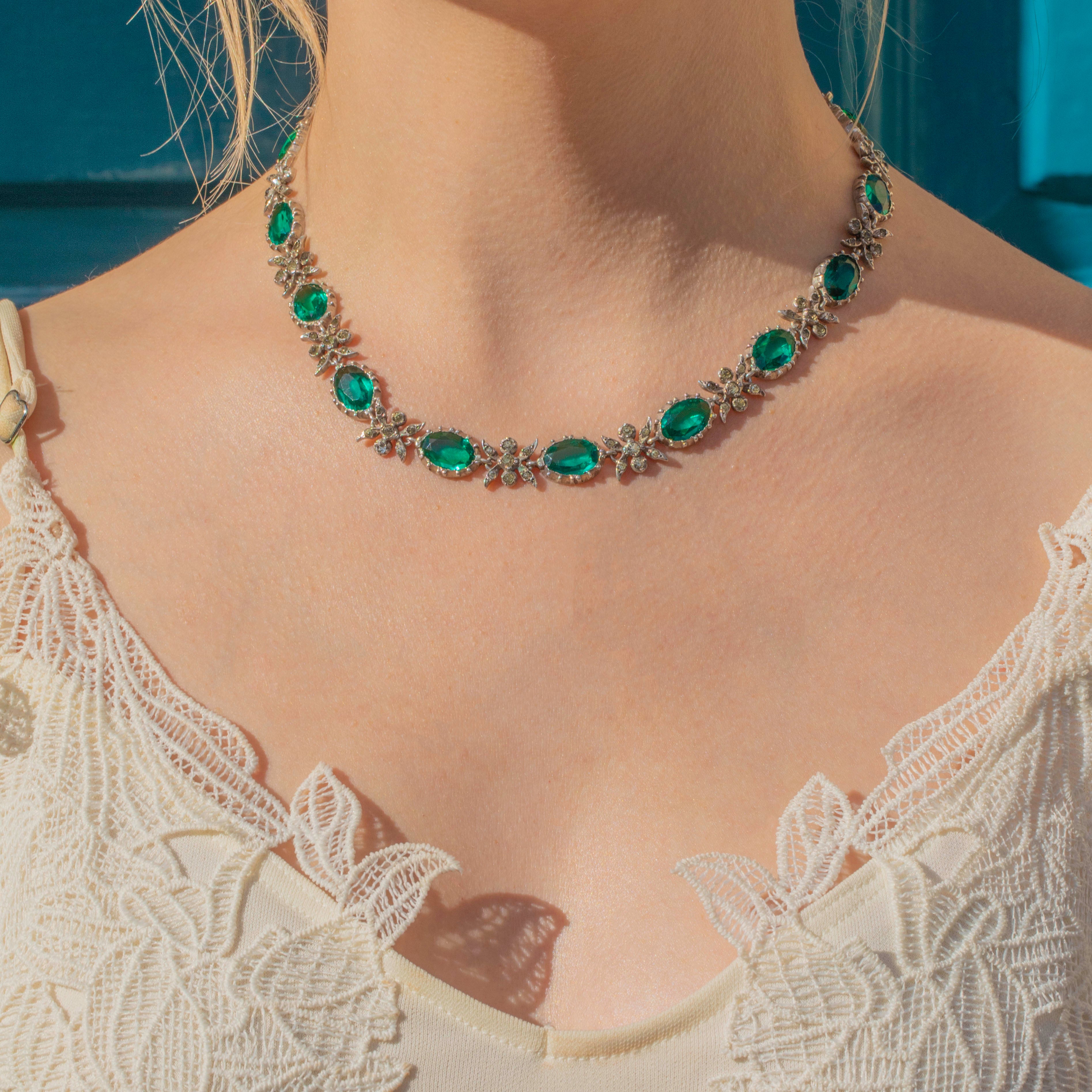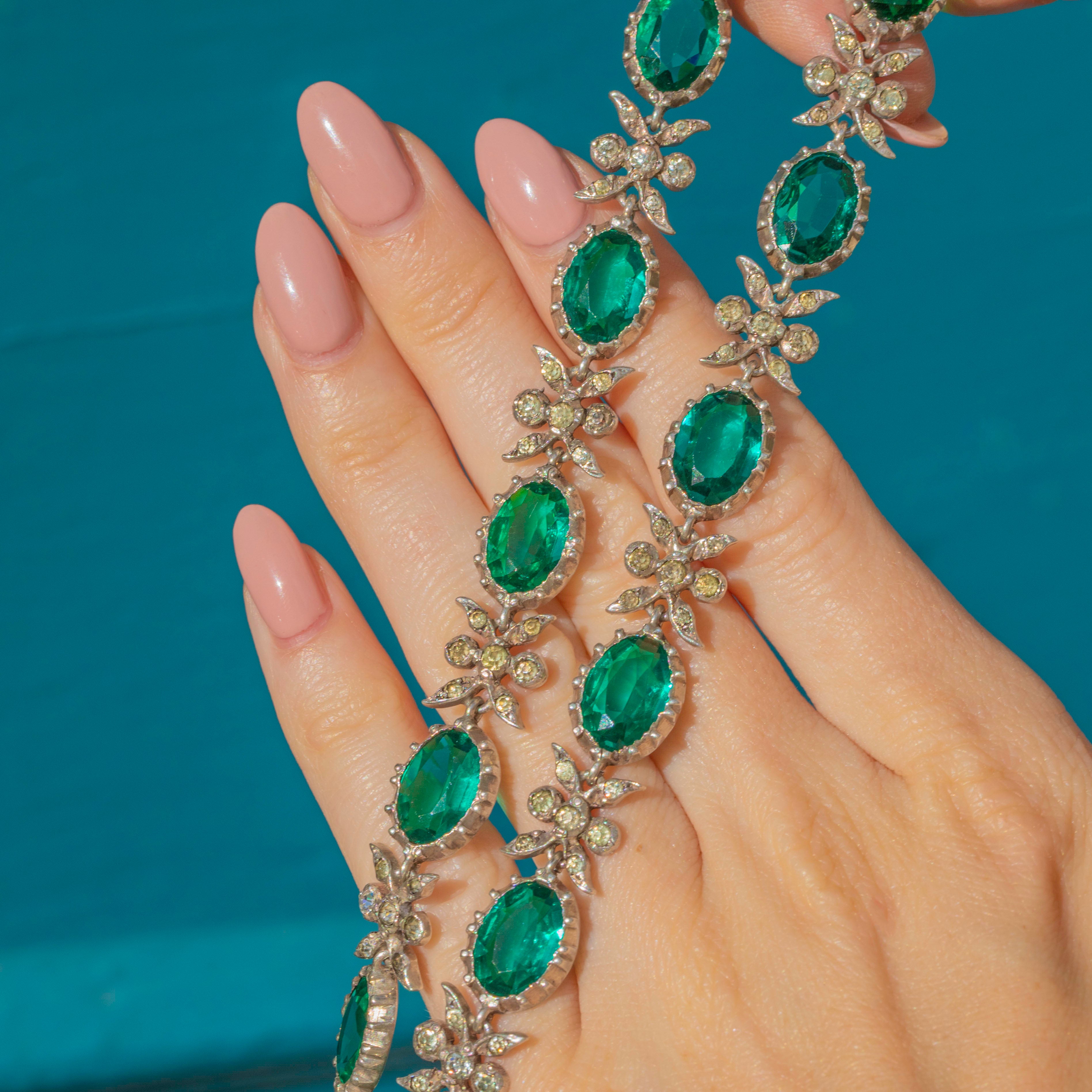 EXCELLENT. This Edwardian Silver green and white Paste necklace is in excellent condition. Her Paste stones are vibrant and dazzling, complimented effortlessly by her Silver settings. The Paste and the Silver are free from any scuffs or visible signs of wear, and her links are uniform and secure, allowing for a comfortable and confident wear.