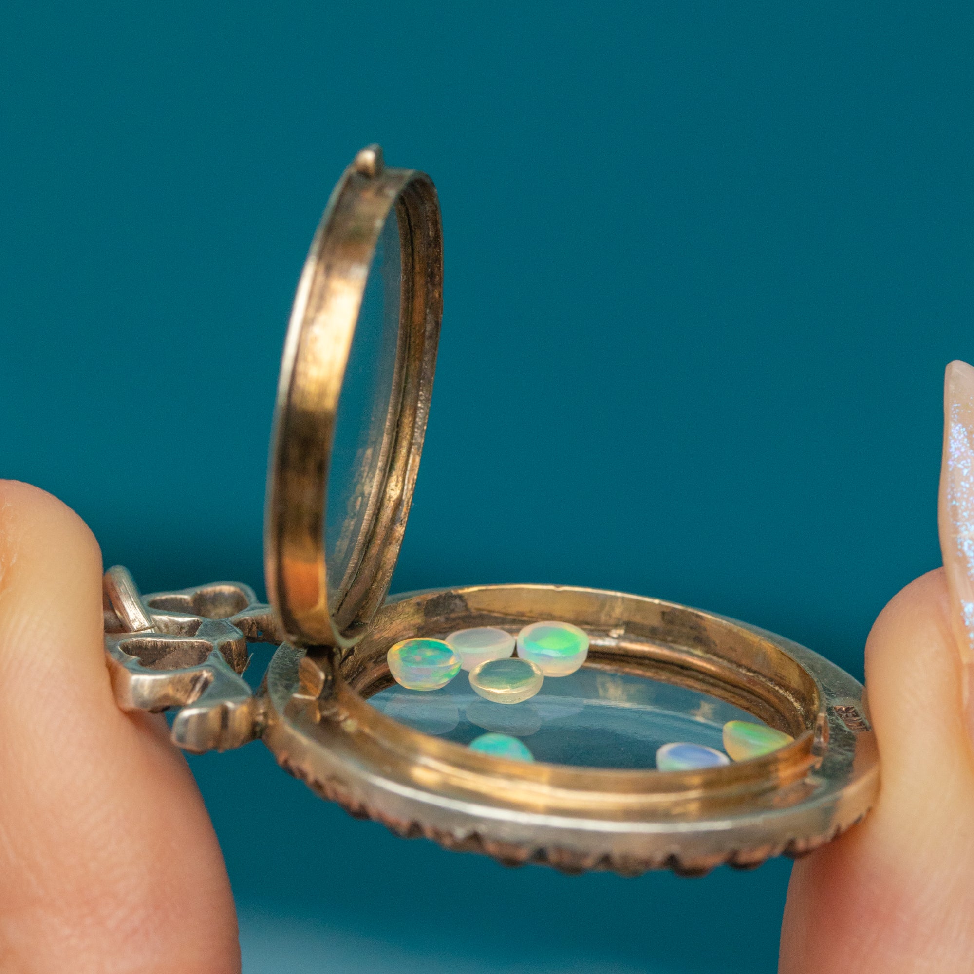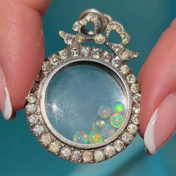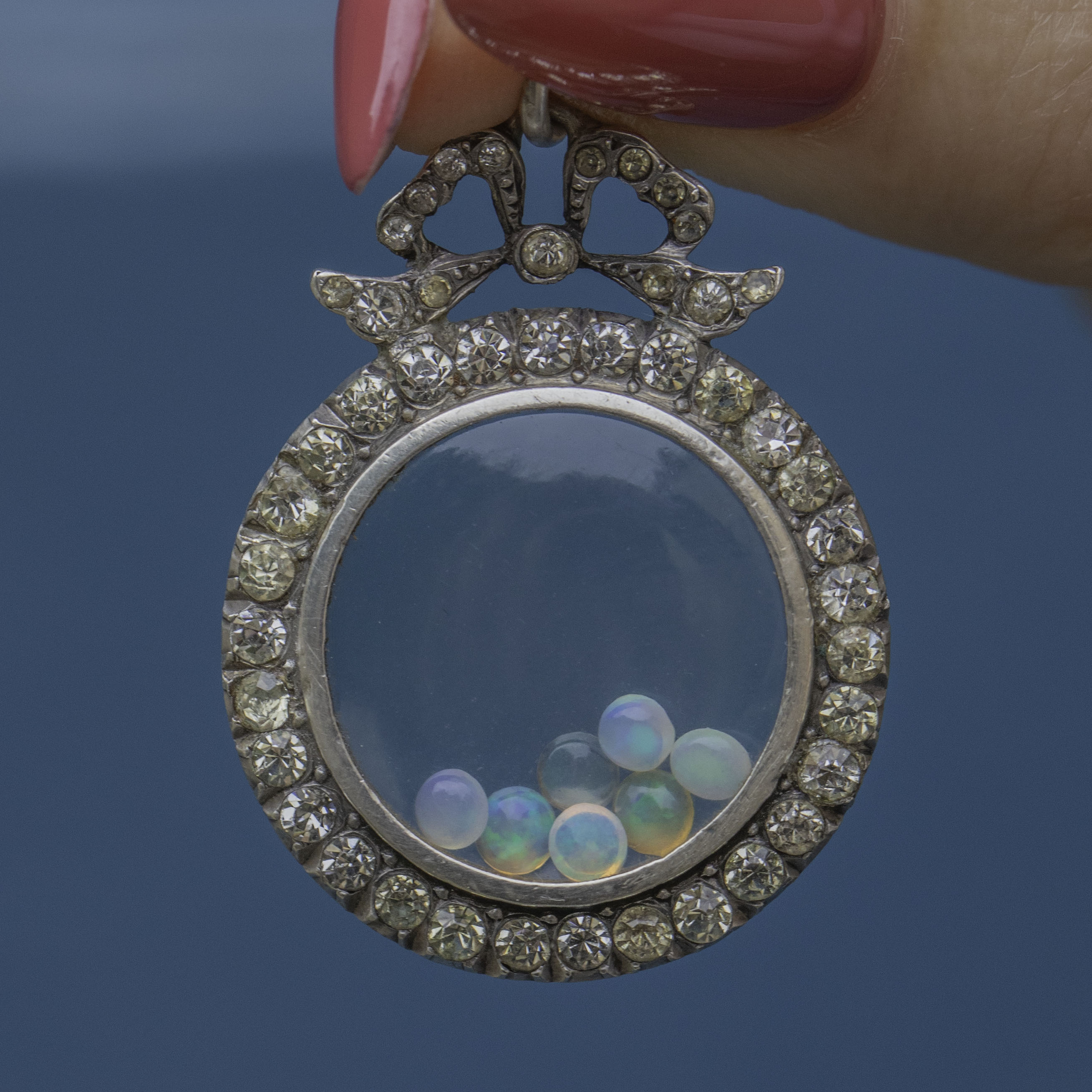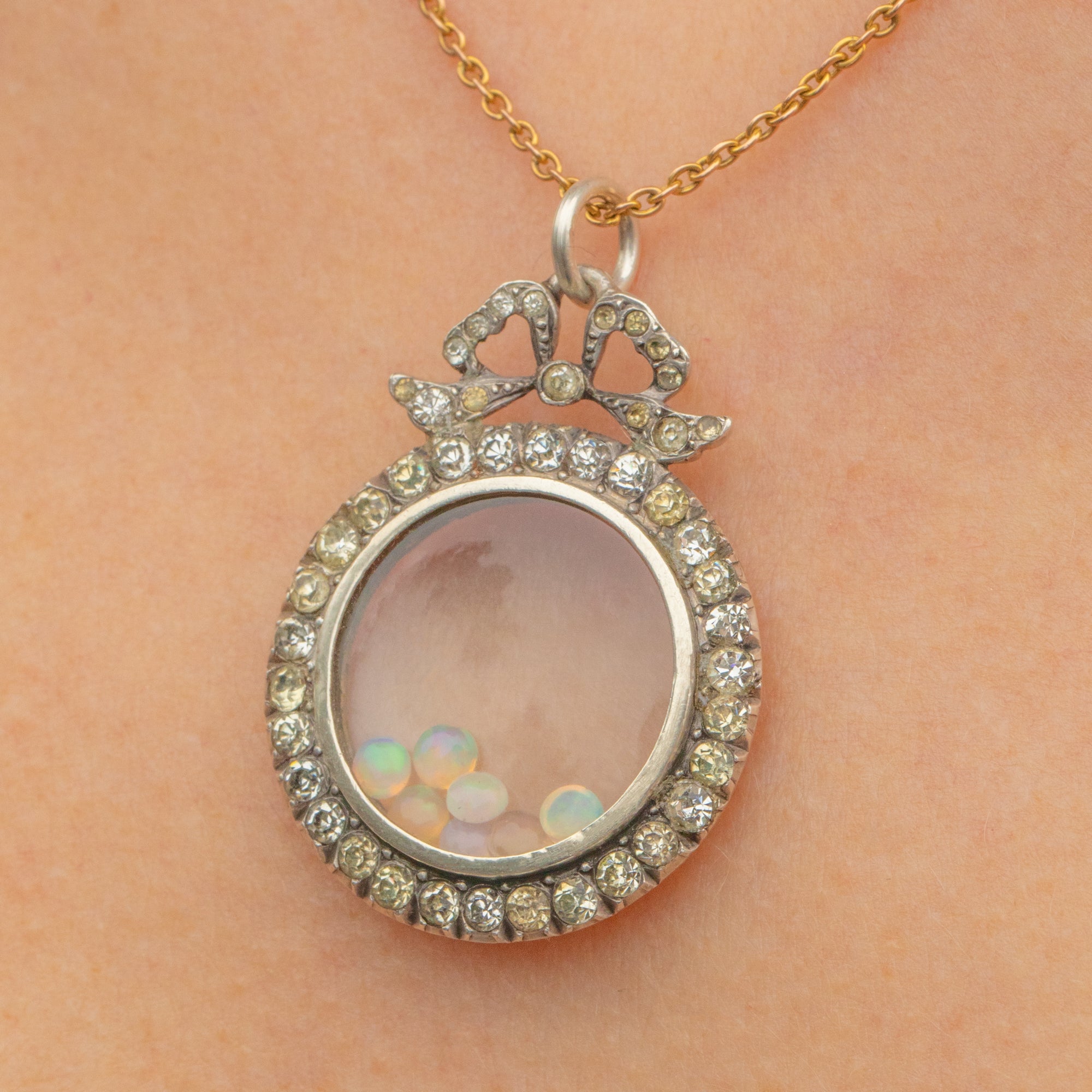 VERY GOOD. This Edwardian Silver Opal shaker locket is in superb condition. Each of her twinkling Paste gemstones are present and secure, and while some of them have discoloured over the years, this does not affect the way they glisten and sparkle under light! There are a few signs of wear on the back of the locket but nothing that detracts from her beauty. If you have a penchant for sparkle and gemstones, this Edwardian shaker locket is not one to be missed!