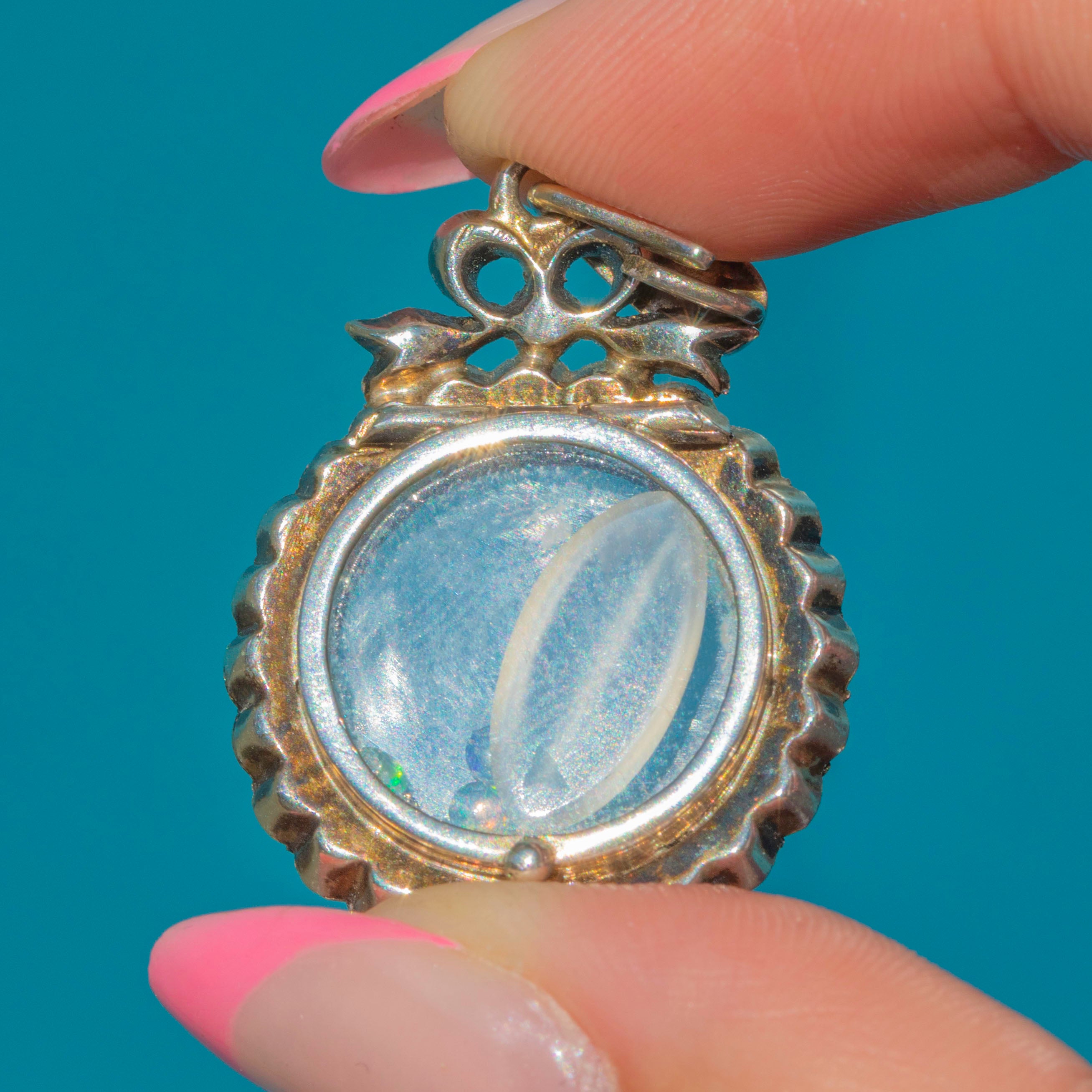 Inside, a delicate mix of confetti Opals and sparkling Diamonds creates a magical shaker effect, with a large Moonstone cabochon adding a unique flair. The back of the locket opens effortlessly, allowing you to add, remove, or customise its contents to suit your own story.