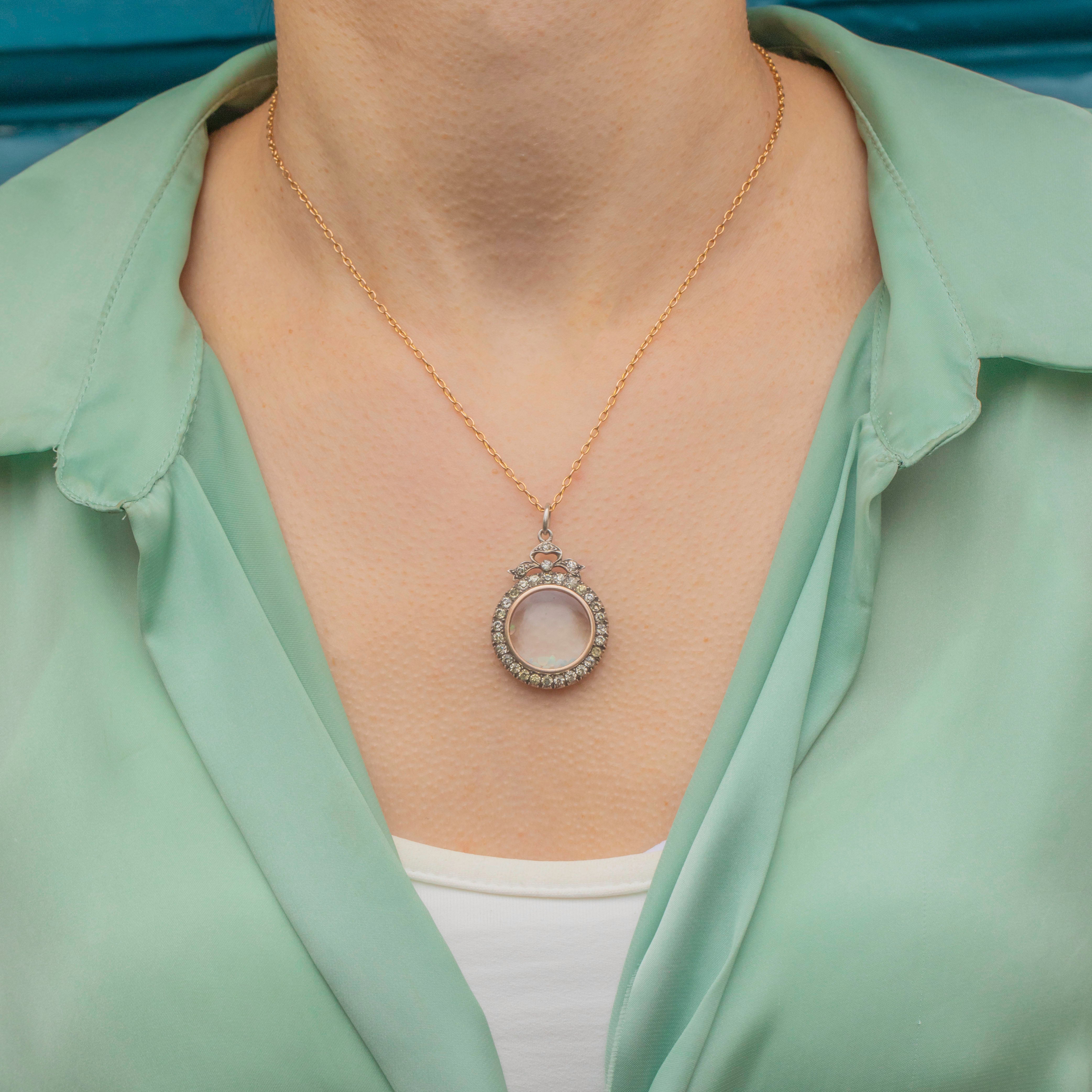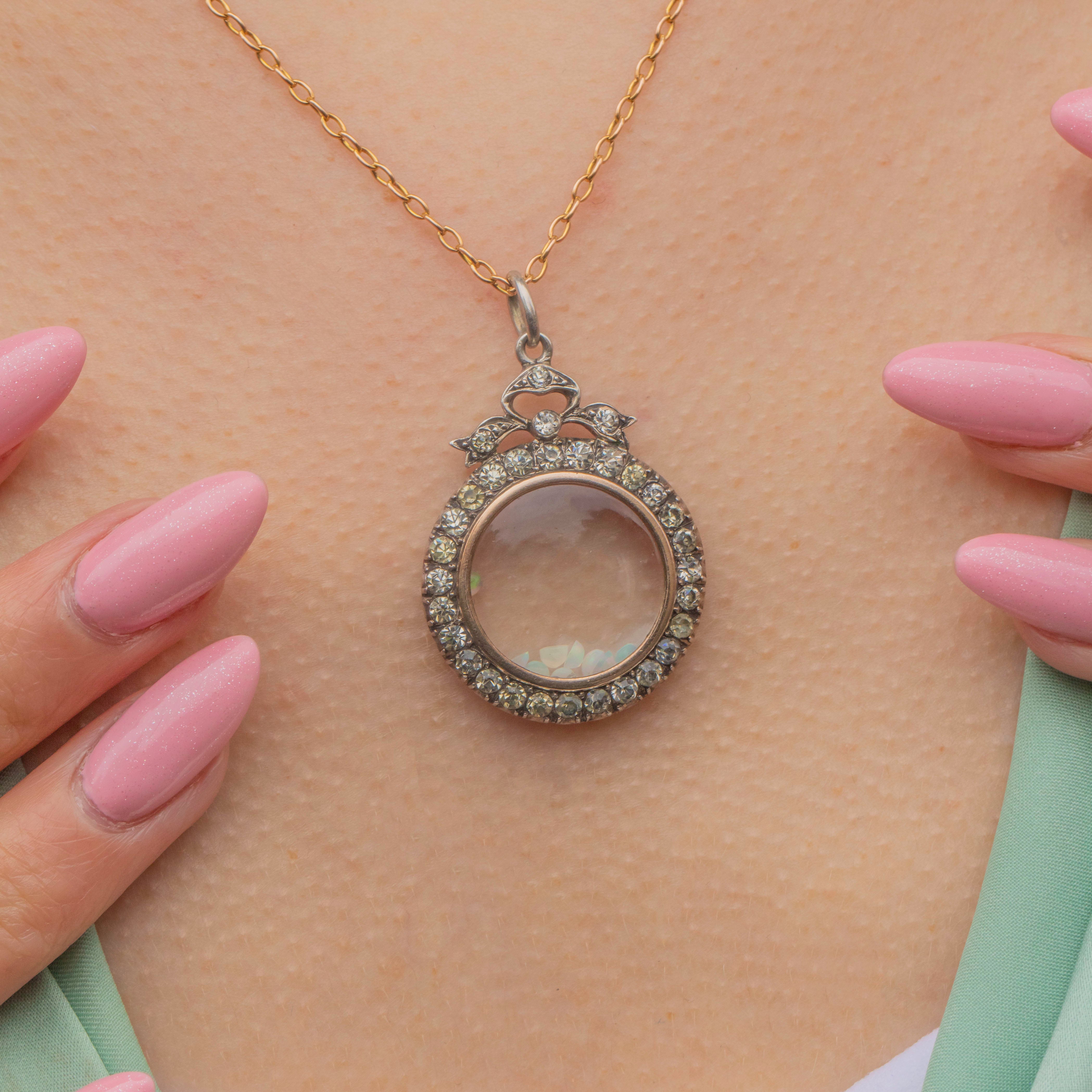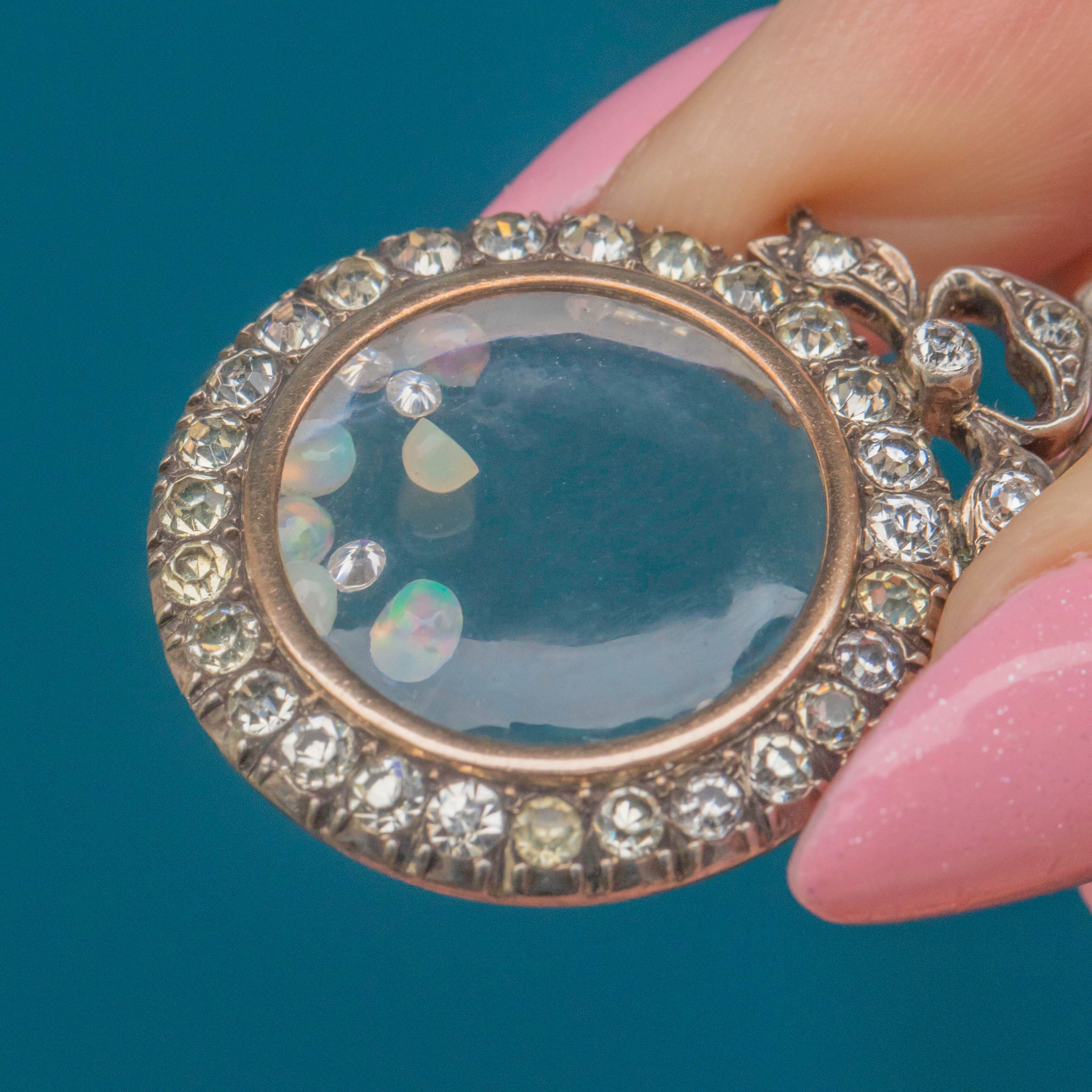 A sprinkling of loose Opals and Diamonds is held within the glass panes, adding a sense of movement to the piece. The locket compartment can easily be opened and its contents added to or replaced, making this Edwardian shaker the perfect customiseable accessory!
