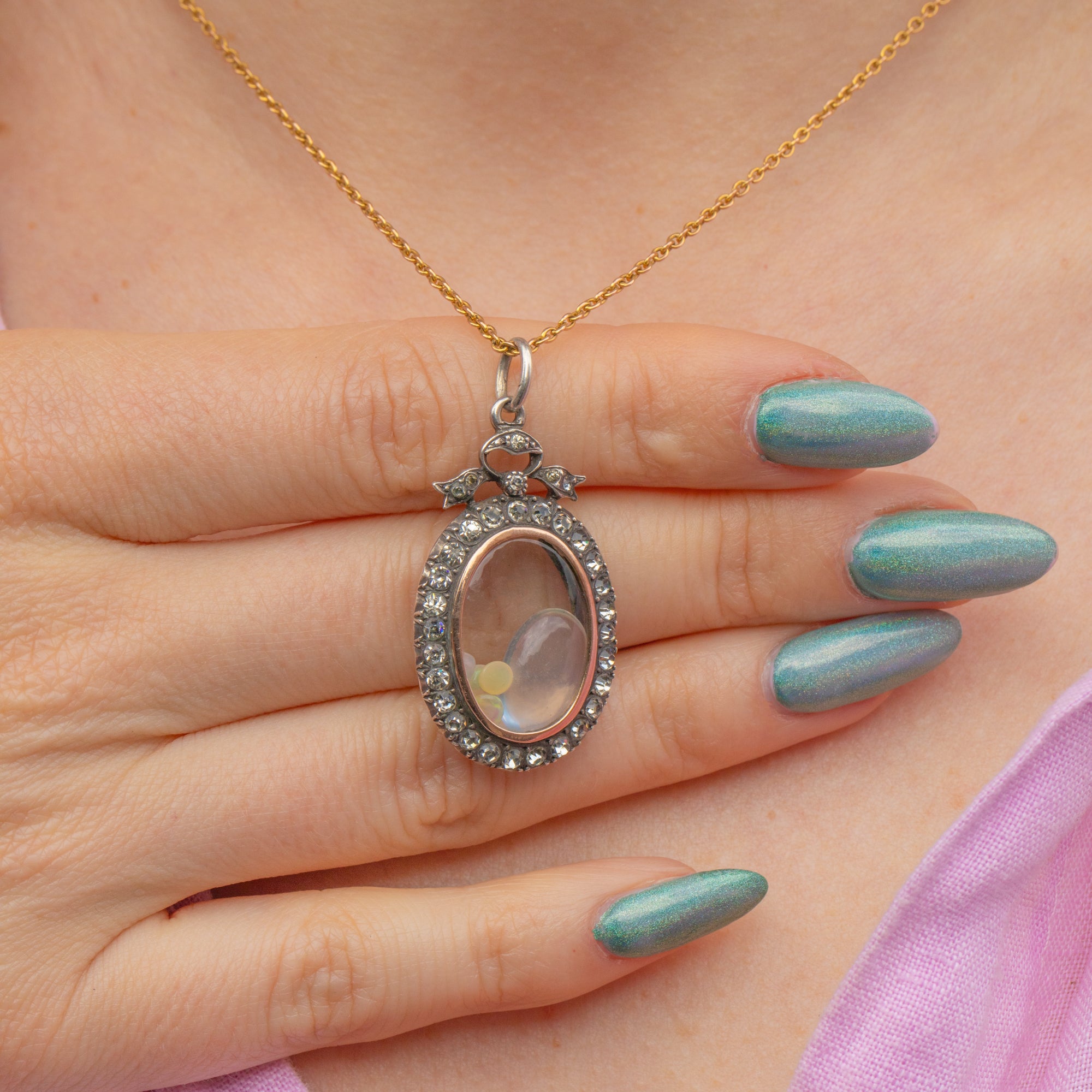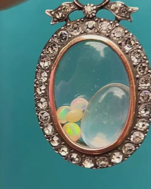 This Edwardian Silver Paste shaker locket is a sparkling statement that will catch the eye of any on-looker! Not only does she have a border of scintillating Paste that glisten from every angle, but she is also filled with vibrant Opals and Moonstones inside.