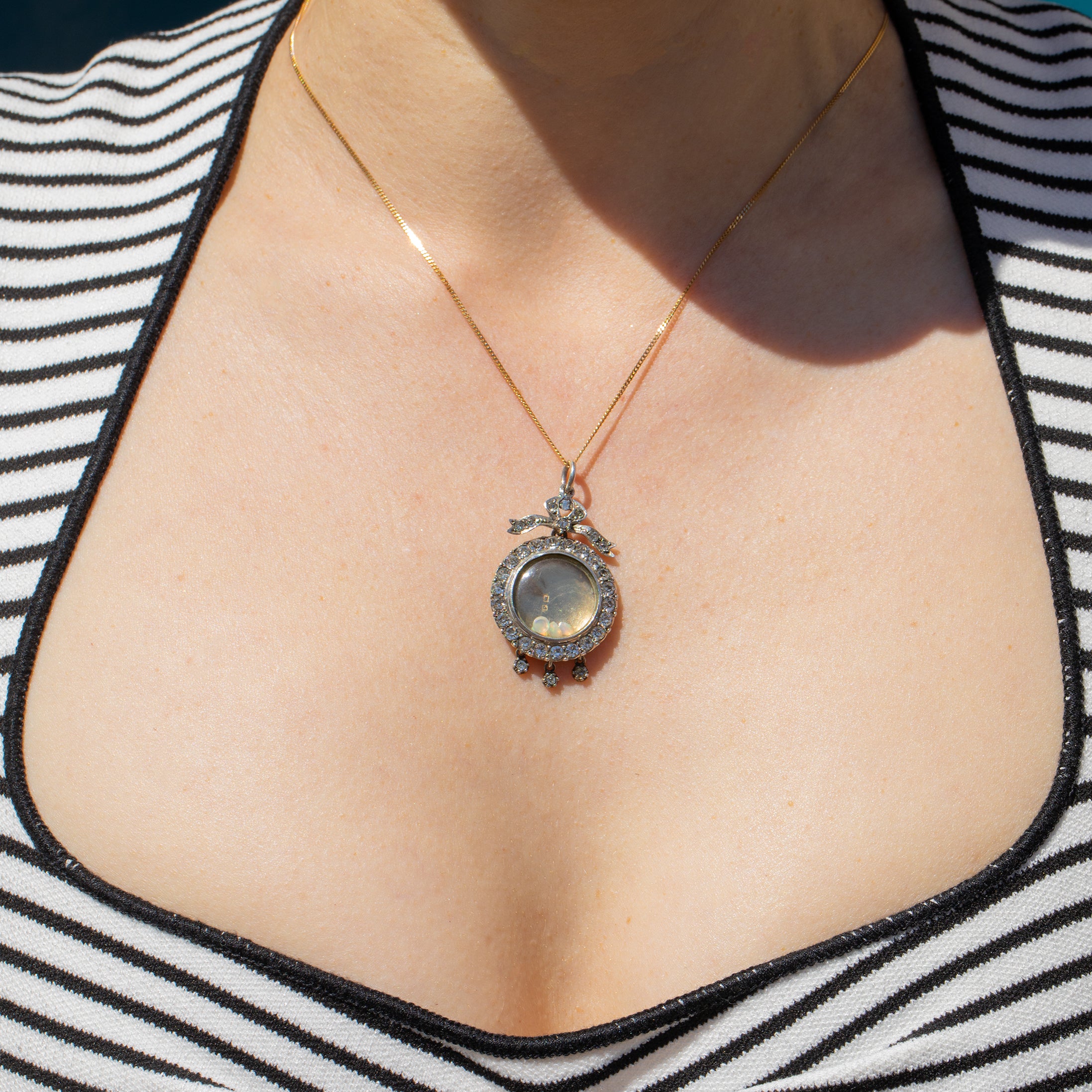 This pretty Paste locket is topped with an embellished bow bale, giving her bundles of charm. Oozing femininity, this antique Silver locket is a timeless piece of Edwardian jewellery, ready to be worn straight from her pink Lillicoco box!
