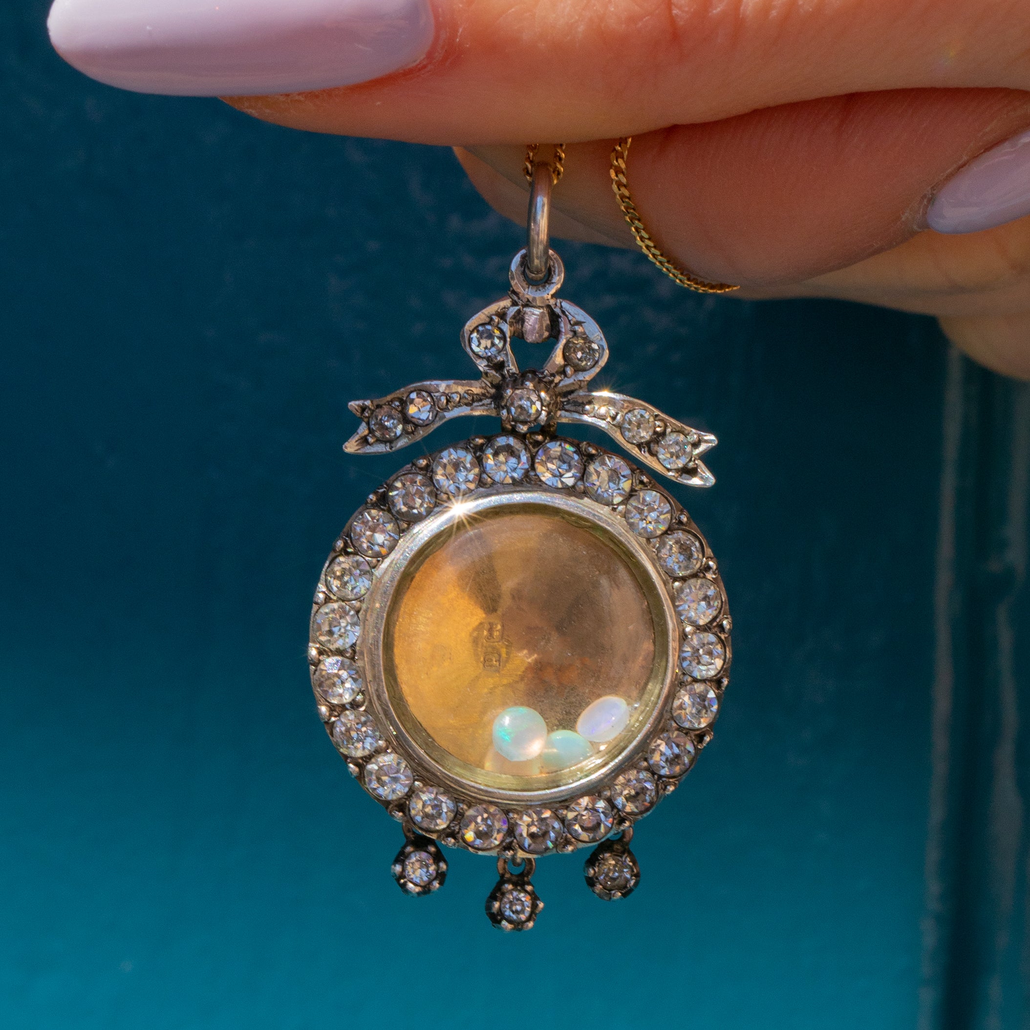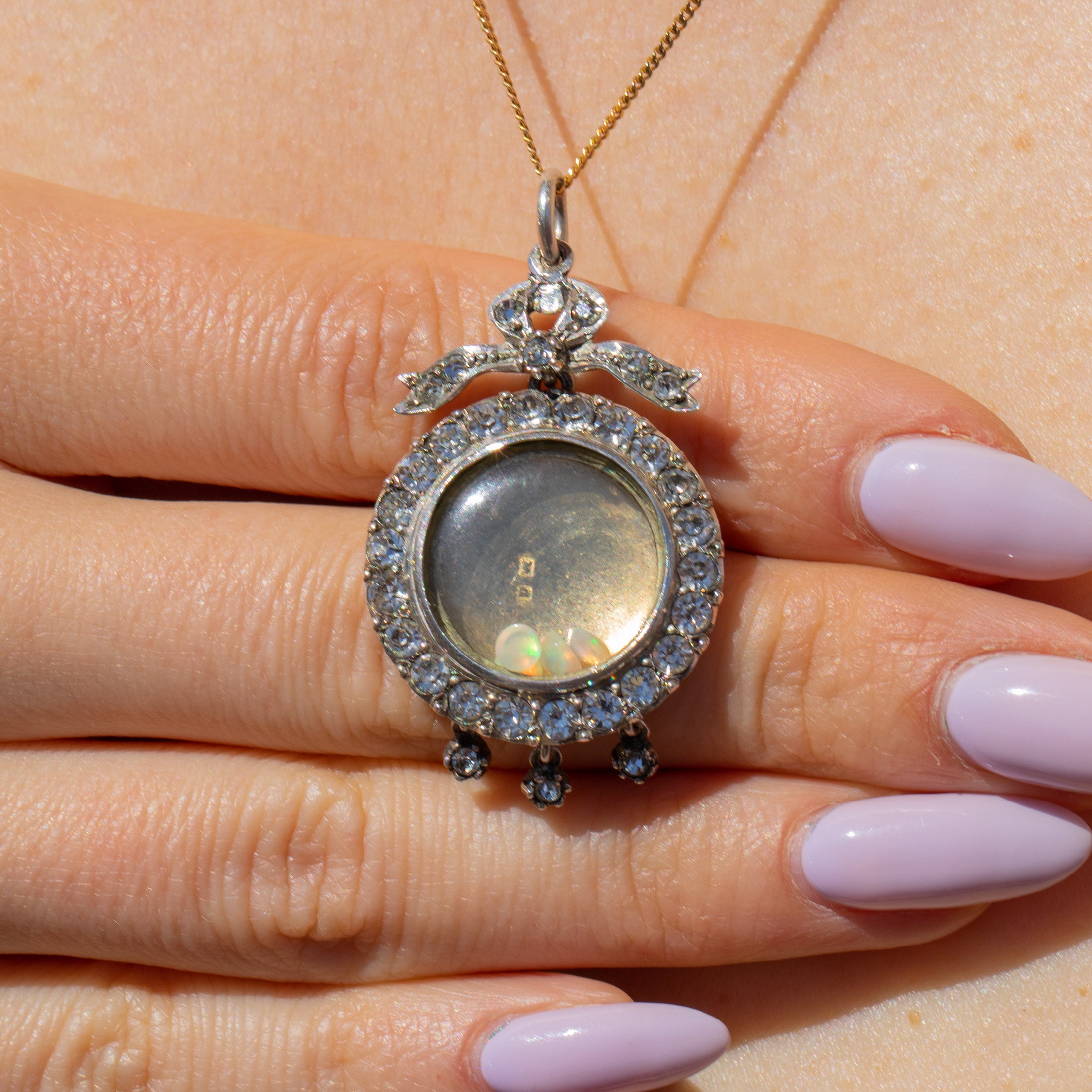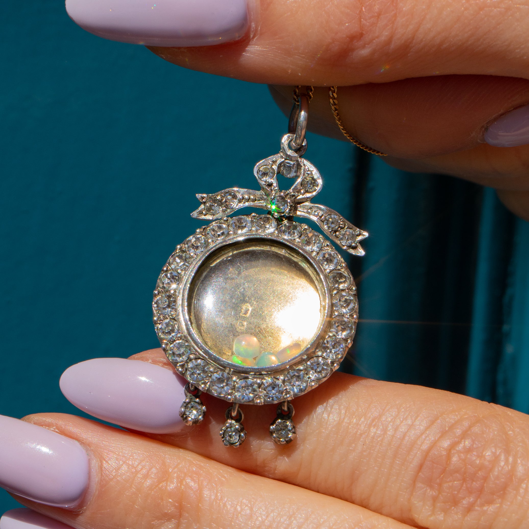 Edwardian Silver Paste Shaker Locket with Bow Top, Loose Opals & Diamonds