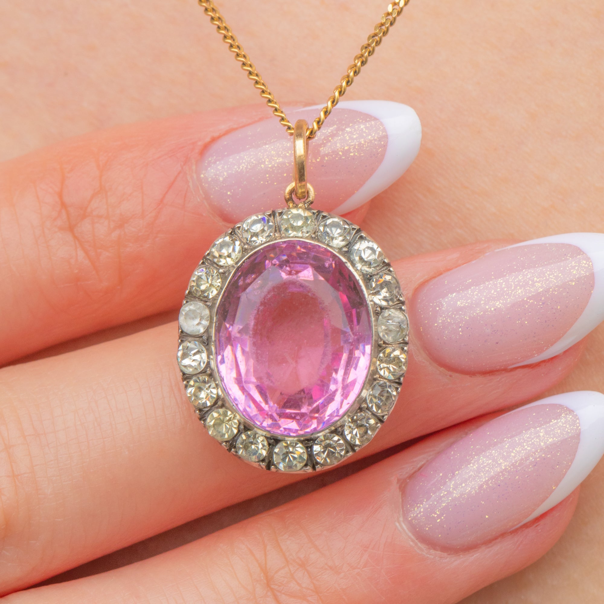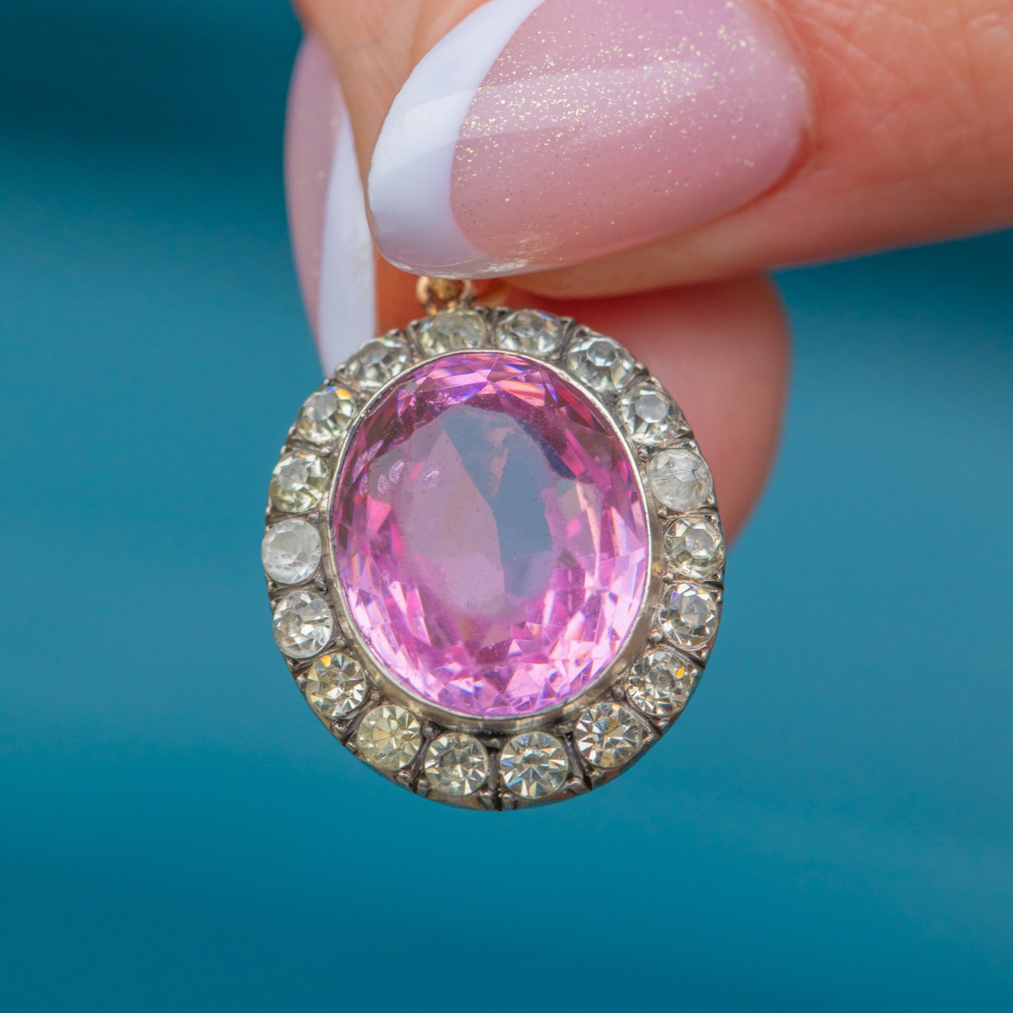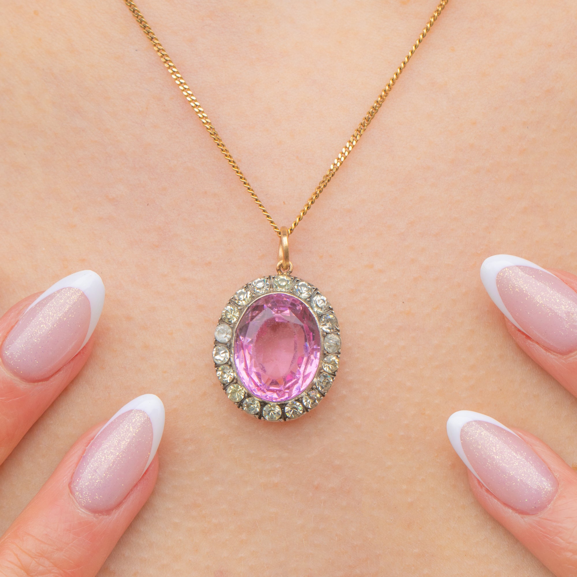 This pretty Edwardian Silver Pink Paste cluster pendant exudes feminine charm! The large central Paste has a delightful pastel pink hue and is adorned by crisp white Paste, formed into a majestic cluster that scintillates in the light.