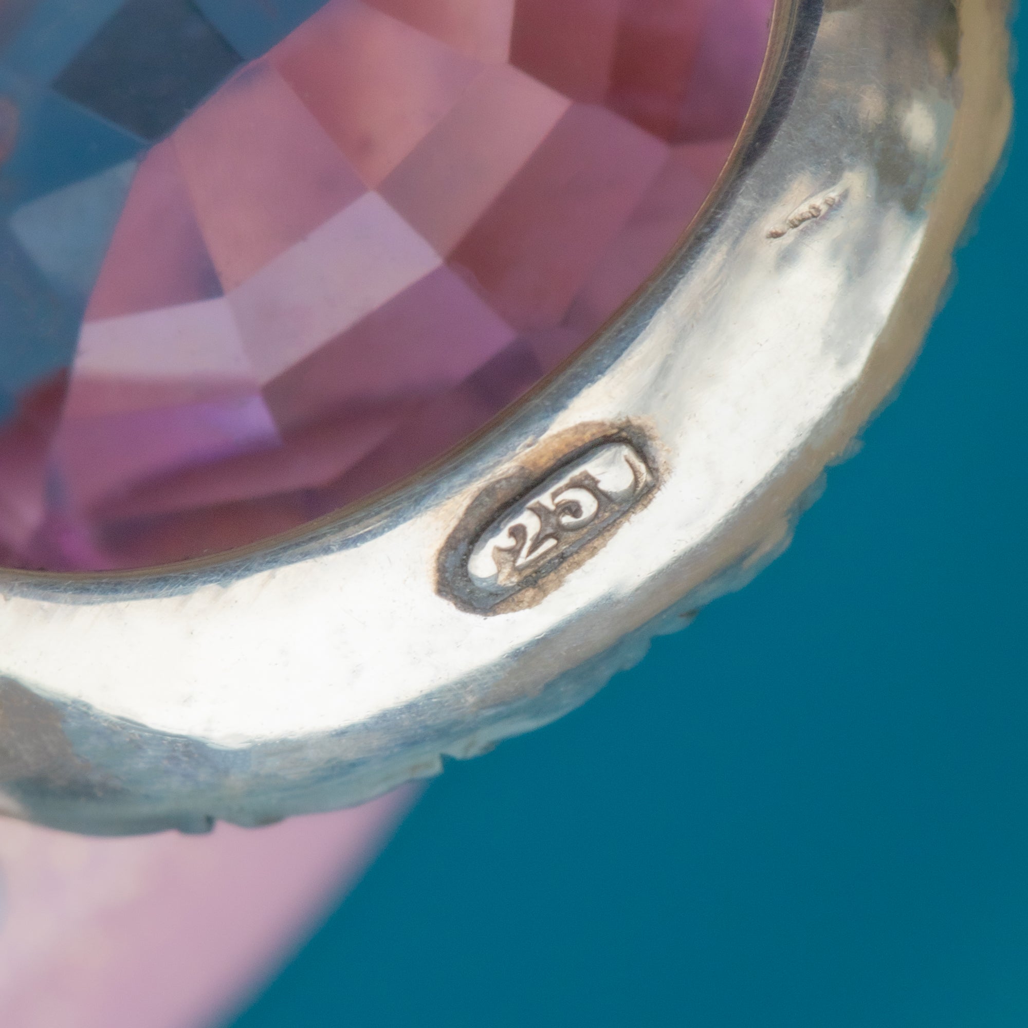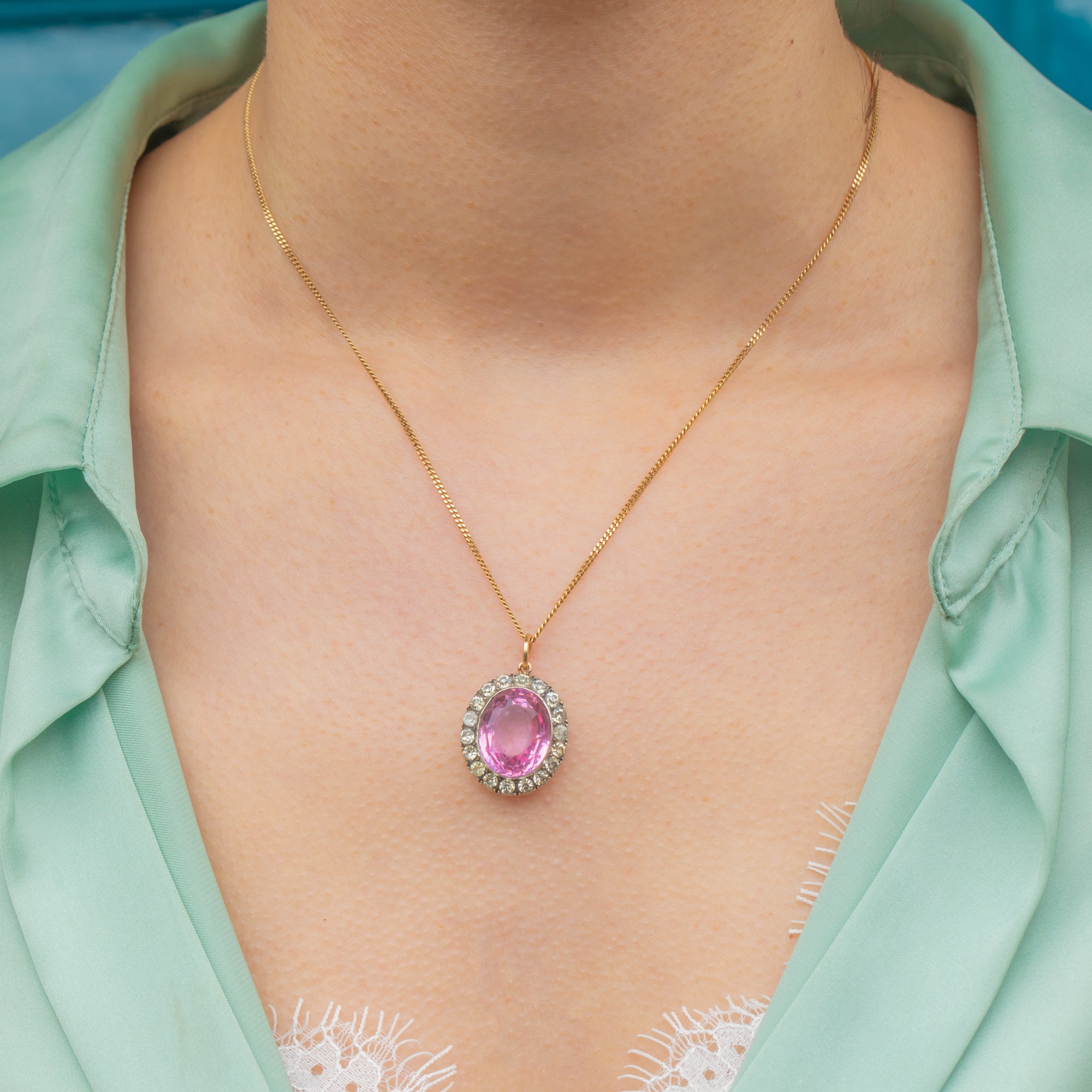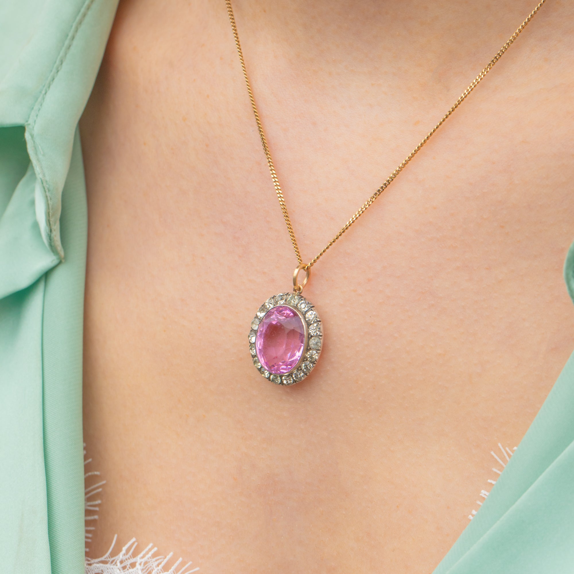 GOOD-VERY GOOD: This Edwardian Silver Pink Paste cluster pendant is in great condition, especially when considering its grand age. The gemstones are all present and securley set. The pink Paste has some small fleabites, noticeable under close inspection, but it still sparkles brightly in the light. Some of the white Paste has dulled over the years, commensurate with age, additing to the pendant's antique charm. The Silver is robust with a lovely antique patina, and although there are signs of a conversion on the back, this cannot be seen during wear. Complete with a solid 9ct Gold jump ring, you can easily pair this Edwardian pendant with a Gold or Silver chain!