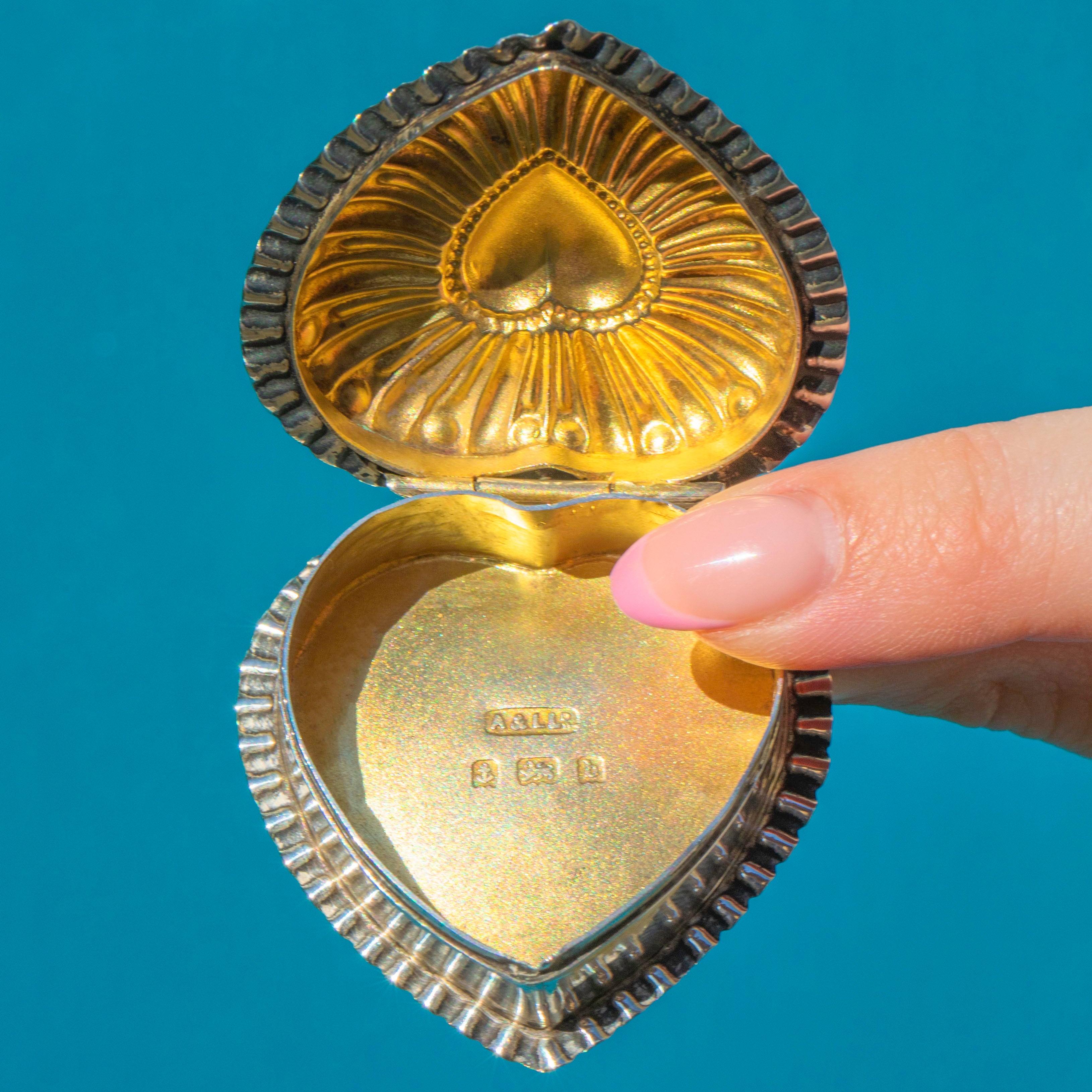 VERY GOOD. This Edwardian Silver repoussé heart trinket box is in very good condition! The repoussé detailing is pristine and flaunts a deep patina within the grooves emphasising its eye-catching form. The Gold gilt does have a few signs of wear but this does not affect her functionality and the hallmarks remain crisp allowing us to accurately date this antique collectible to 1901. With a lid that closes securely, you can store your most precious trinkets with utmost confidence!