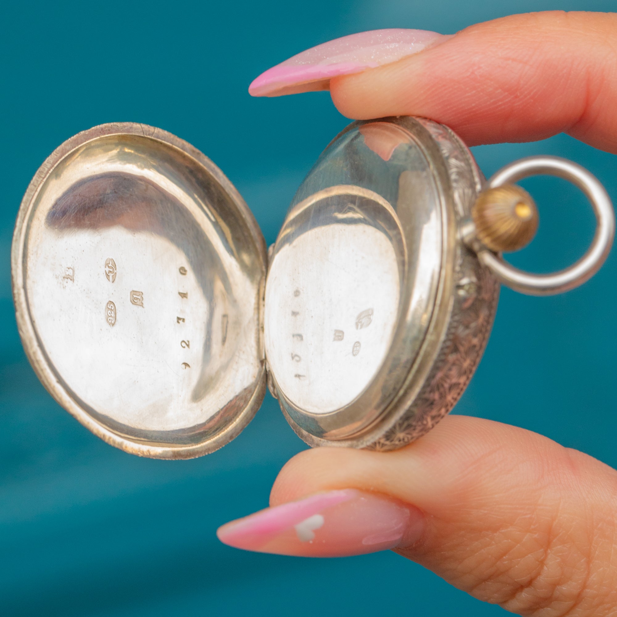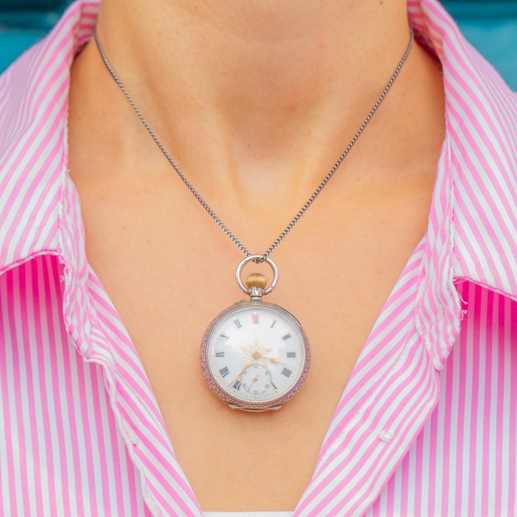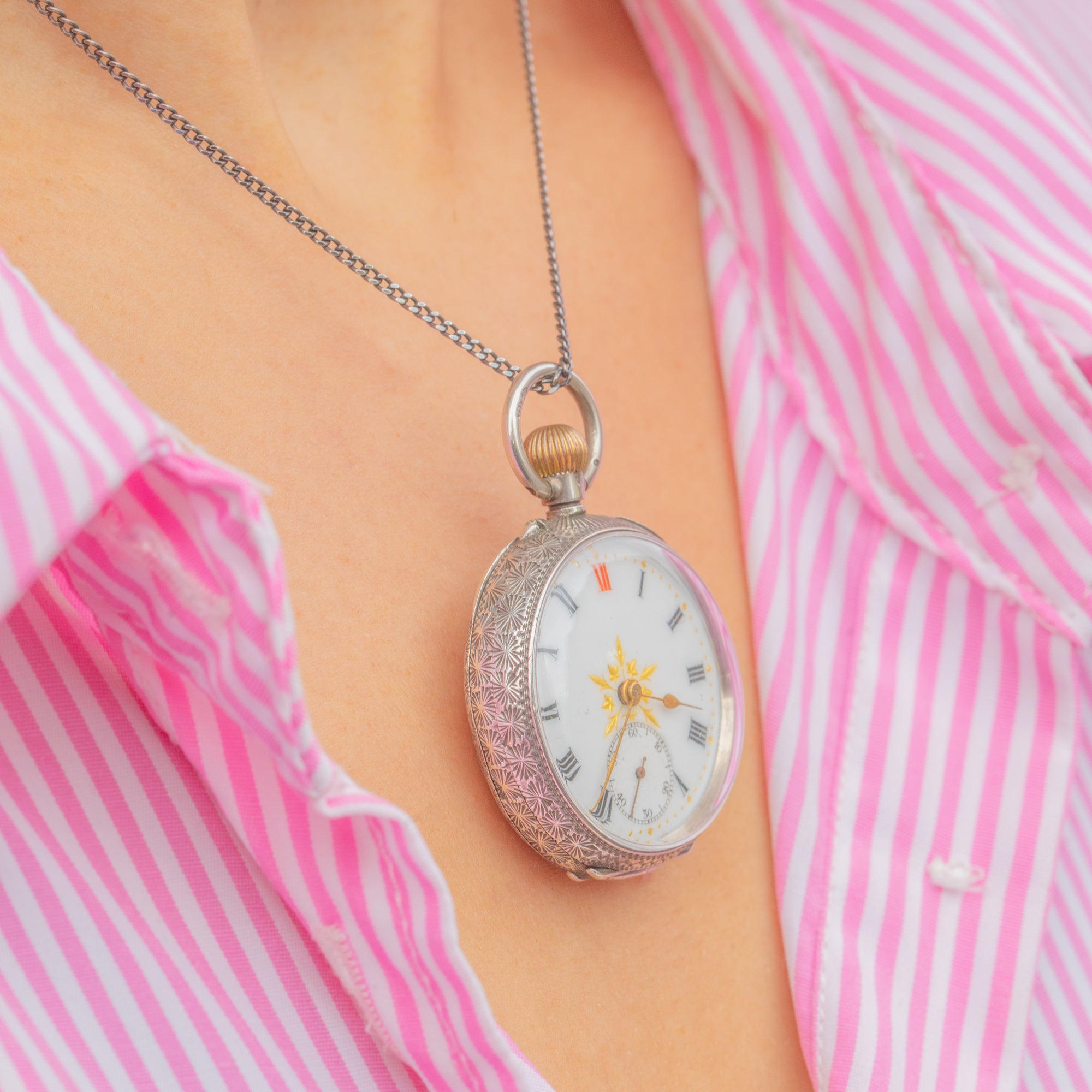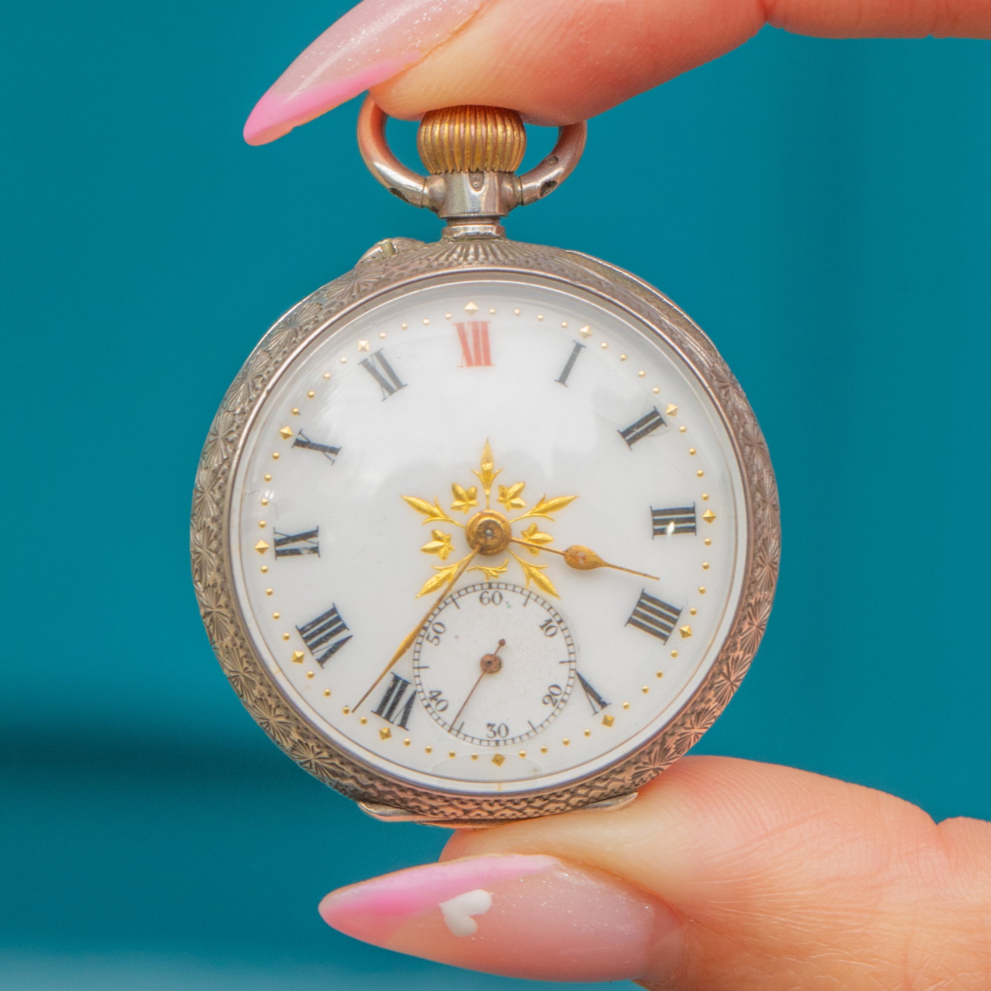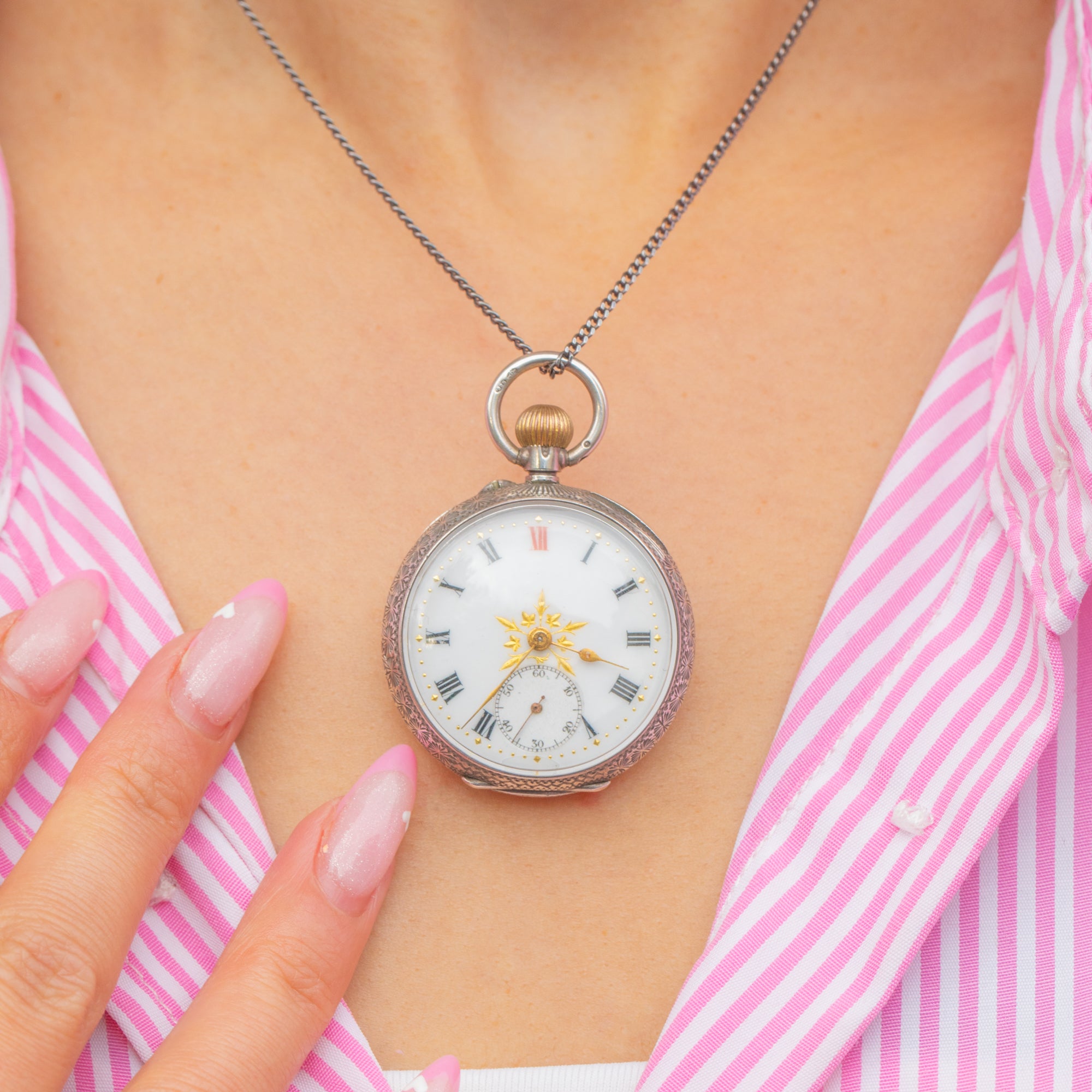 This elegant Edwardian pocket watch captures the refined craftsmanship of the early 20th century. Made in Switzerland and housed in a Sterling Silver case, it features a crisp white Enamel dial with Roman numerals and a delicate gilt floral centre. The Gilt hands and red XII add a charming touch of colour and sophistication.