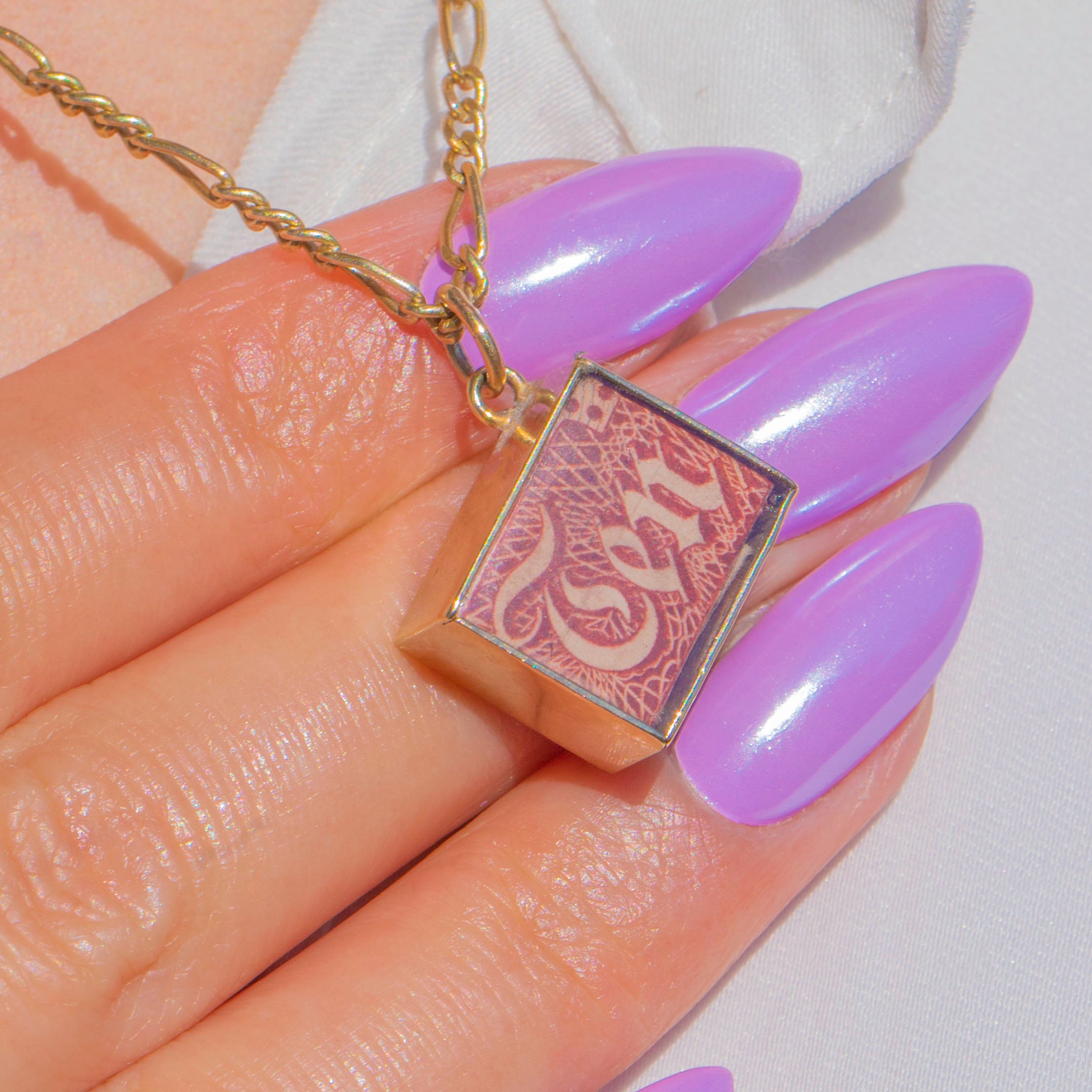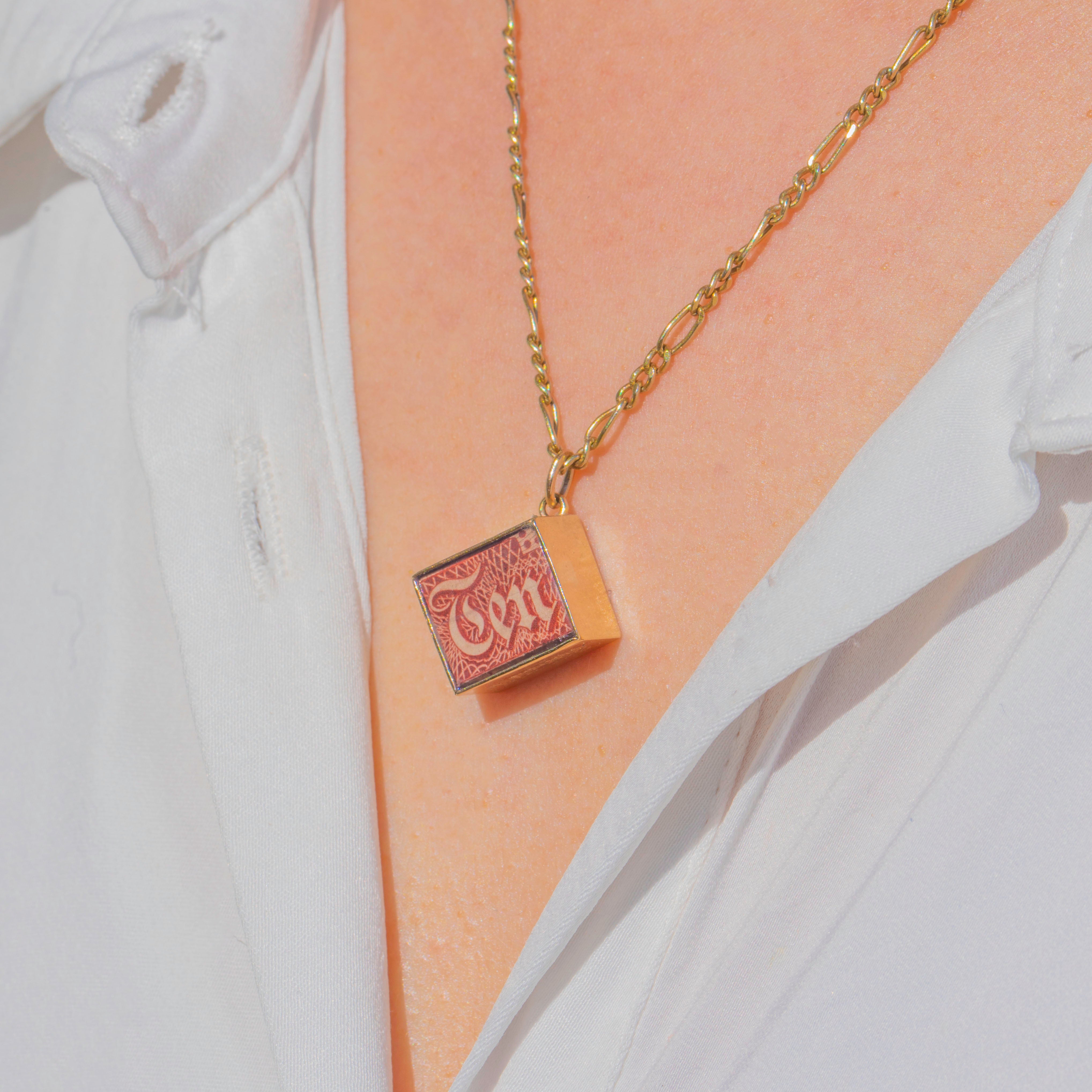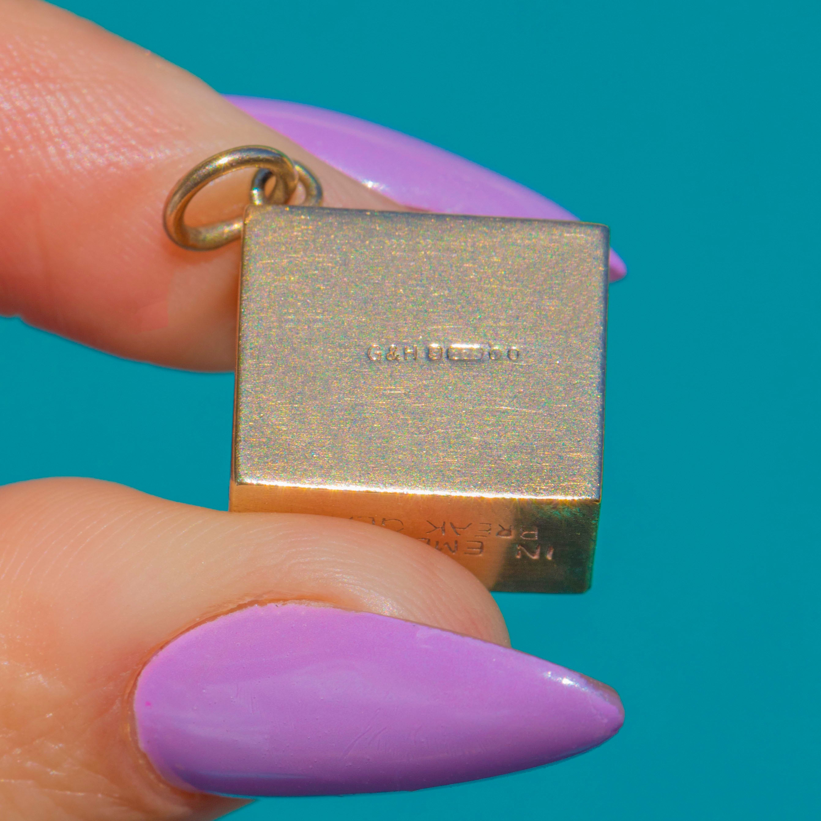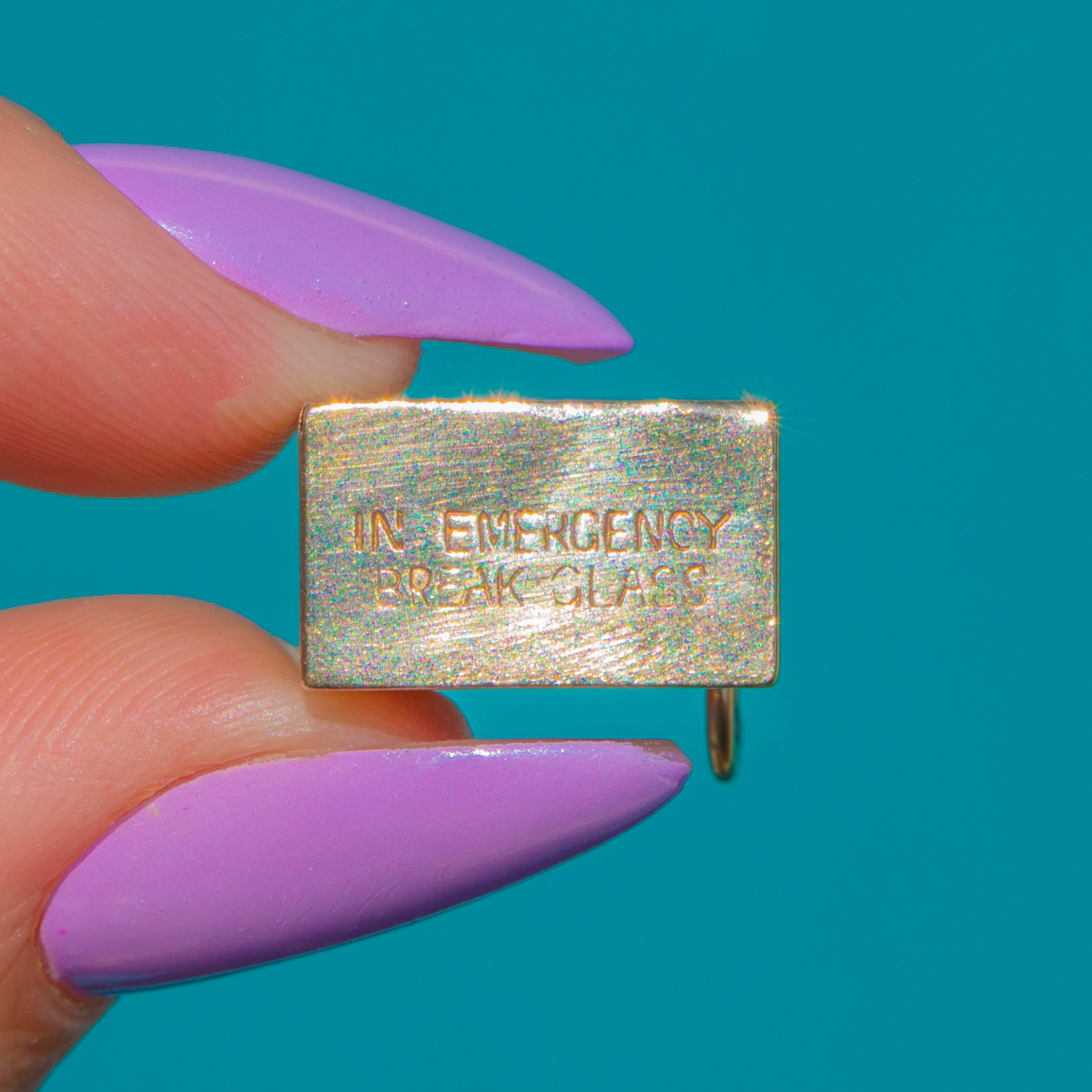 A witty slice of mid-century charm, this 9ct Gold “Emergency Ten Shilling Note” piece captures the playful spirit of novelty jewellery with elegant execution. The neat rectangular Gold bezel frames a vivid Ten Shilling motif beneath a clear protective cover, bearing the tongue-in-cheek legend “IN EMERGENCY BREAK GLASS”. Refined polished edges and warm golden tones elevate the graphic design, making it as collectible as it is stylish.