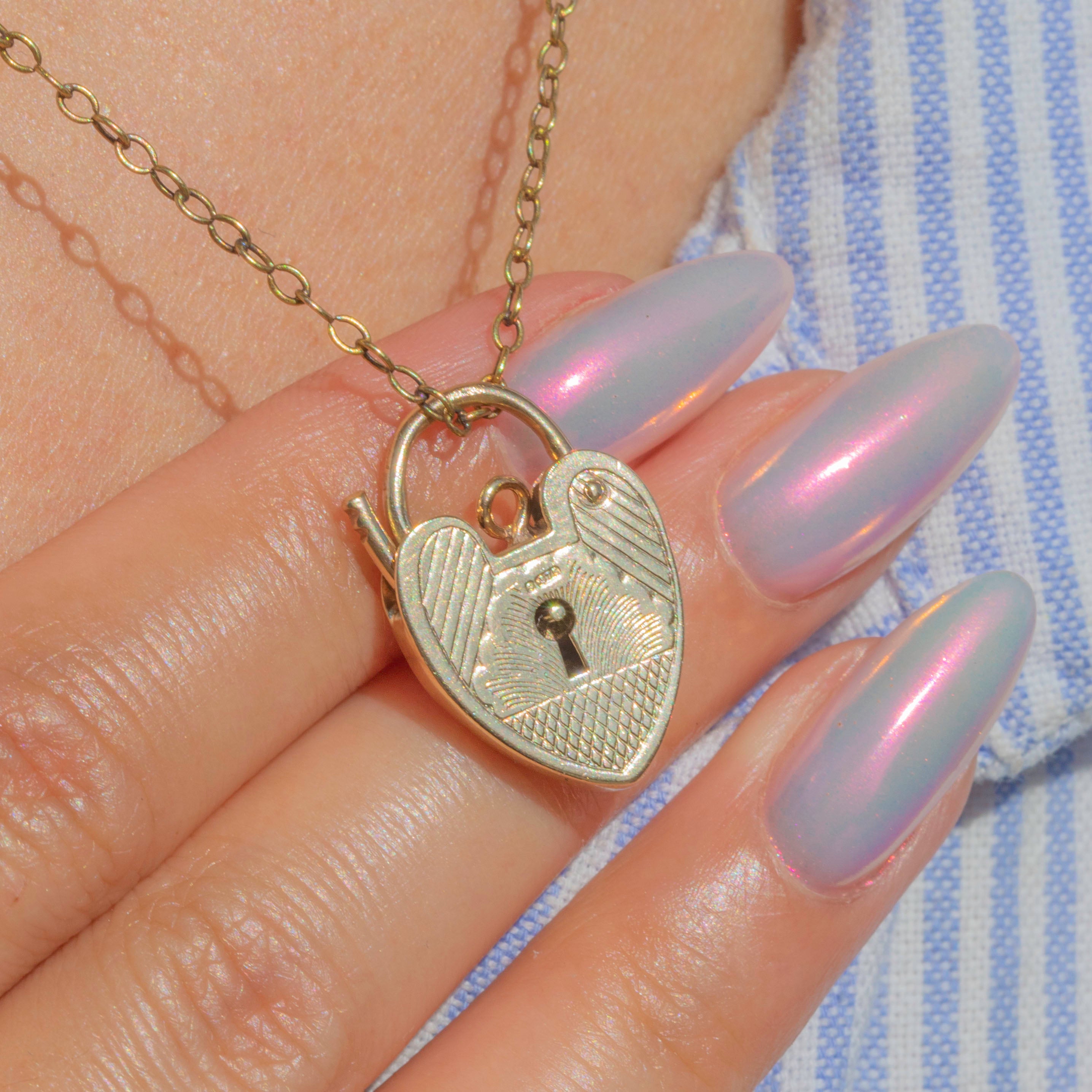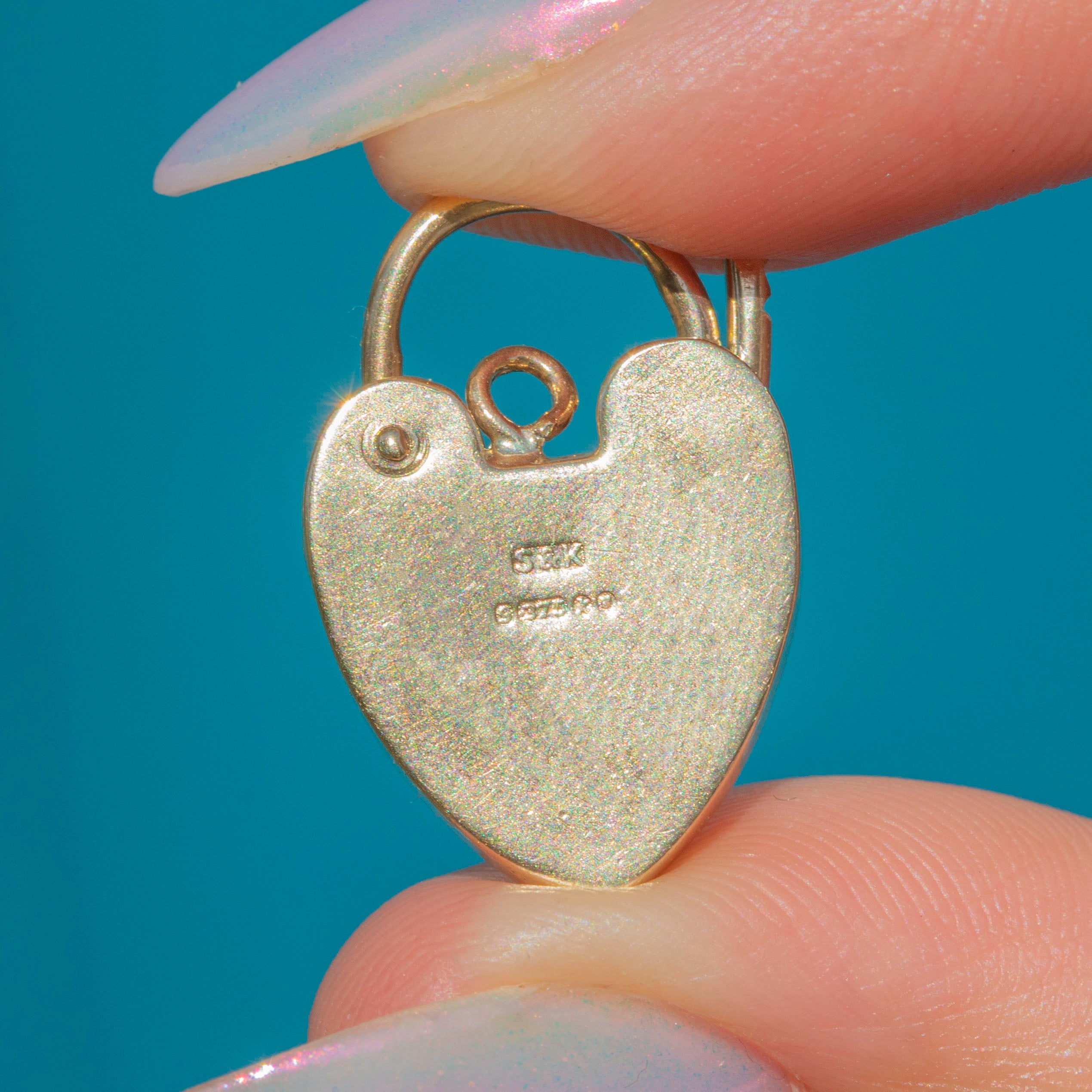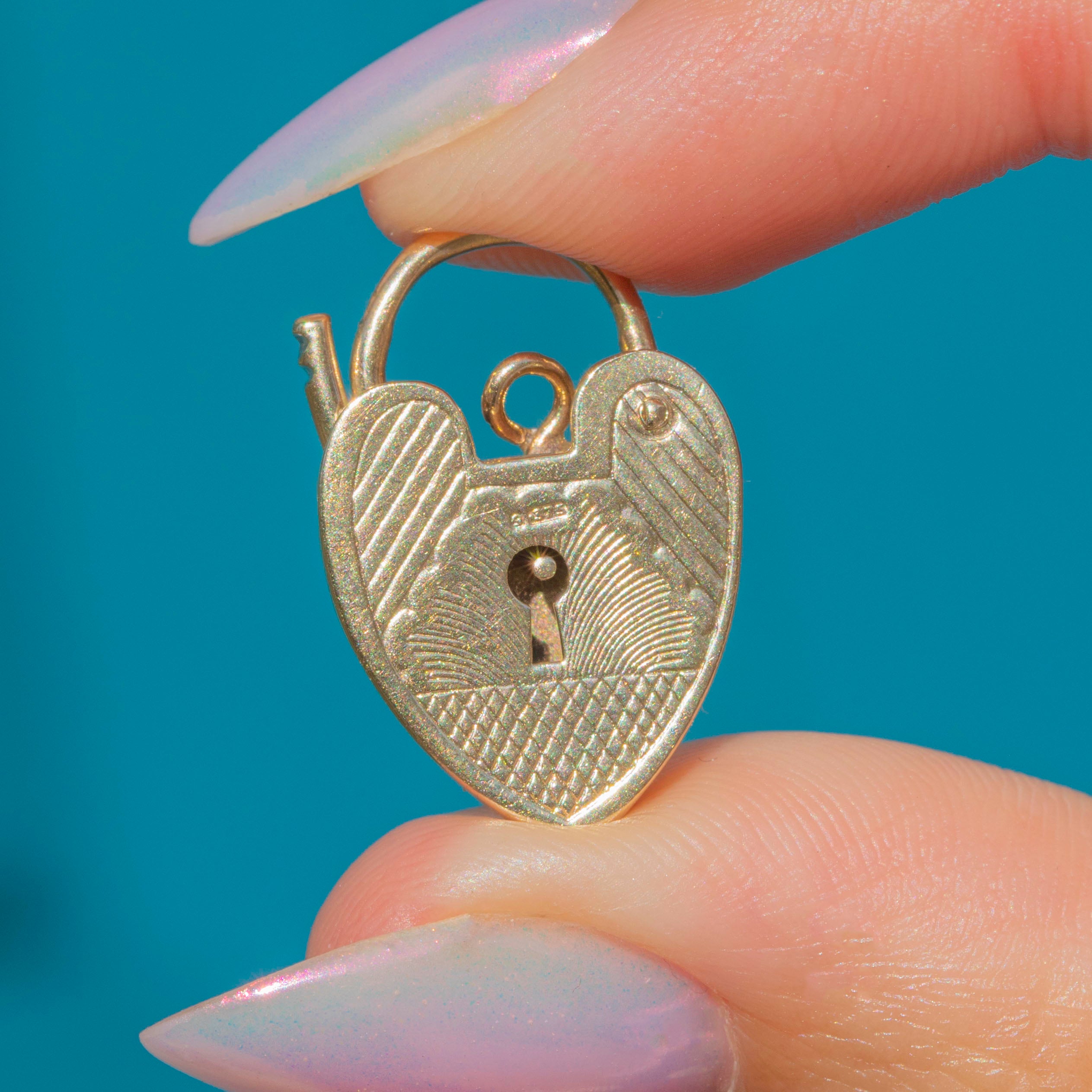 EXCELLENT: This English 9ct Gold engraved scallop heart padlock pendant is in fabulous condition. The Gold is brightly saturated and the engravings are crisp and clear, with only minor wear to the back of the pendant. The structural integrity of the padlock has held up well over the course of her lifetime. With her locking mechanism closing with a satisfying 'click', she can be worn with the utmost confidence!
