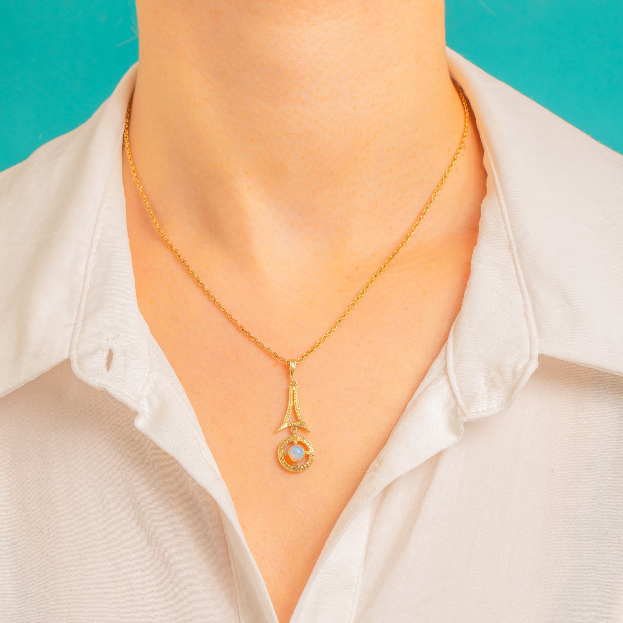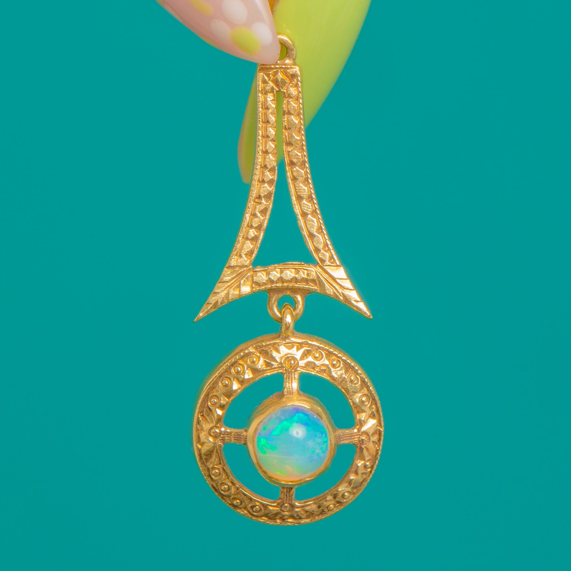 Alive with delicate movement and vintage charm, this engraved 14ct Gold drop pendant centres on a luminous round Opal cabochon. The articulated two-part silhouette pairs a tapered, engraved top with a circular openwork rondel, the Opal held in a smooth bezel and framed by fine milgrain and chased detailing. It’s a refined study in geometry and light, with a bright, polished finish that catches the eye.