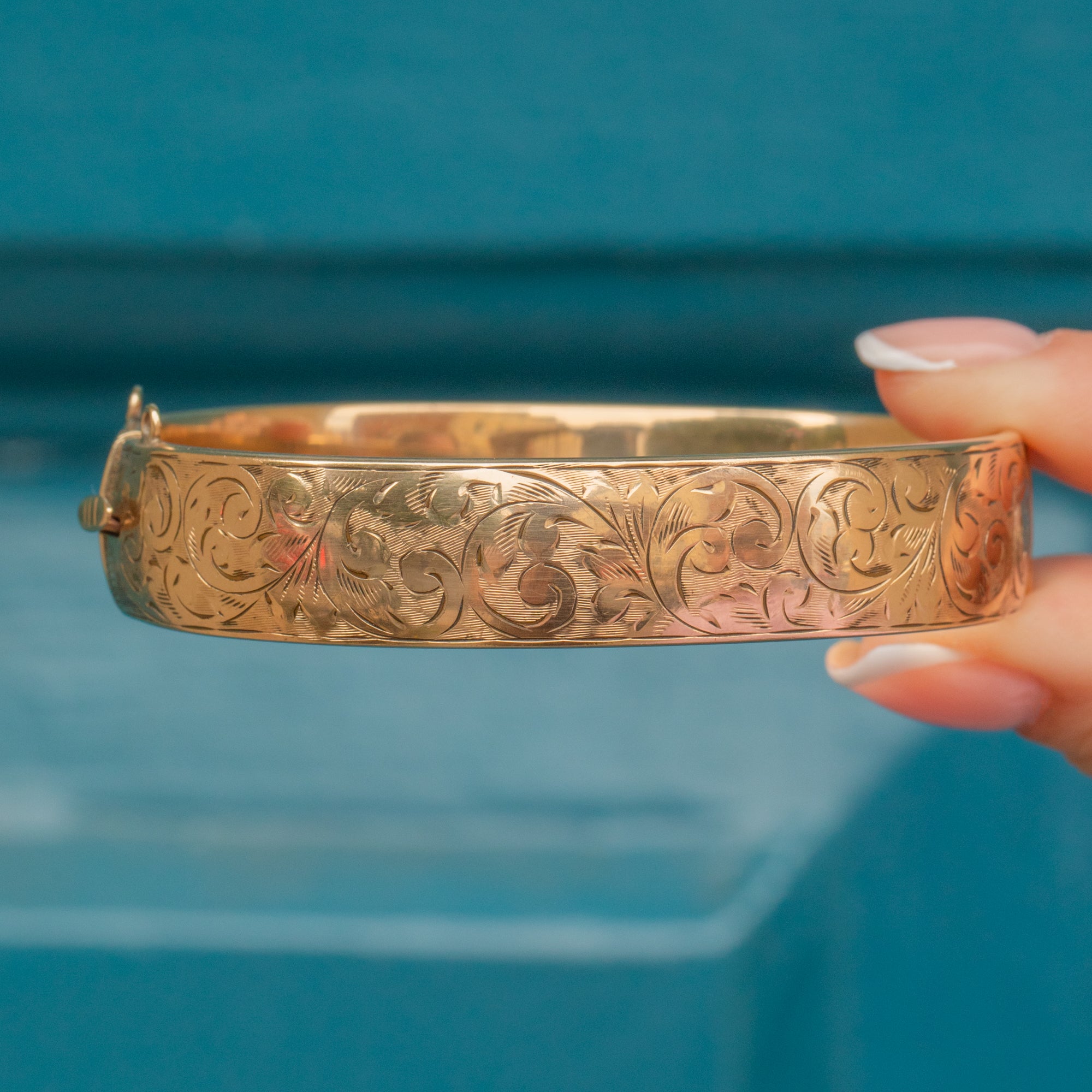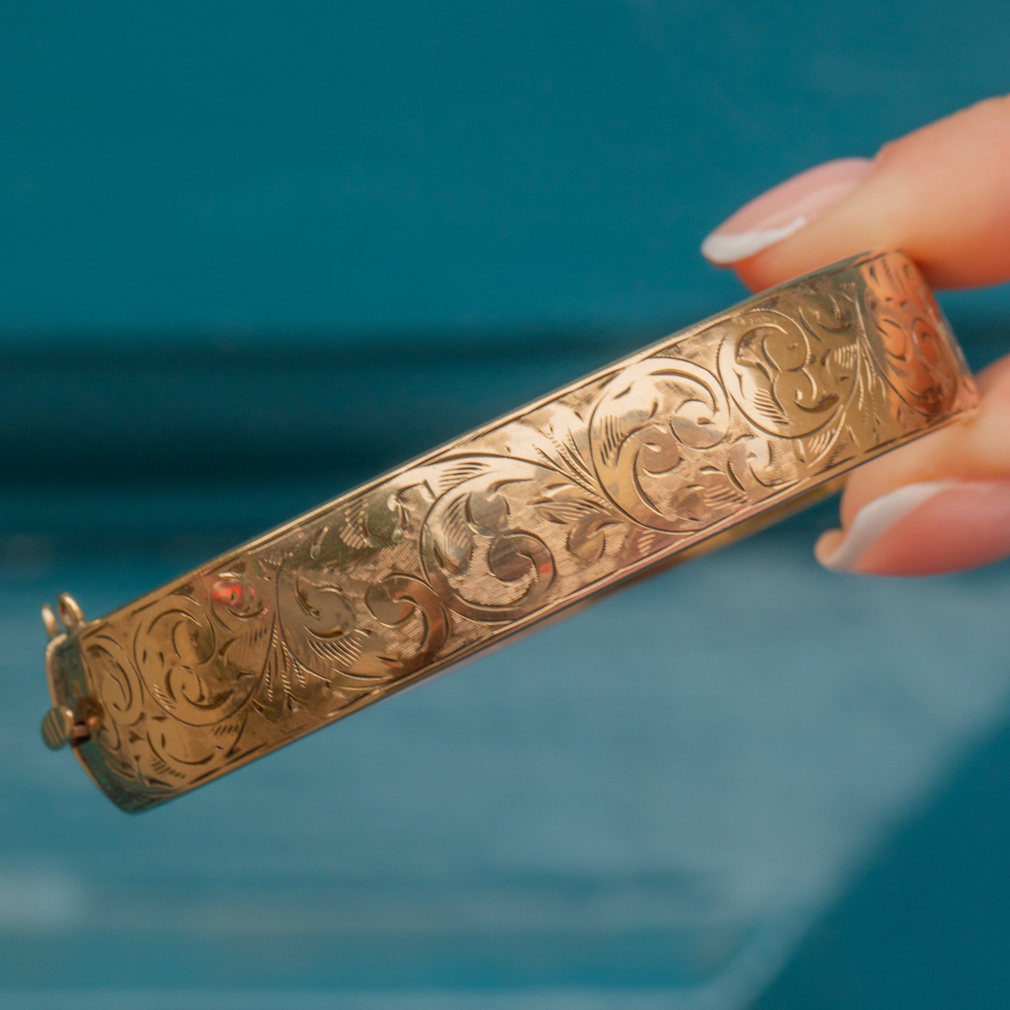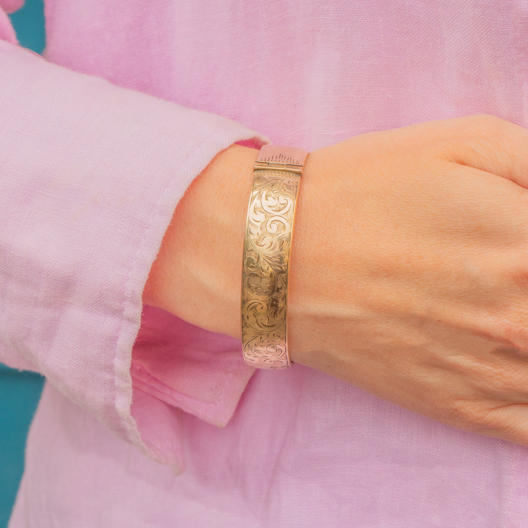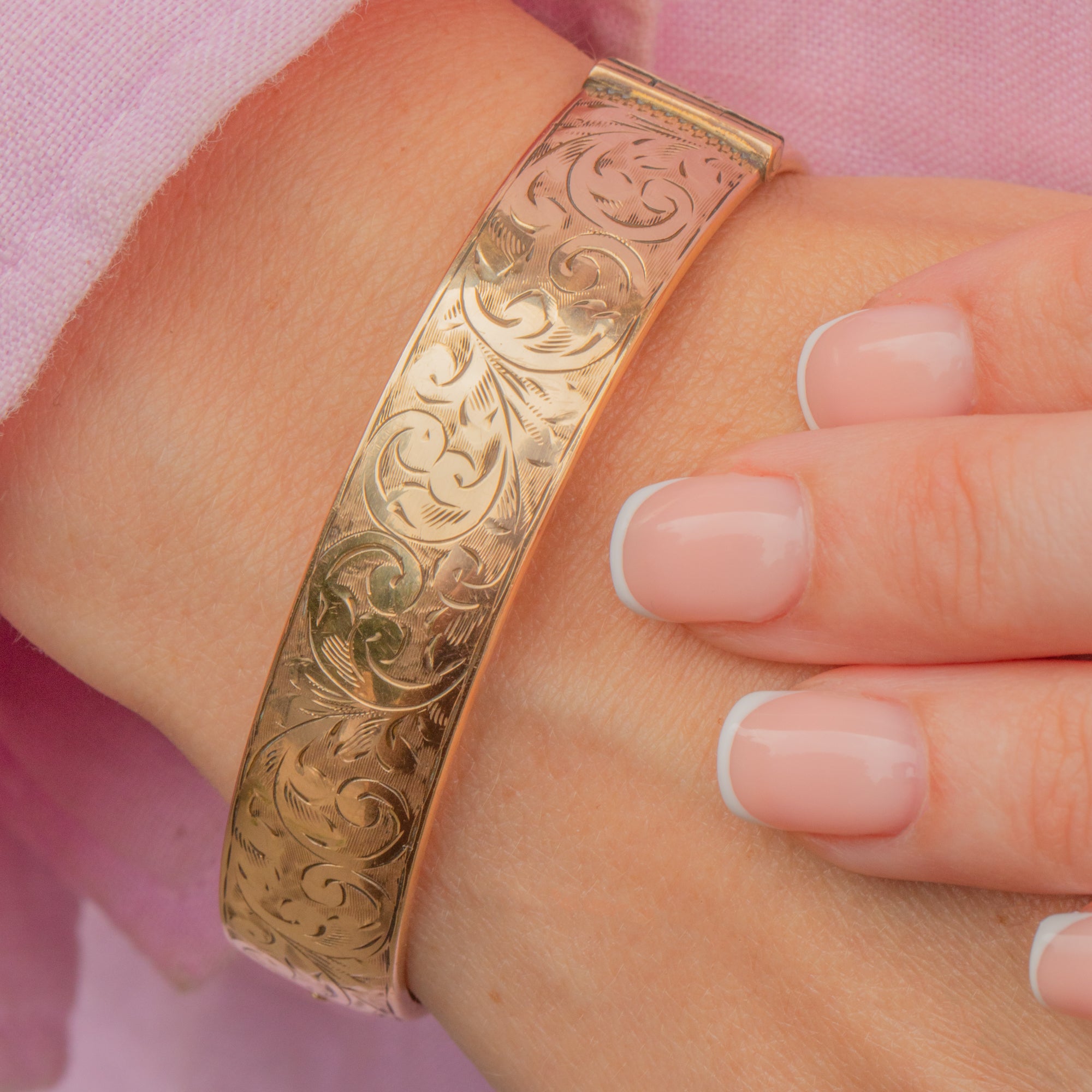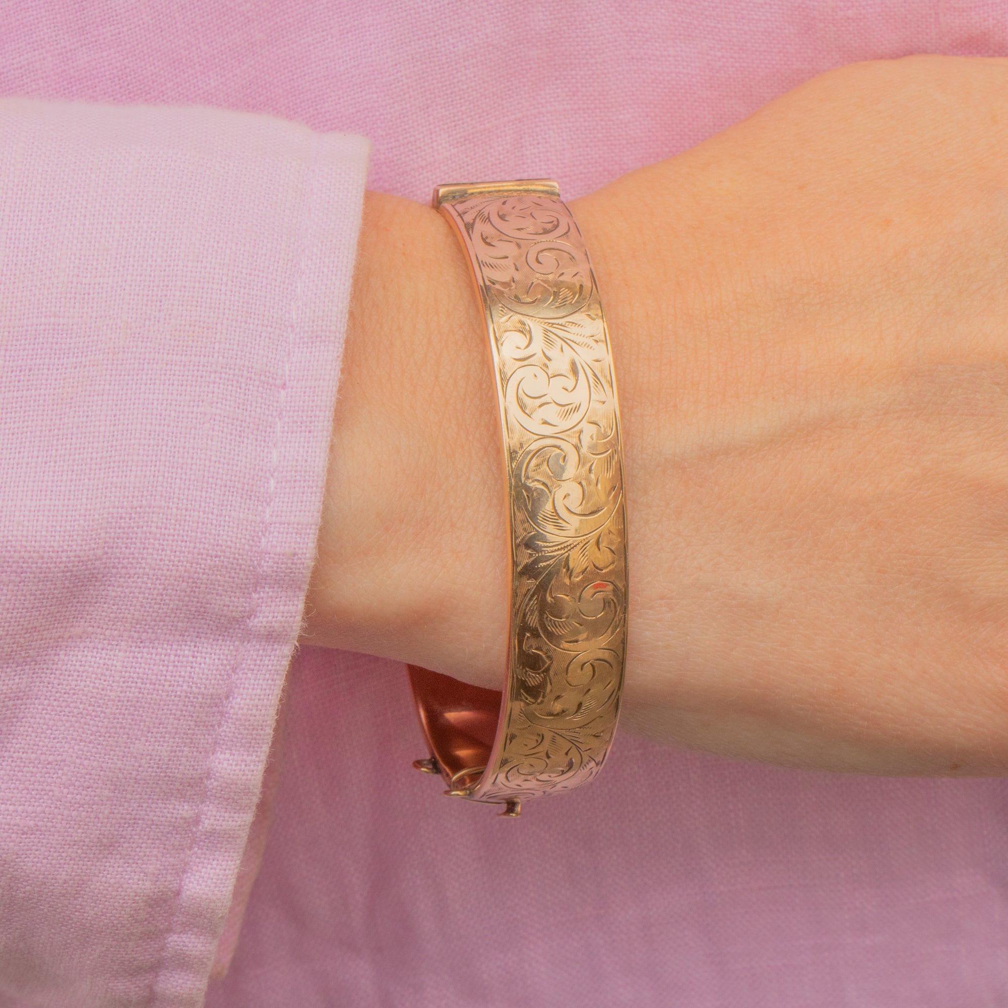 Prepare to fall in love with this engraved 9ct metal core bangle. Bursting with feminine charm, we can't get enough of her sweeping floral engravings covering her front, catching the light as you move.