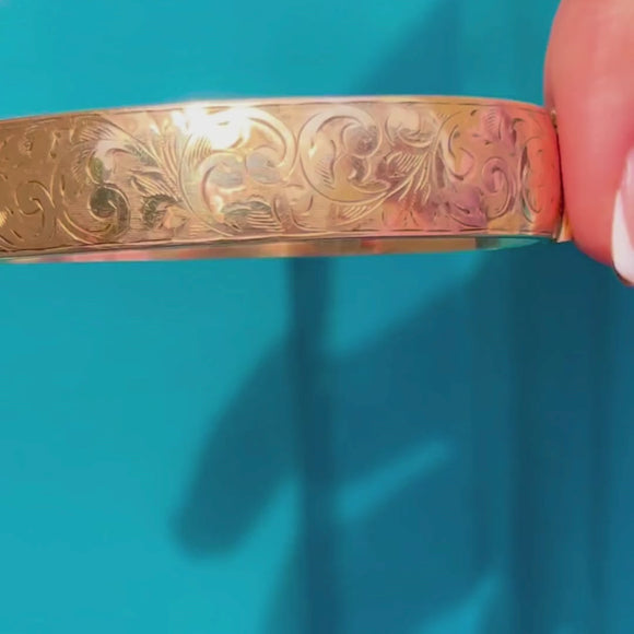 EXCELLENT - We bring this engraved 9ct metal core bangle to you in superb condition. The 9ct Rolled Gold is akin to sunshine - rich, buttery and radiant! The engravings are crisp with no signs of wear to note and she even has two loops to add a safety chain yourself if you desired.