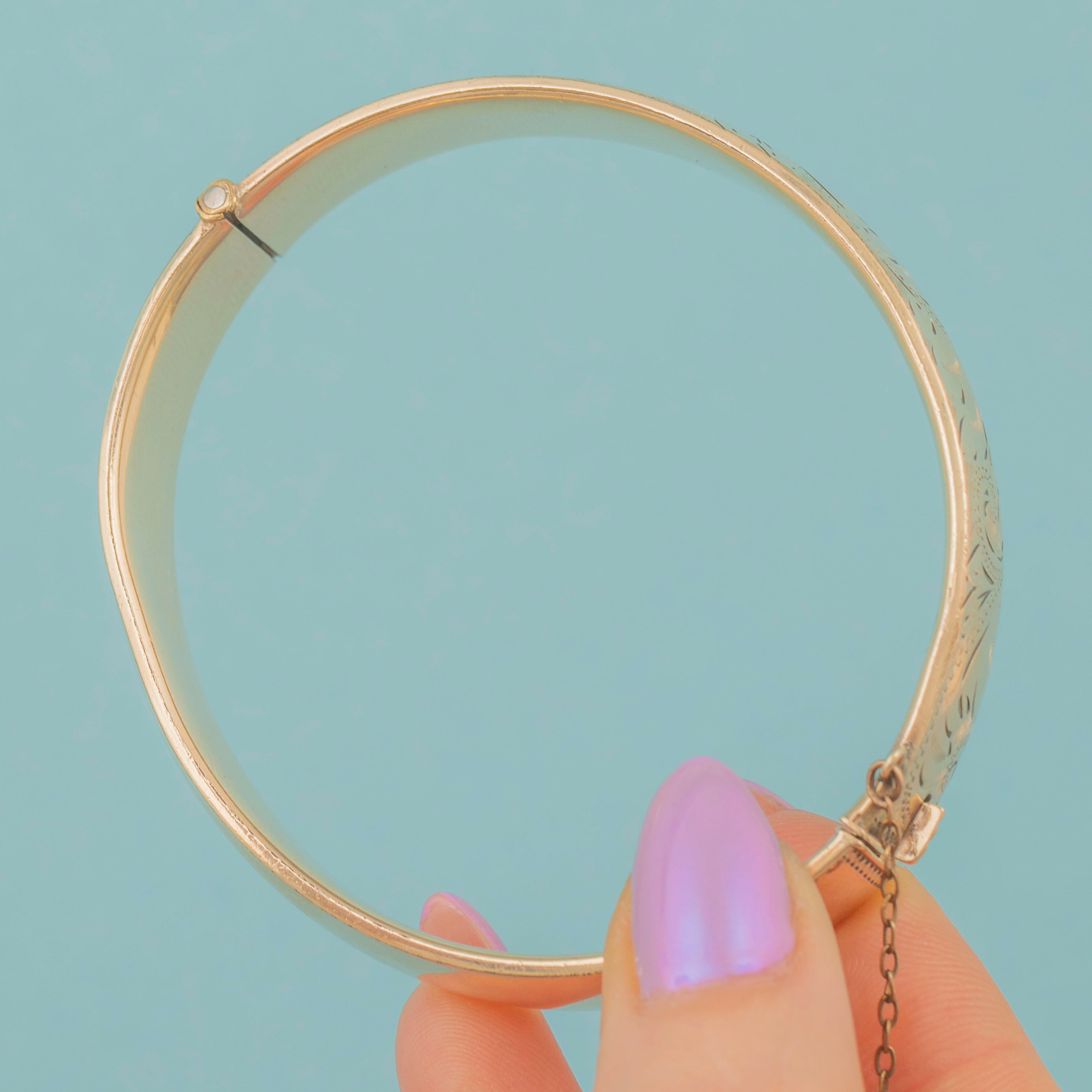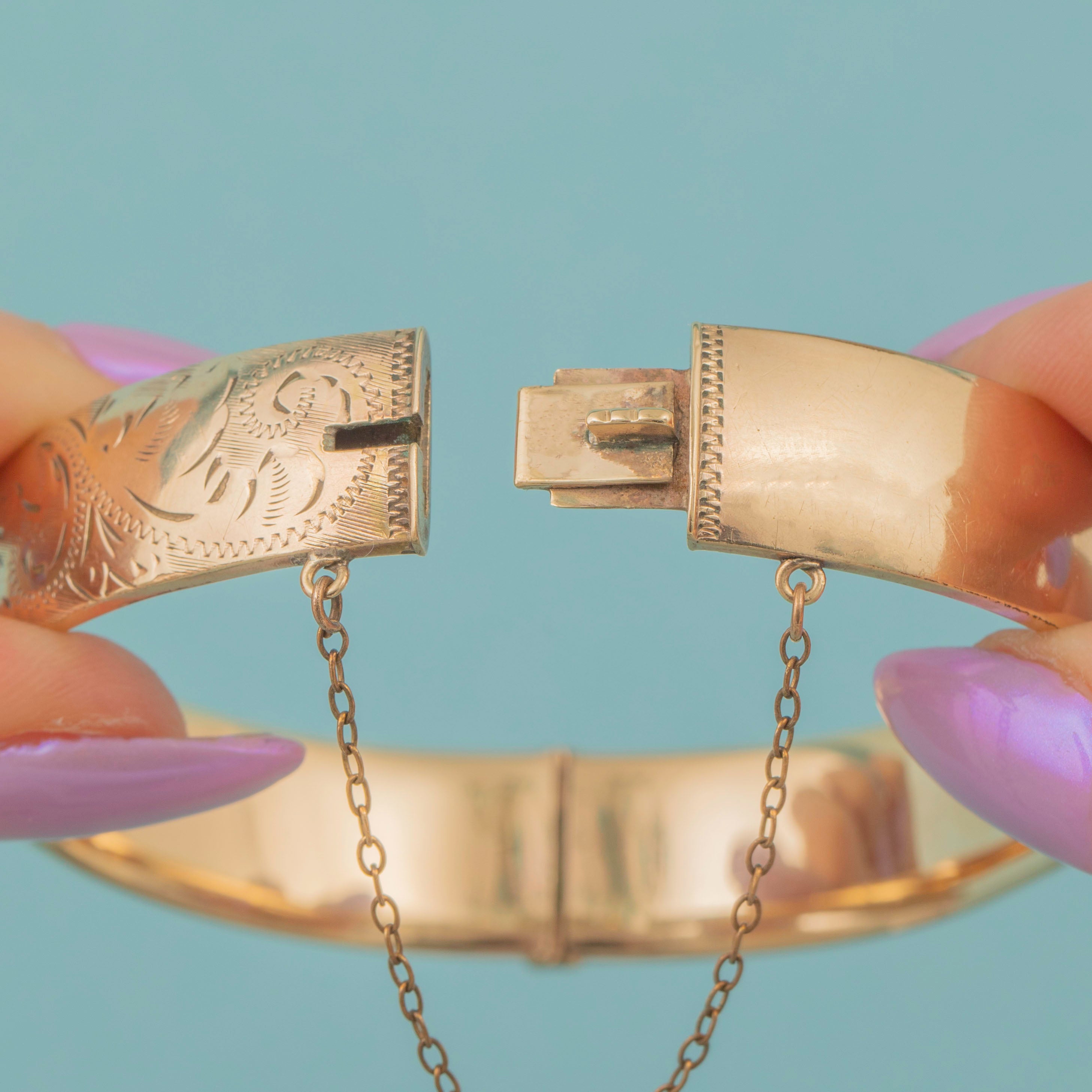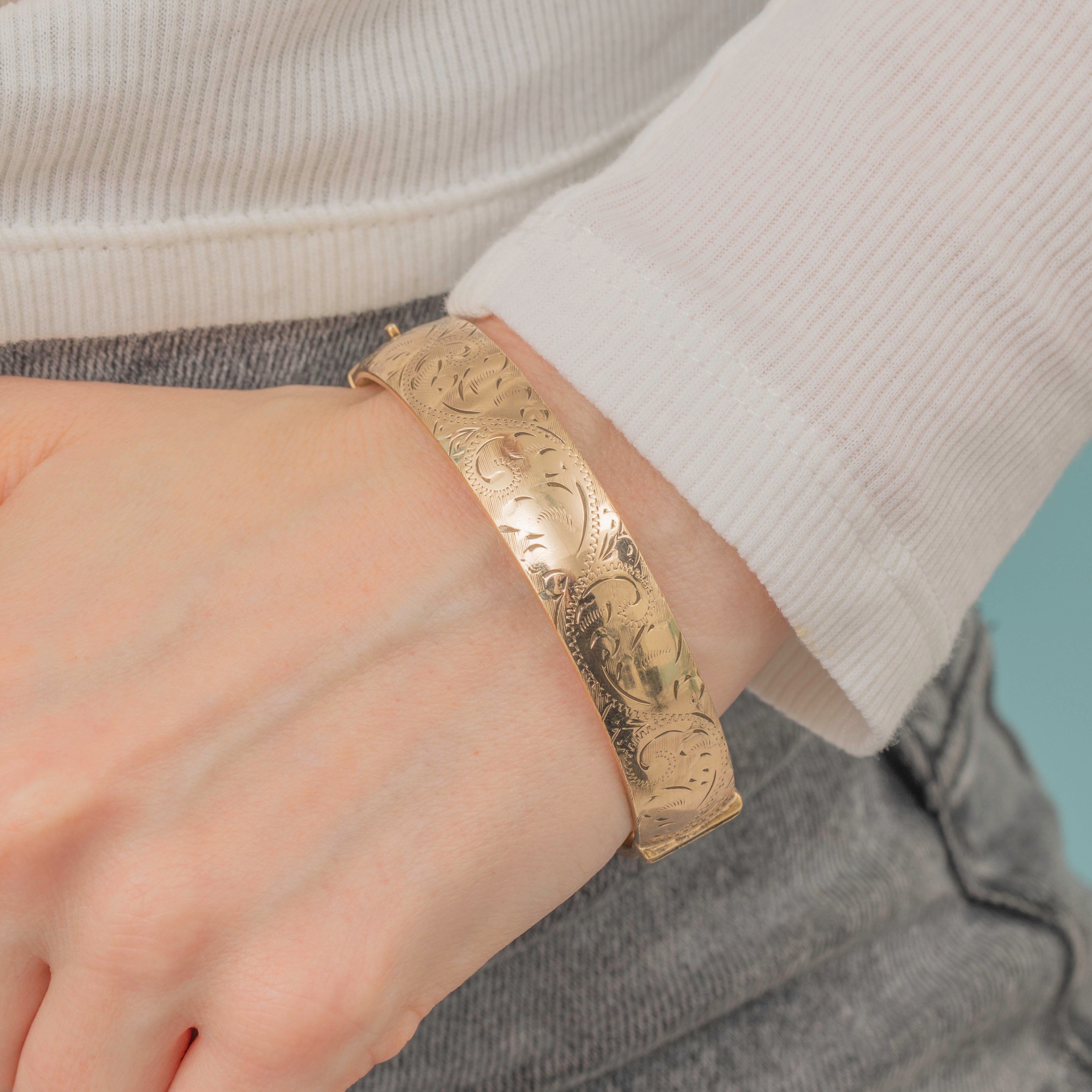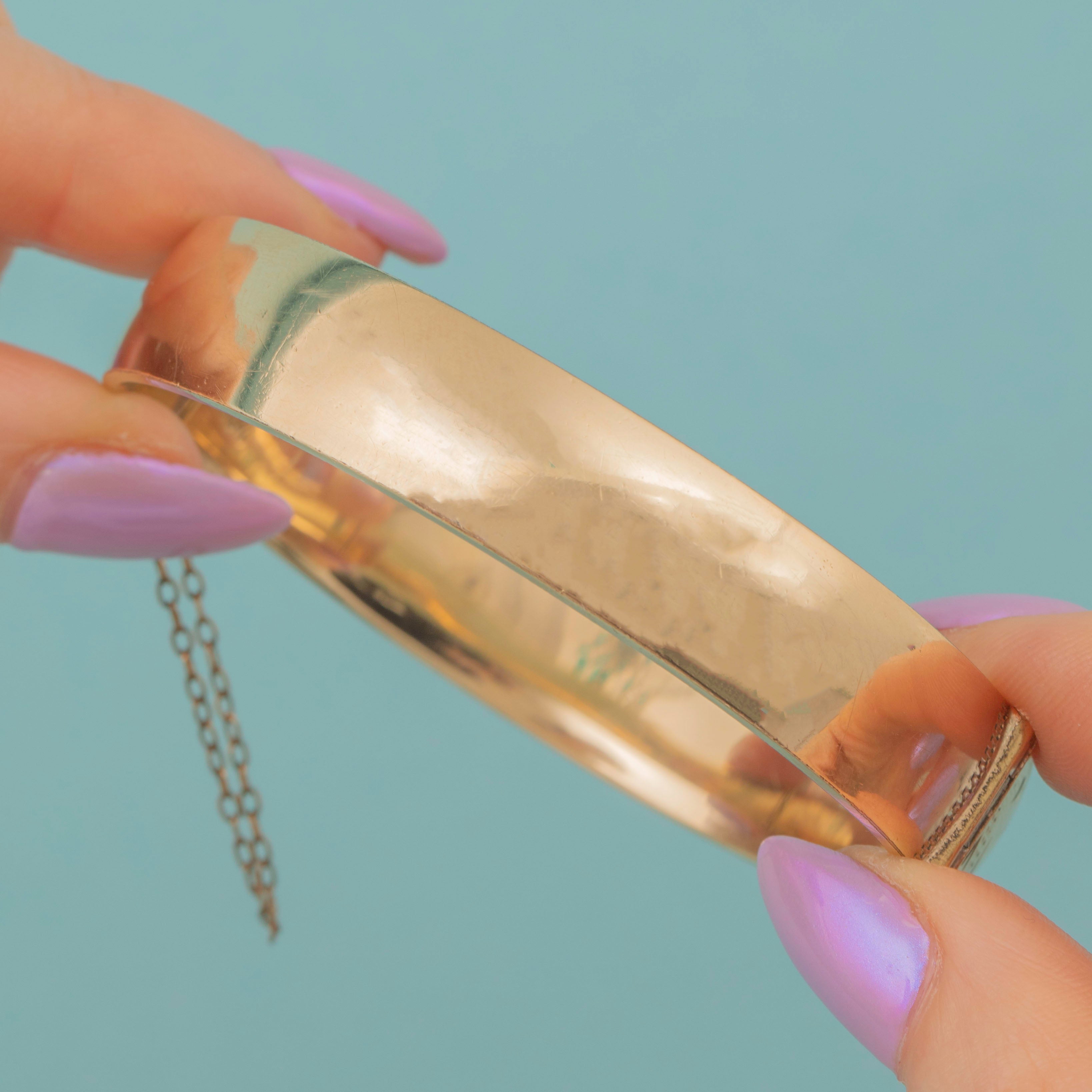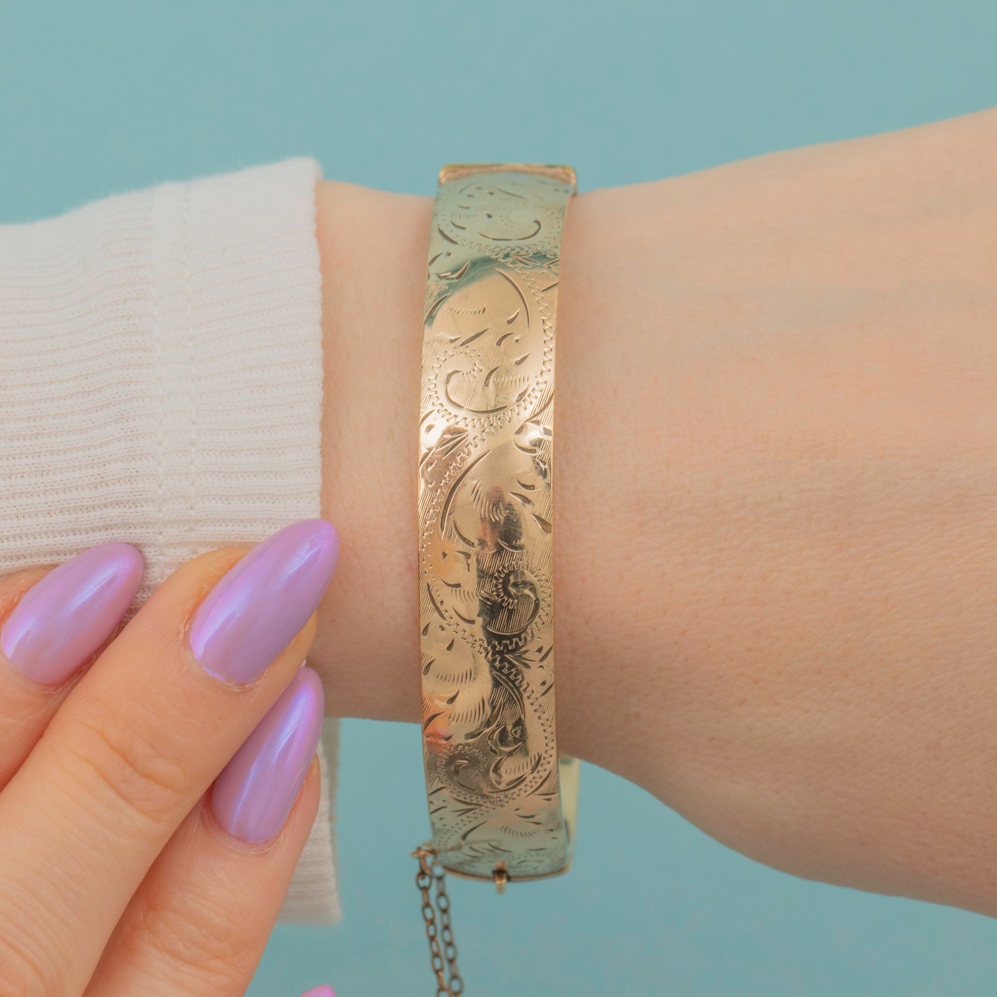 GOOD. This engraved 9ct rolled Gold bangle is in good condition, featuring a rich Gold tone and lovely engravings. Both the hinge and slide clasp are in perfect working order. The Rolled Gold on the inside of the bangle shows noticeable wear, though this won’t be visible when worn, and some of the engraved details have worn over the years. The safety chain adds an extra layer of security, ensuring this vintage bangle provides confident, secure wear for generations to come.