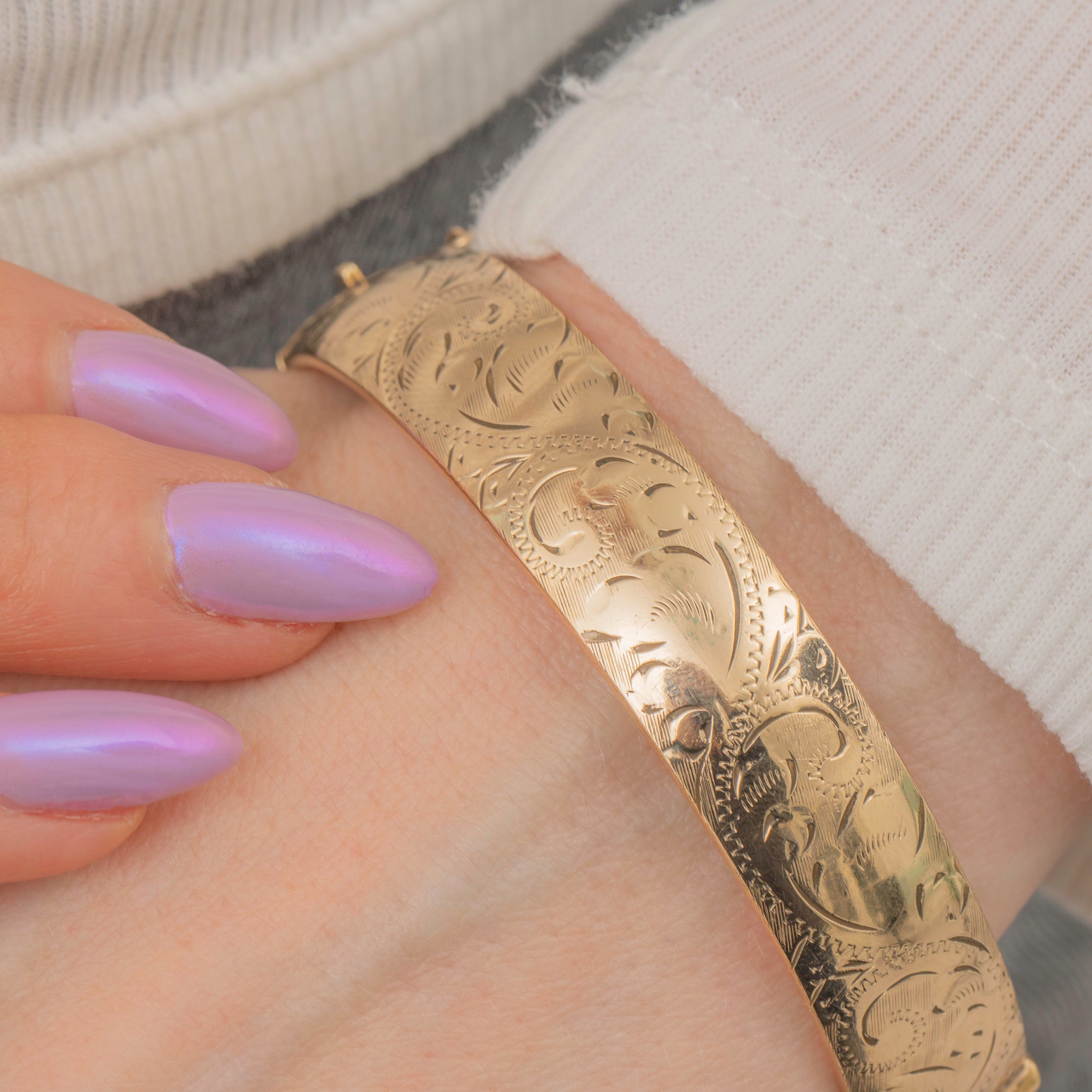 With mouthwatering buttery hues and sweeping acanthus leaf engravings adorning her front, this engraved 9ct rolled Gold bangle is the perfect piece of vintage jewellery to inject some femininity into your wrist stack.
