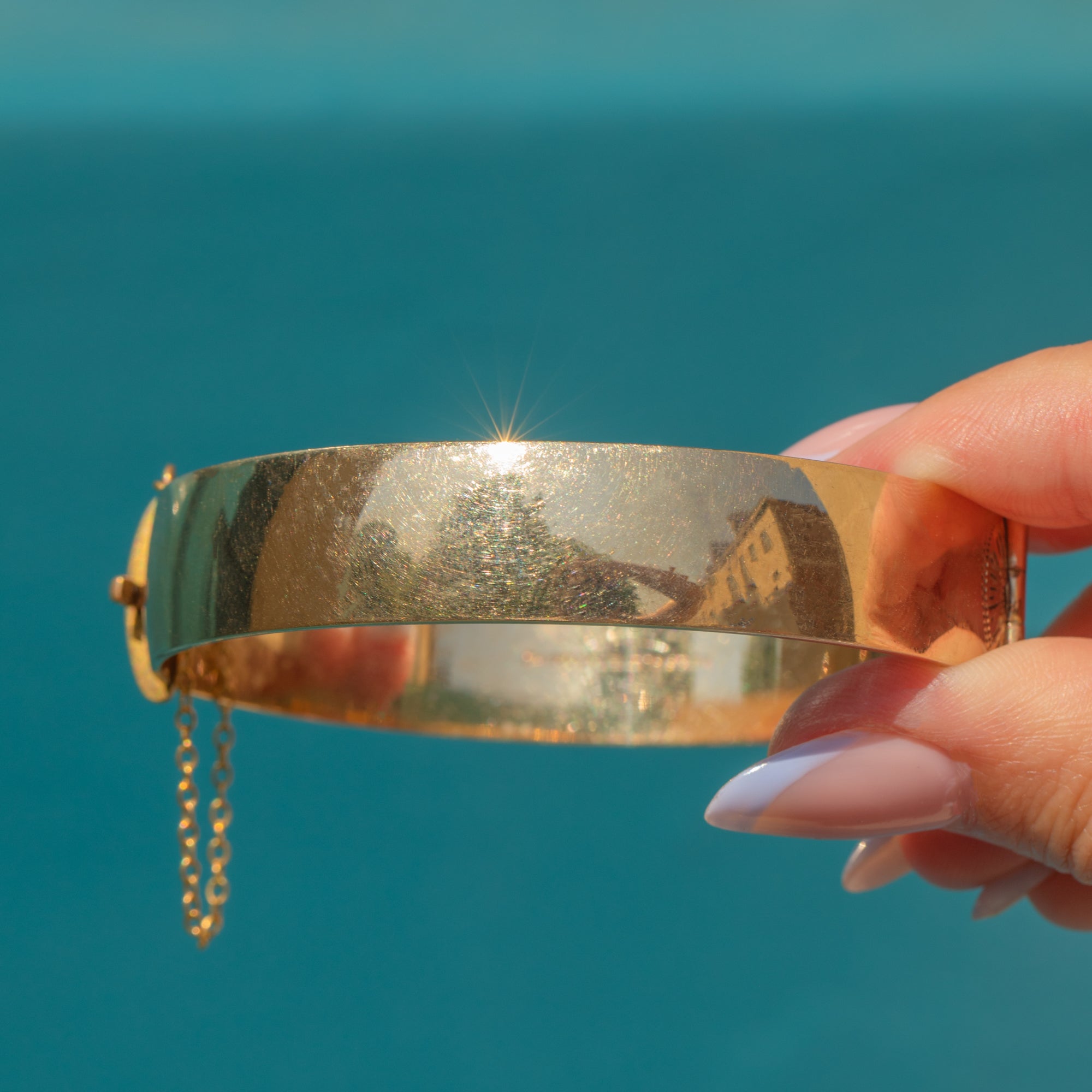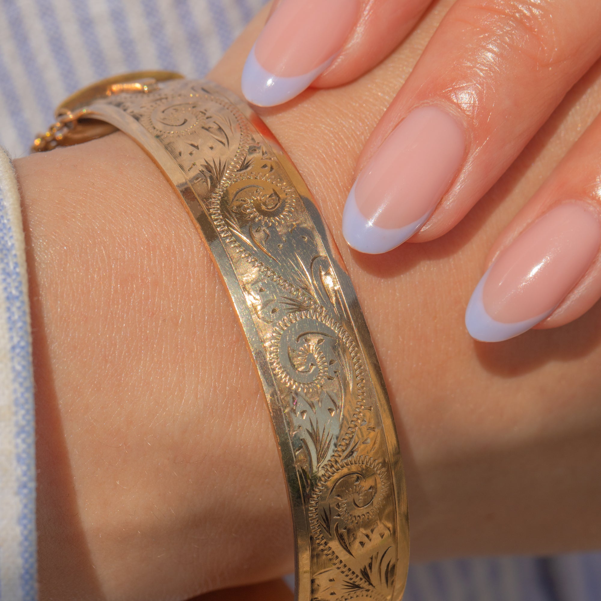 Featuring a classy engraved pattern, this vintage bangle will add a decorative finishing touch to your attire. Chunky 9ct buttery Gold bangles are the perfect versatile choice for a jewellery collection!