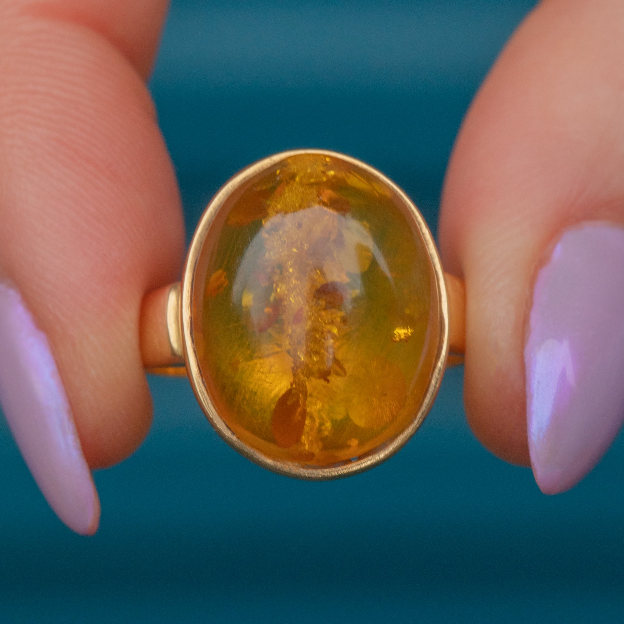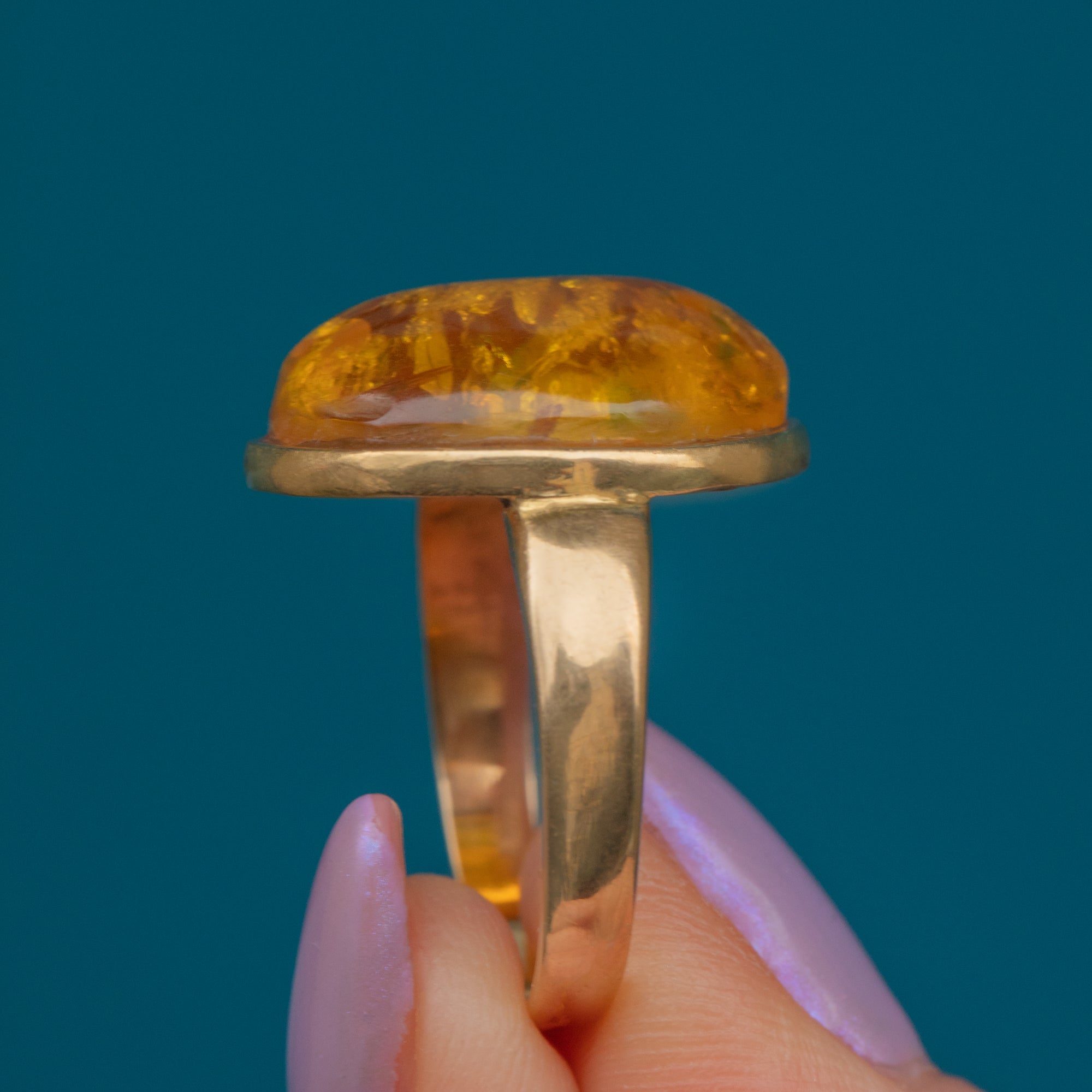 The ring provides the finger with ample coverage, and we love how the rich honey tones of the Amber fuse beautifully with the saturated 18ct Gold.