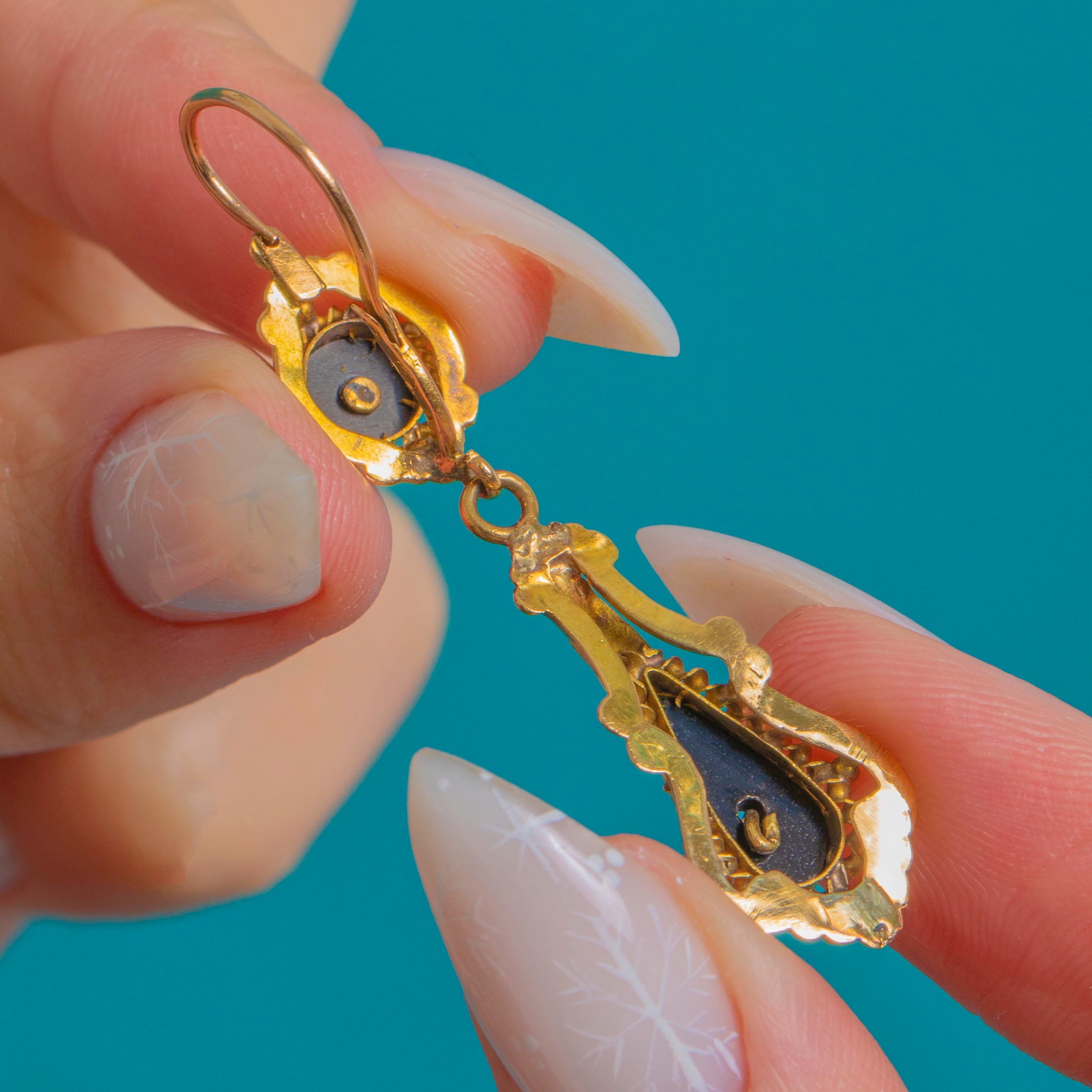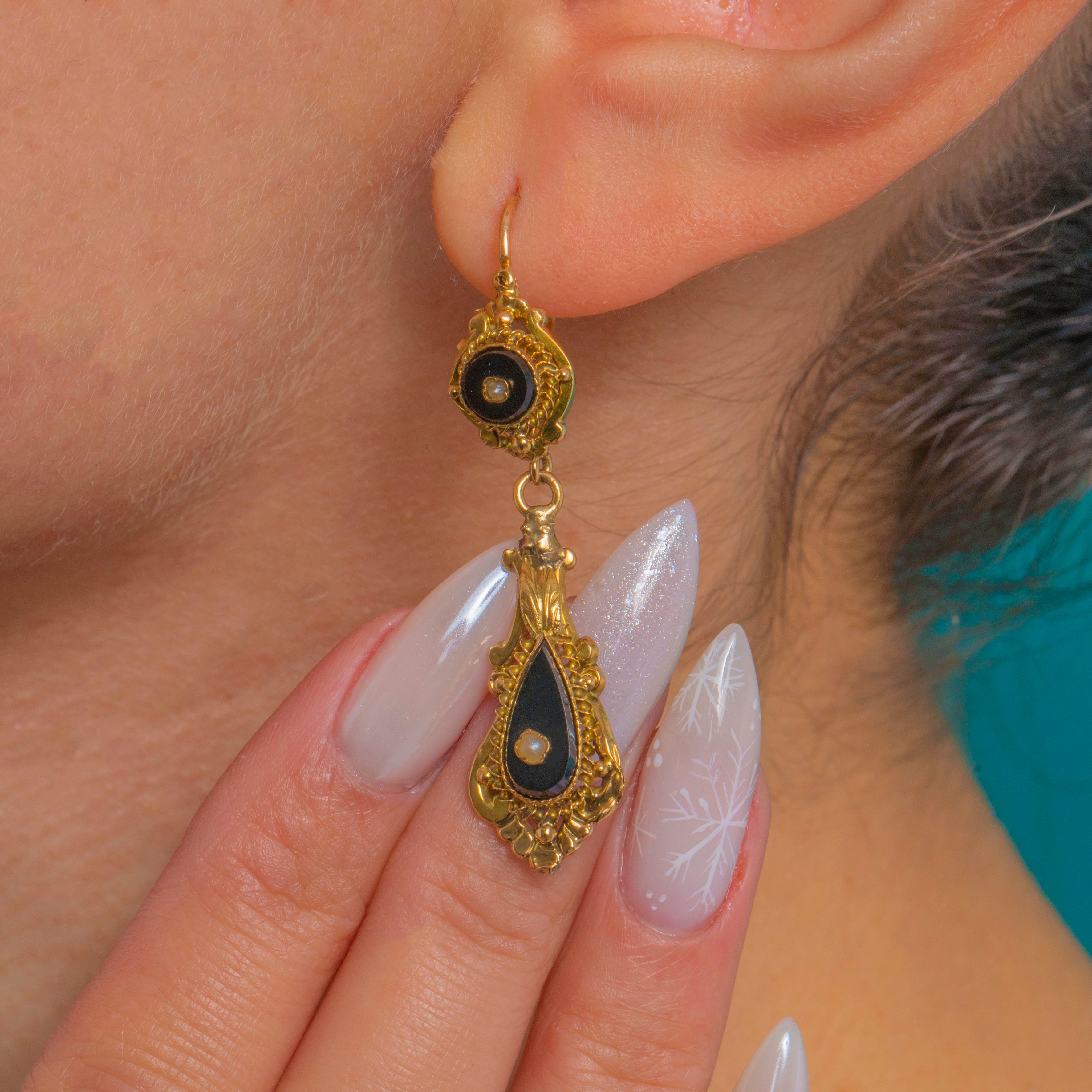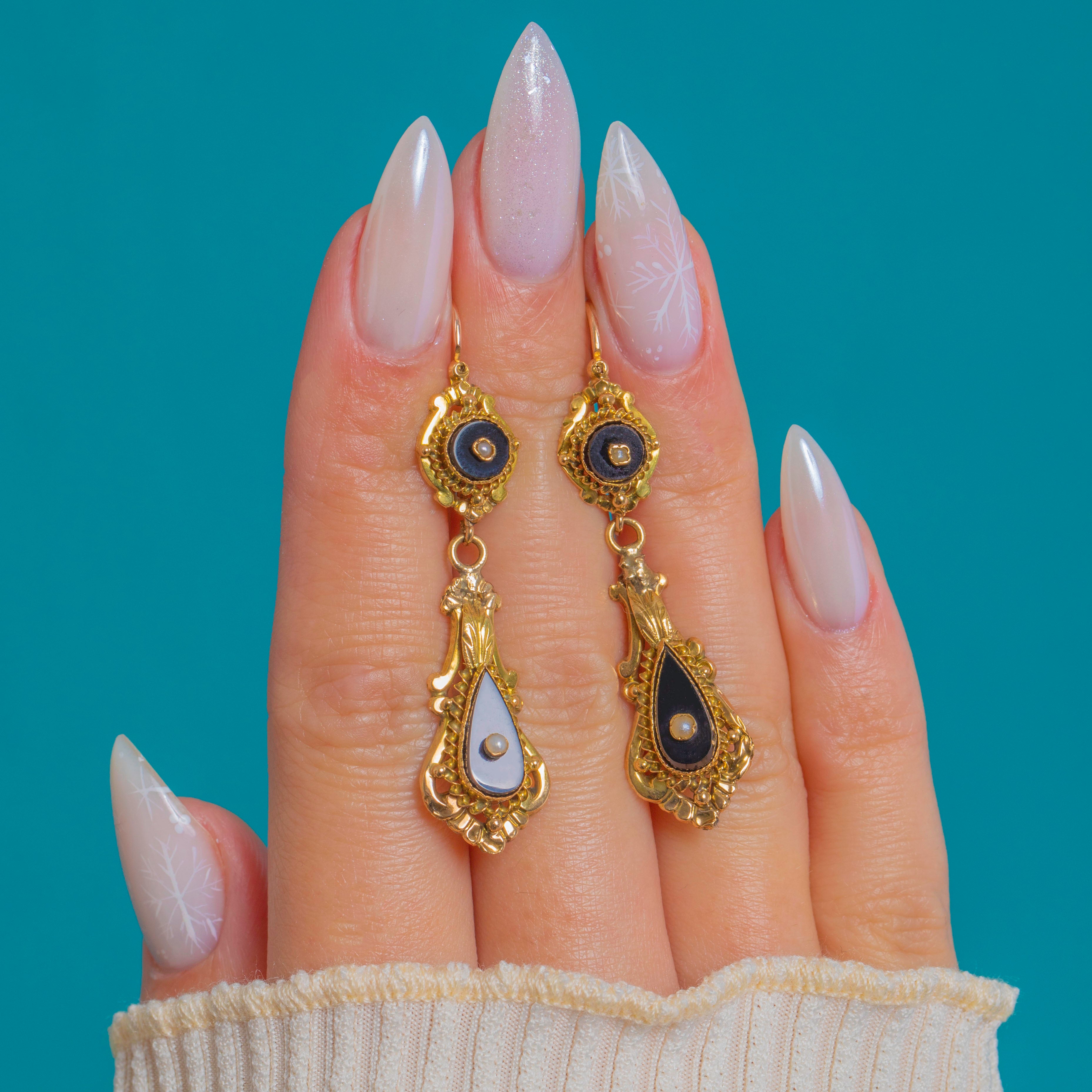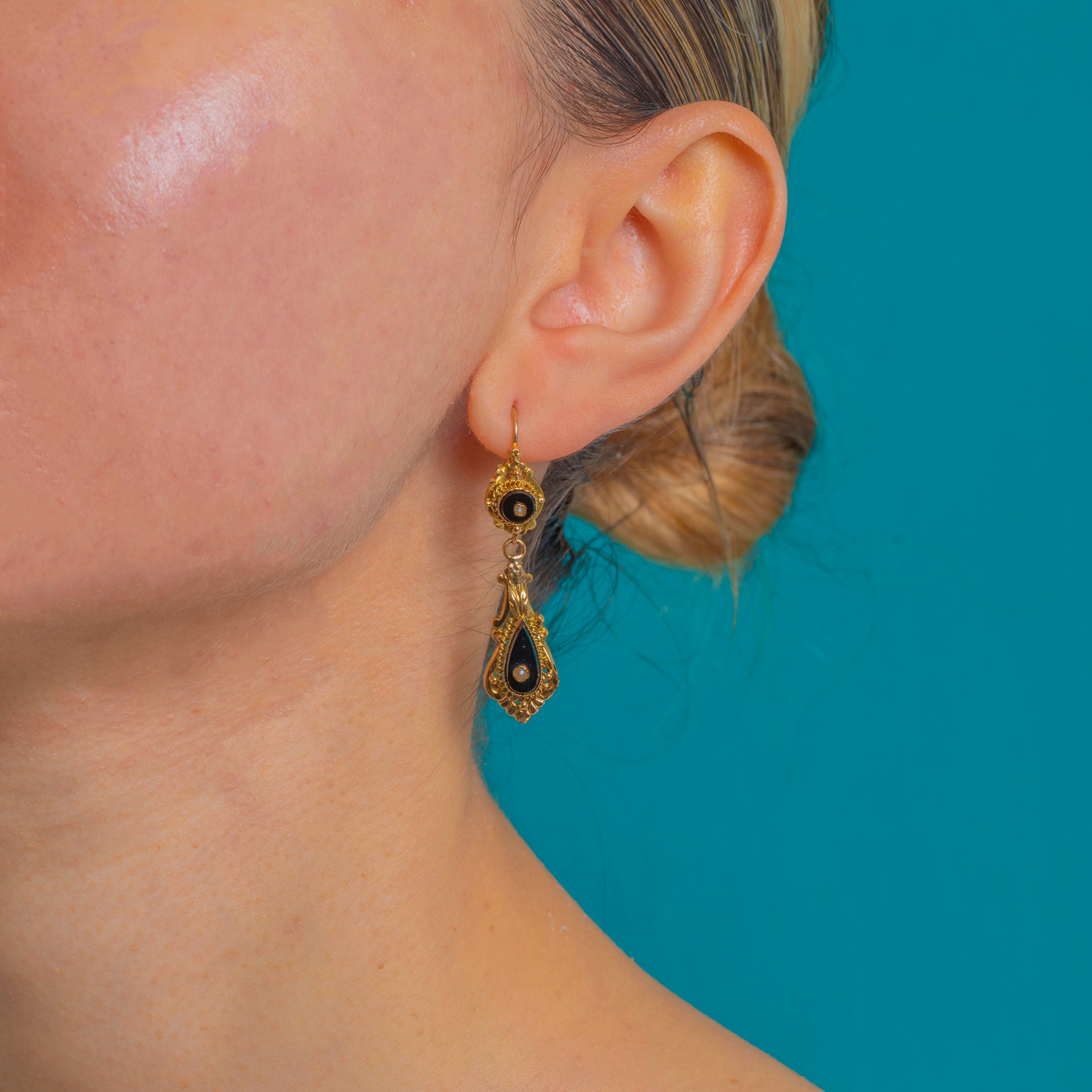 These French Napoleon III drop earrings distil the drama of the Victorian era into a beautifully wearable pair. Crafted in 14ct Gold, the articulated silhouette marries a round surmount to a graceful teardrop, each centred with a tiny Pearl atop glossy black Onyx. The striking black-and-Gold palette is elevated by exquisite Etruscan Revival detailing—applied beading, rope-twist borders and delicate foliate accents—lending depth and dimension to every curve.