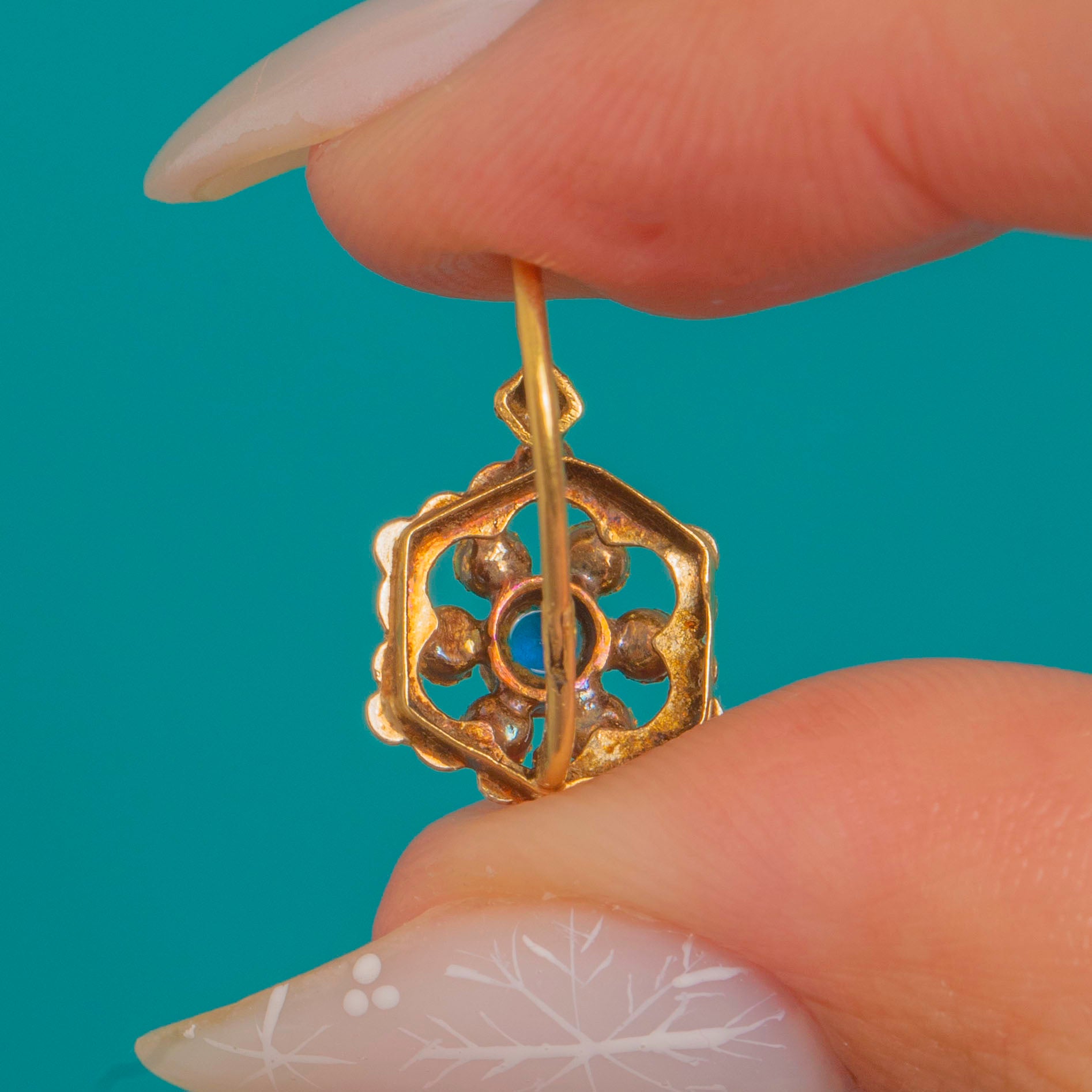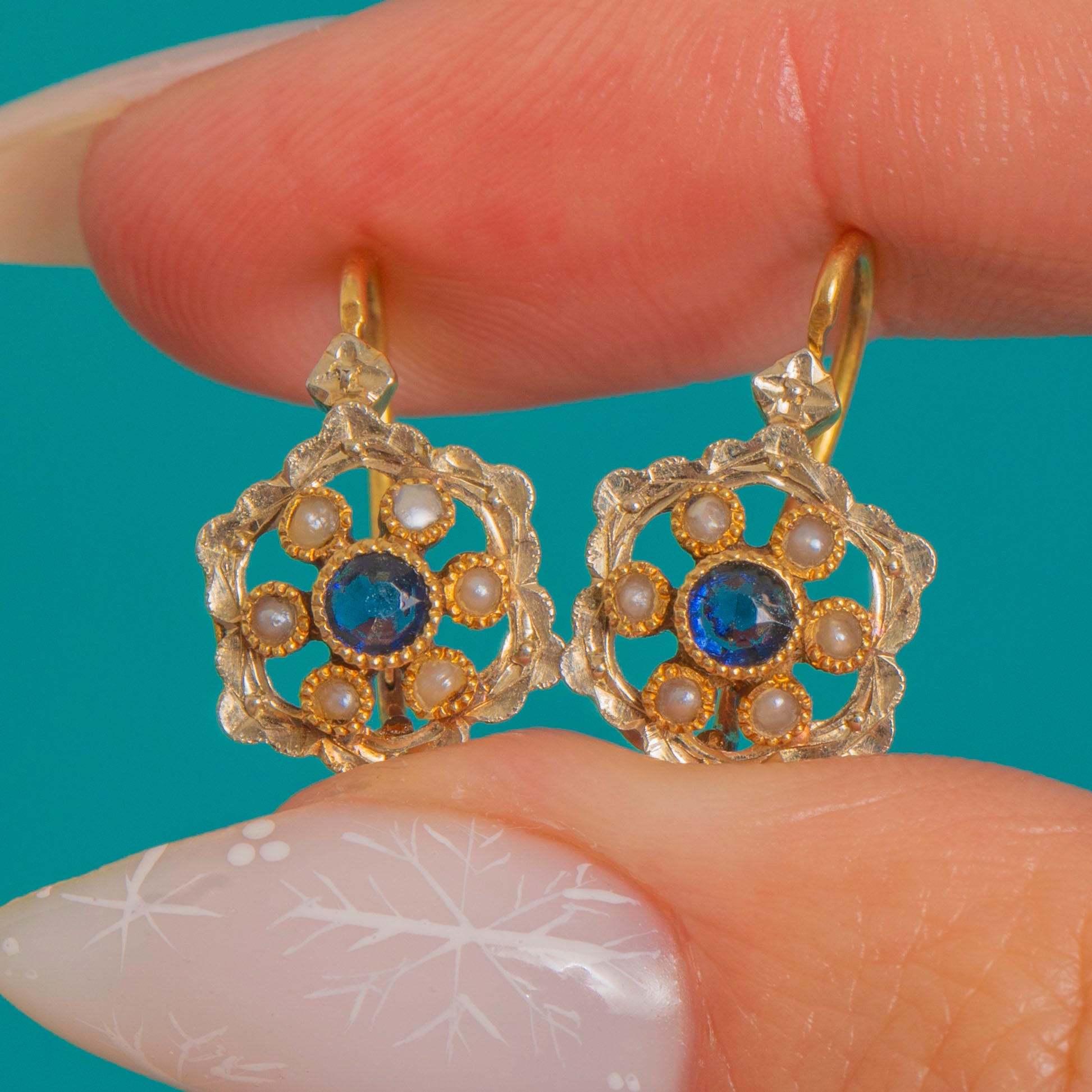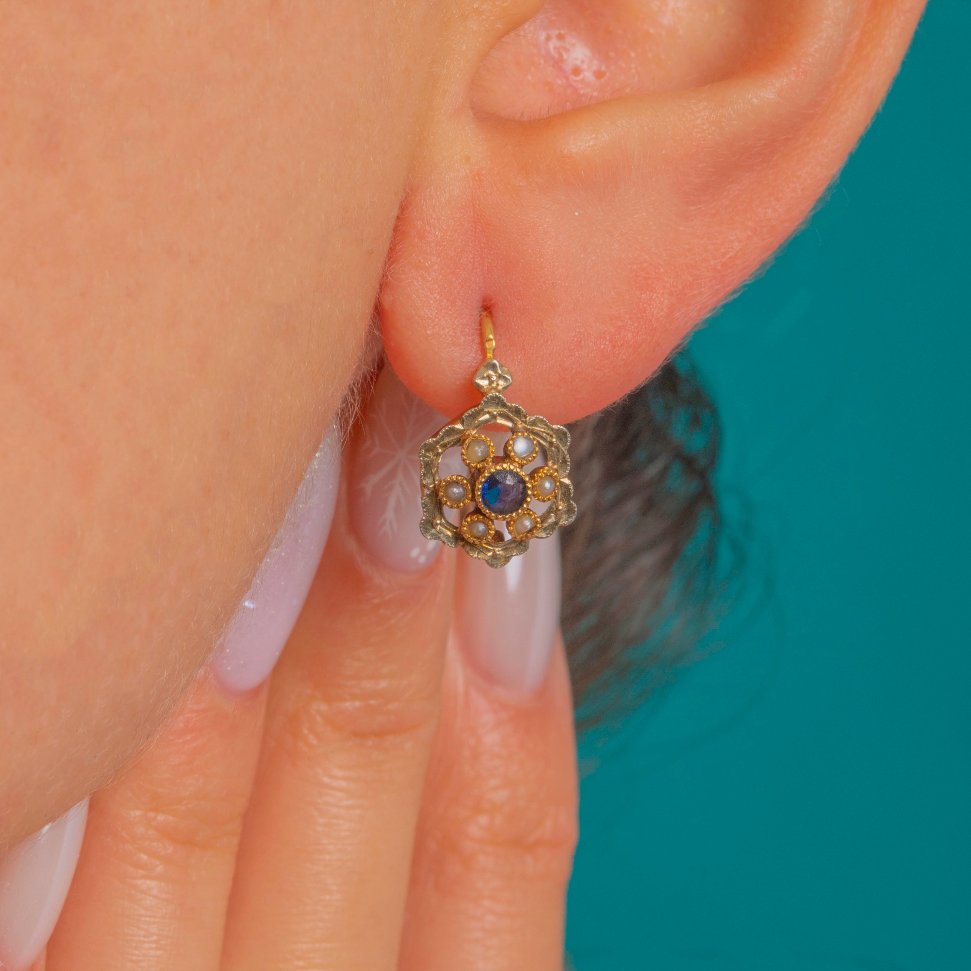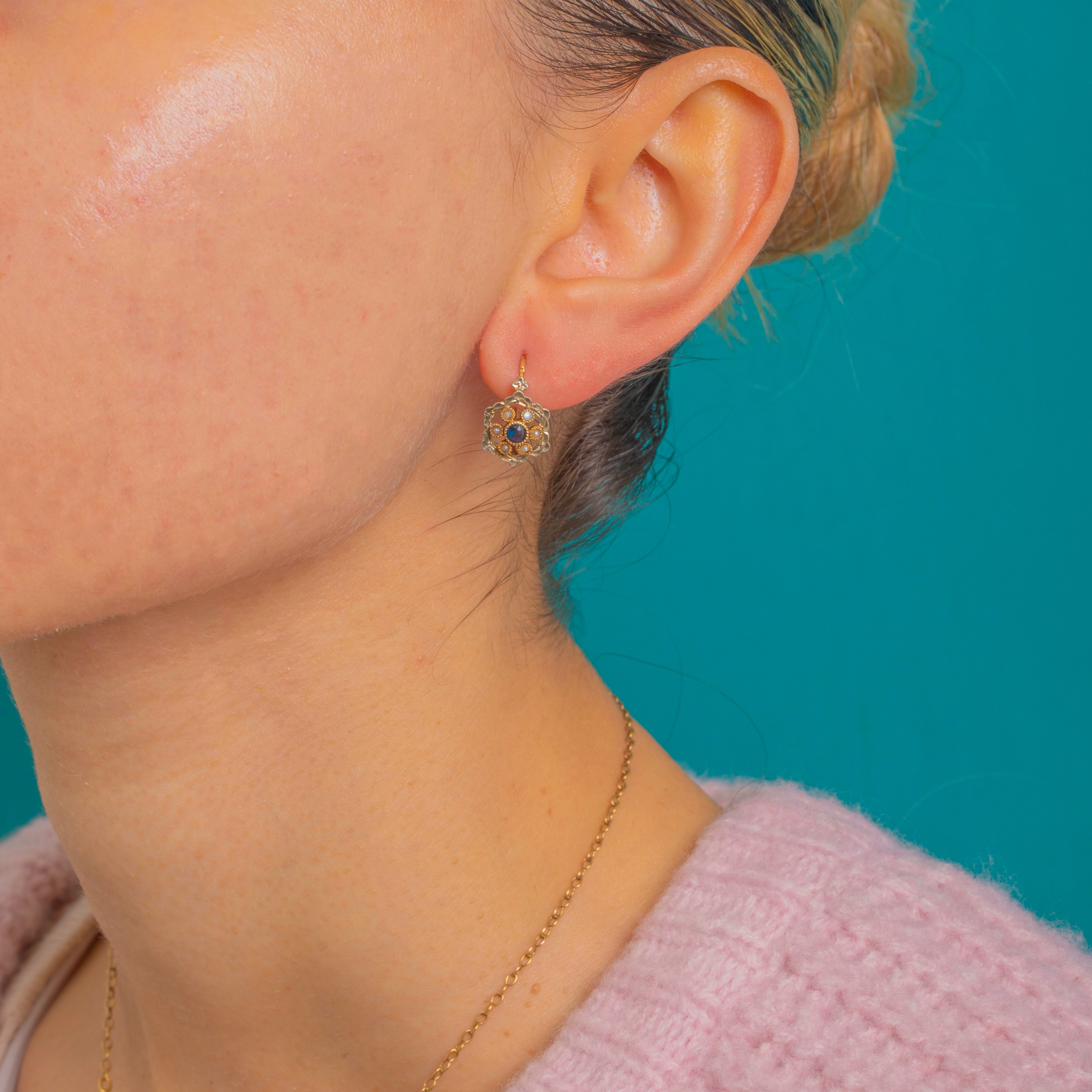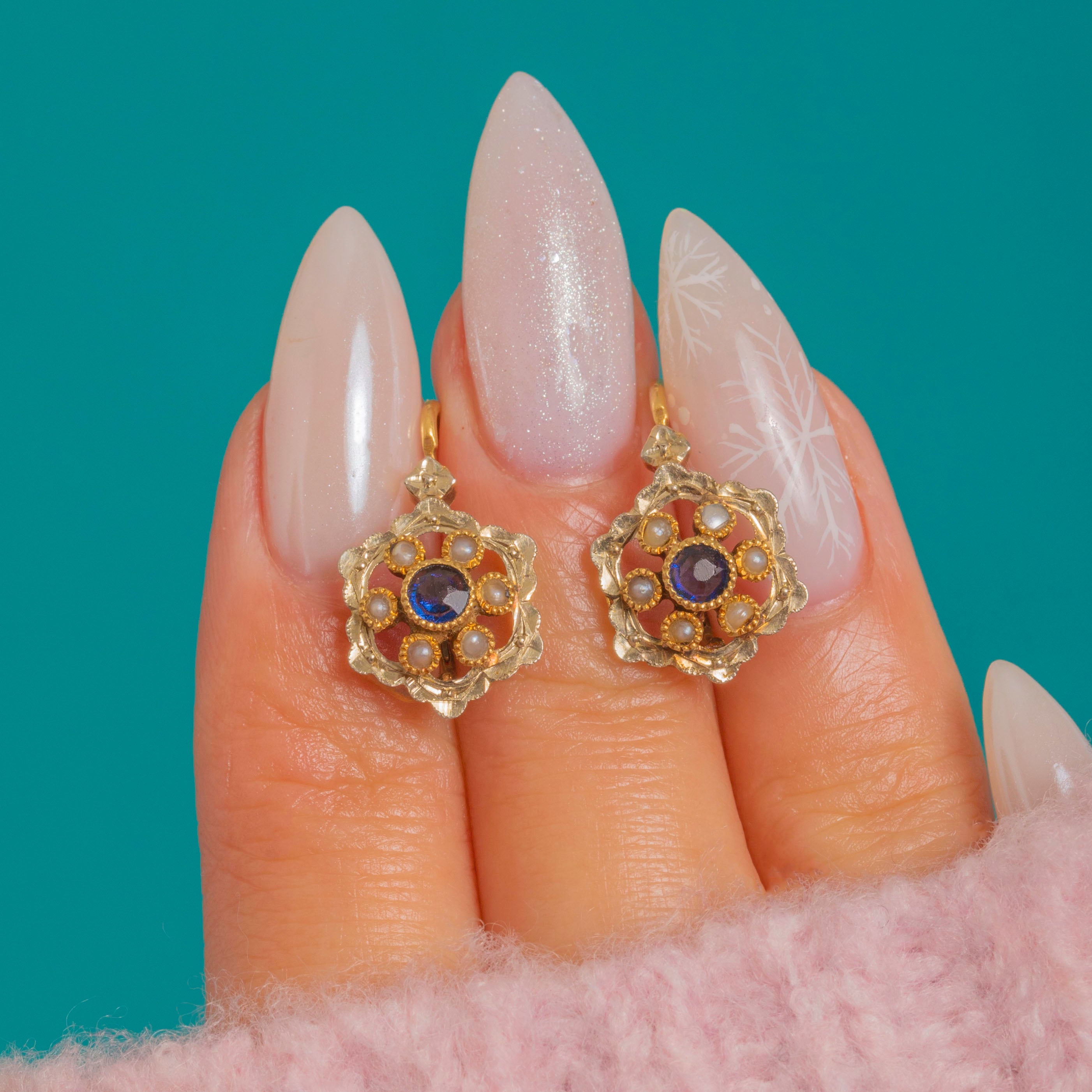 These enchanting Late Victorian earrings are a fine example of French jewellery craftsmanship from the turn of the 20th century. Designed as delicate “snowflake” clusters, each earring centres on a vivid Sapphire framed by a halo of softly lustrous Pearls, creating a beautifully balanced contrast of colour and texture.