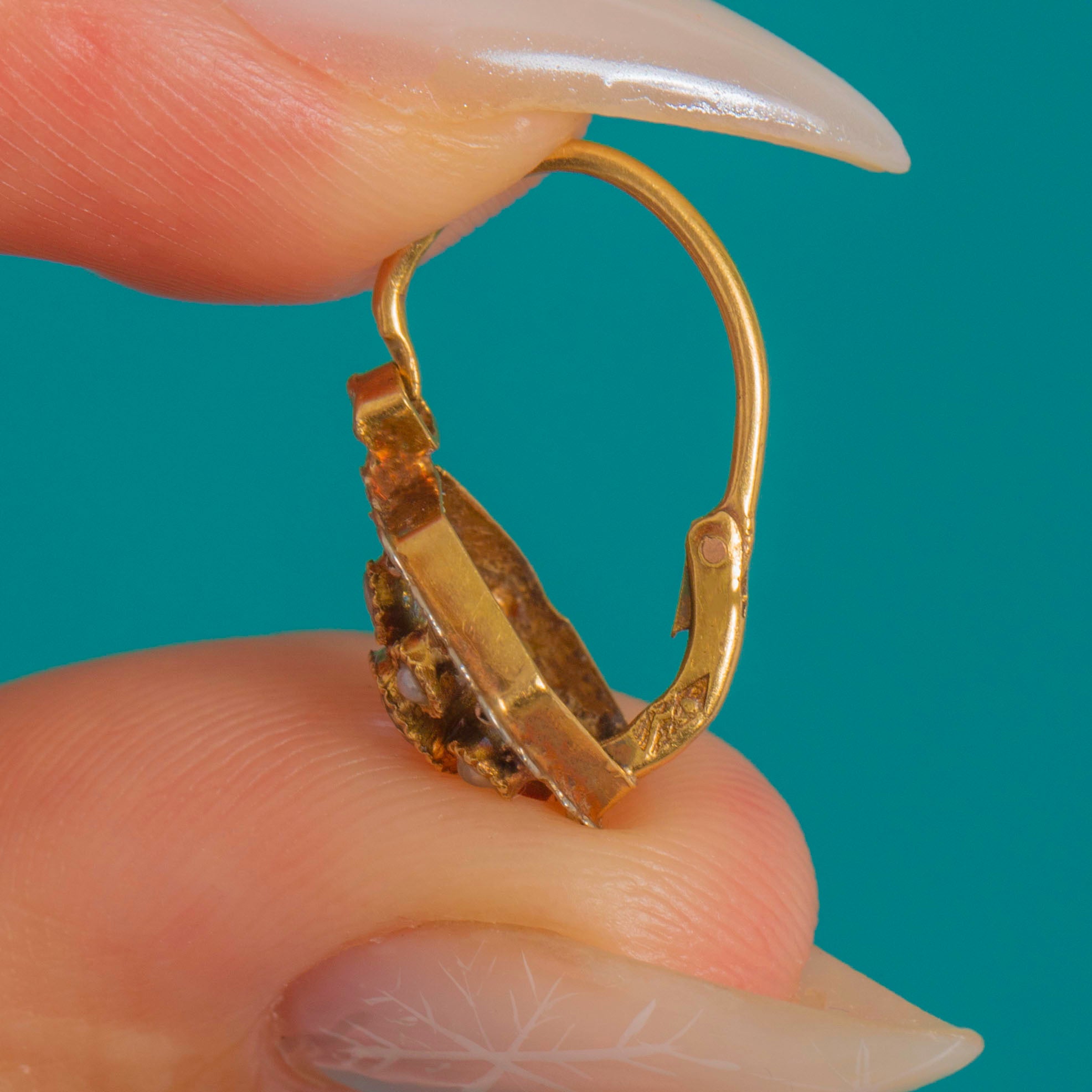 Crafted in rich 18ct Gold with Platinum settings, the design reflects the elegance and refinement synonymous with French jewellery of this era. The lever-back fittings are practical and secure, allowing the earrings to sit gracefully when worn while remaining comfortable for everyday or occasion wear.