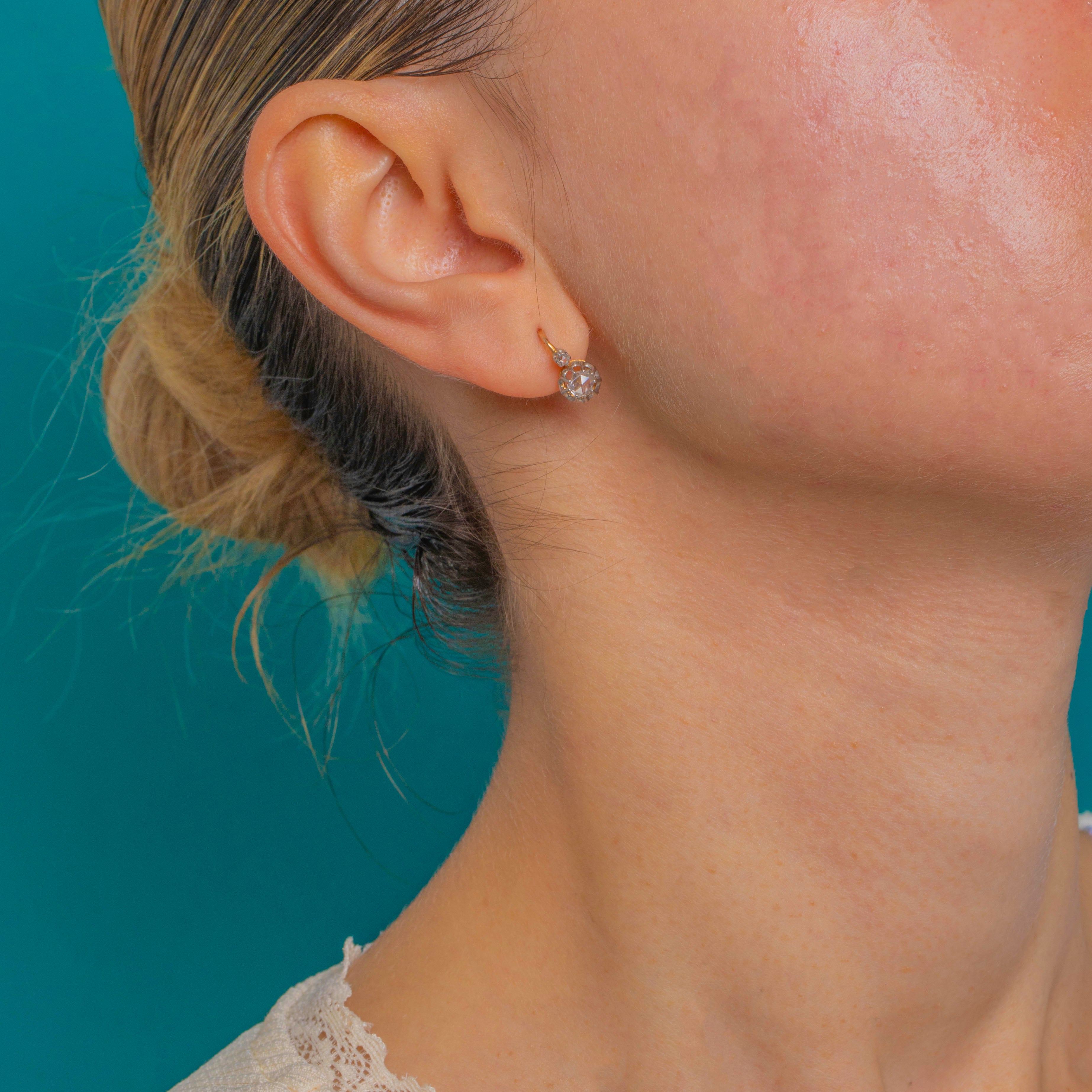 Each earring features a bright rose-cut Diamond drop beneath a tiny Diamond surmount, all secured in scalloped crown settings with open galleries to let the light stream through. Finished with sleek hinged dormeuse fittings, they’re delicate, elegant, and endlessly wearable—true Belle Époque charm.