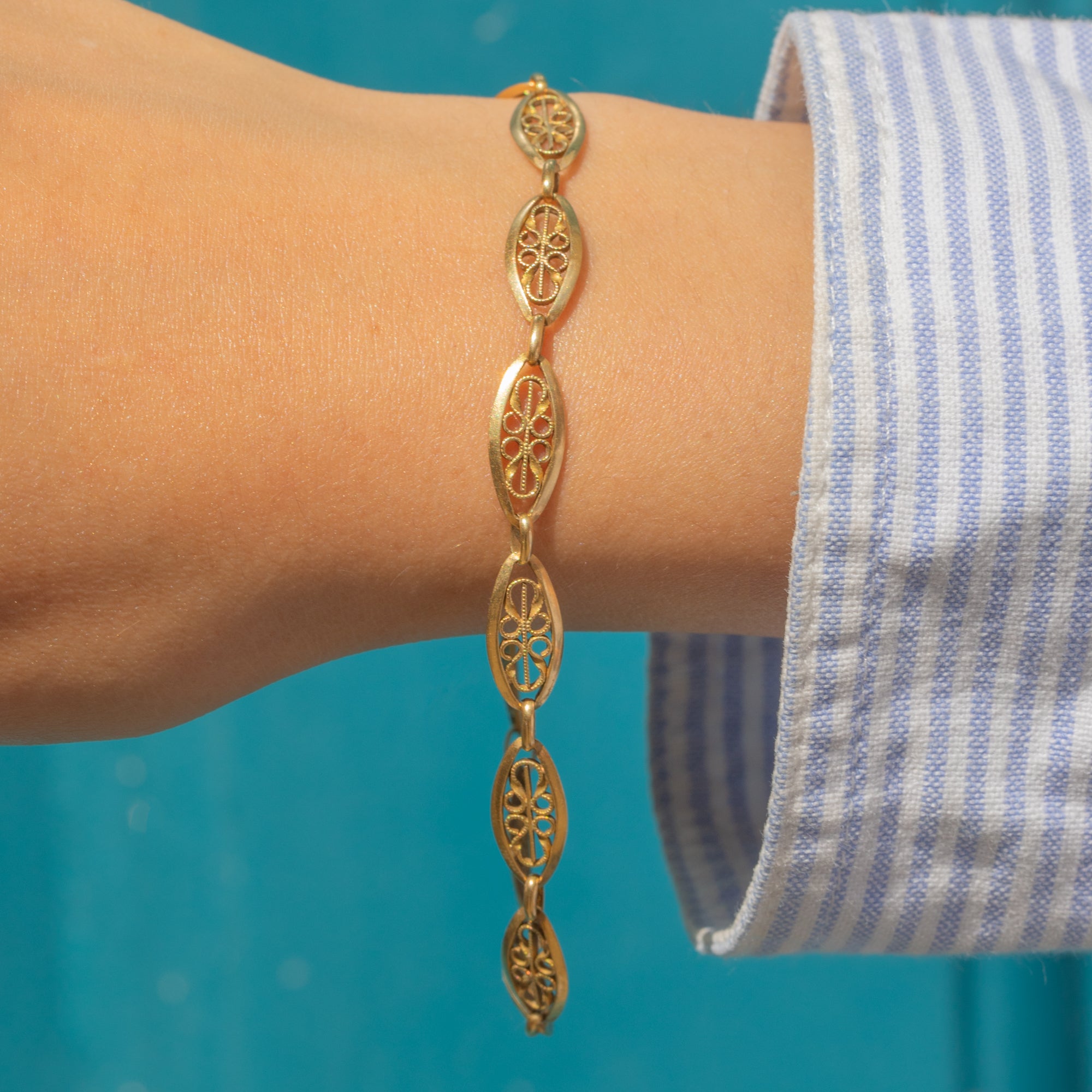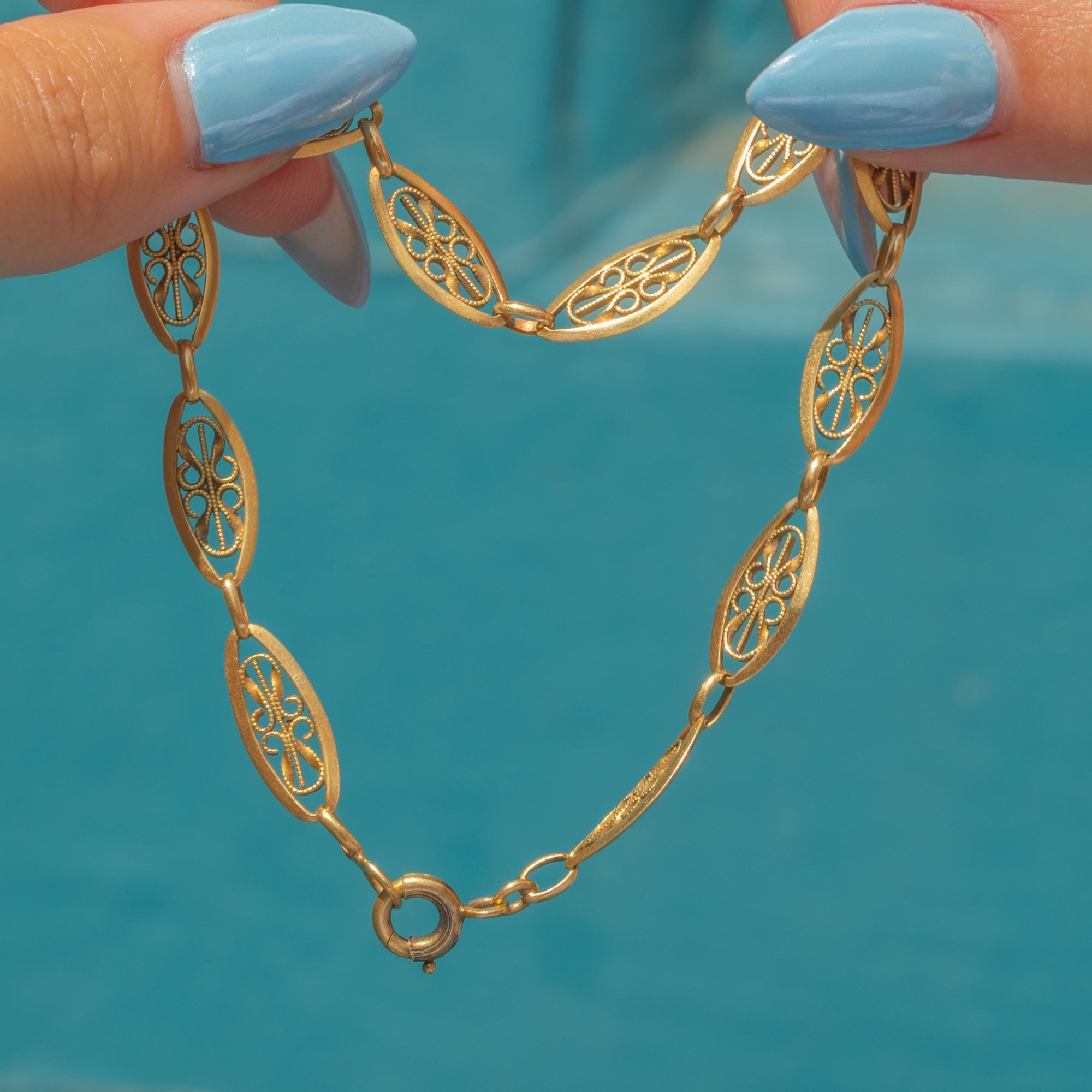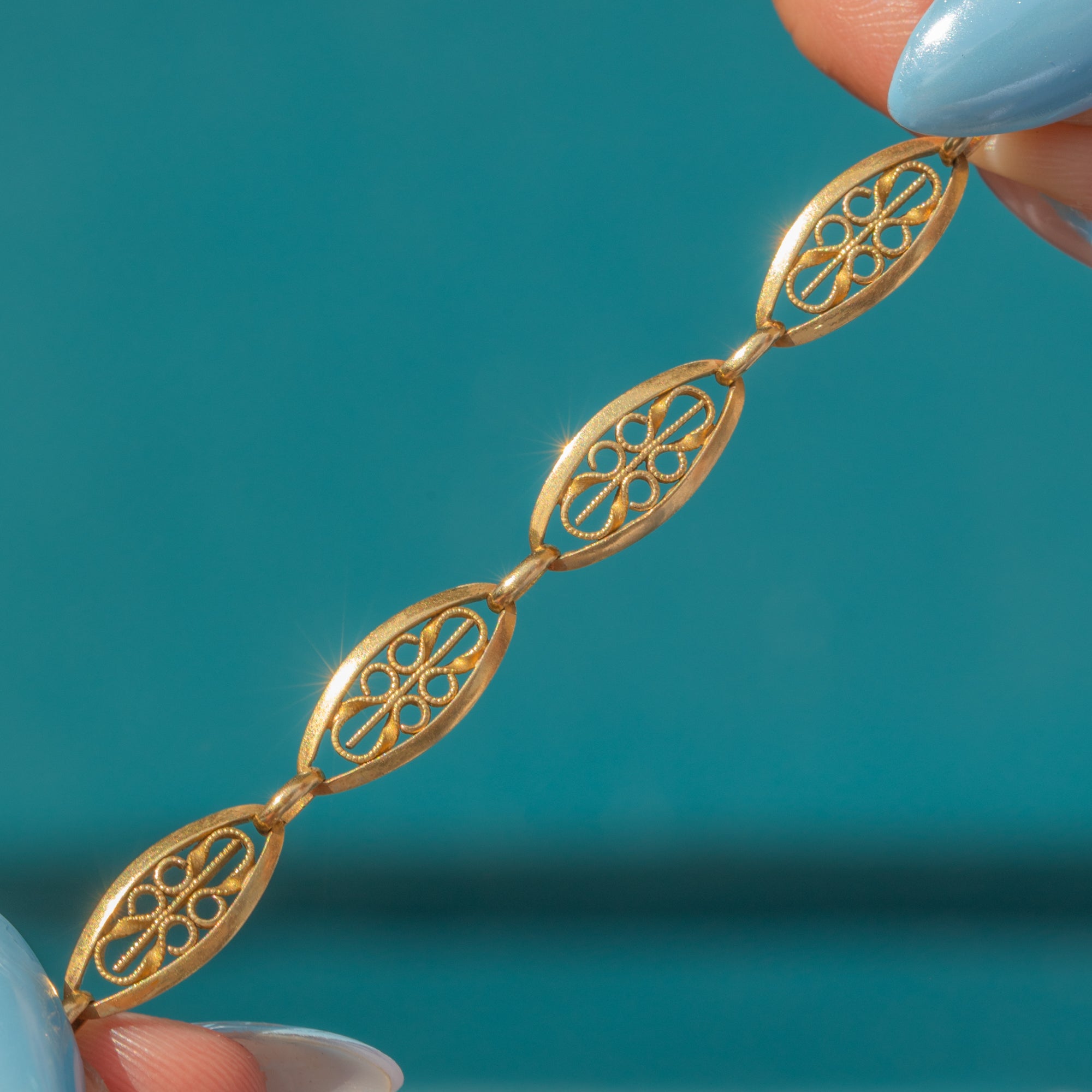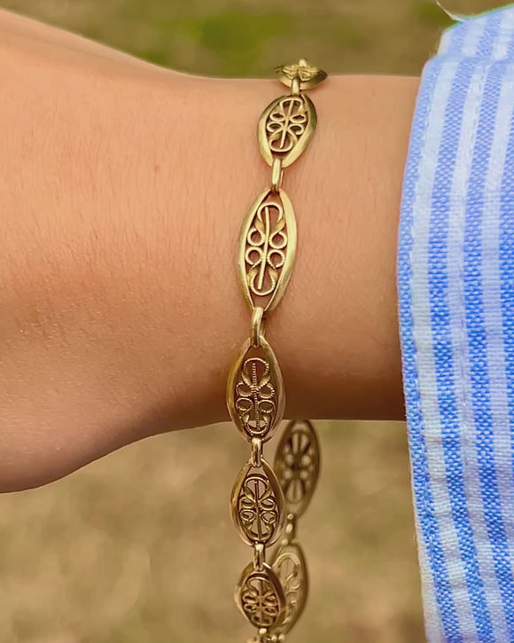 EXCELLENT: The Gold is richly saturated, and each link is securely connected with the filigree detailing remaining intact. There is some light surface wear throughout, expected with age, and light discolouration on the bolt-ring, which will not be noticeable when the bracelet is worn. The bolt-ring is in perfect working condition, allowing you to wear this Victorian Gold bracelet with utmost confidence!