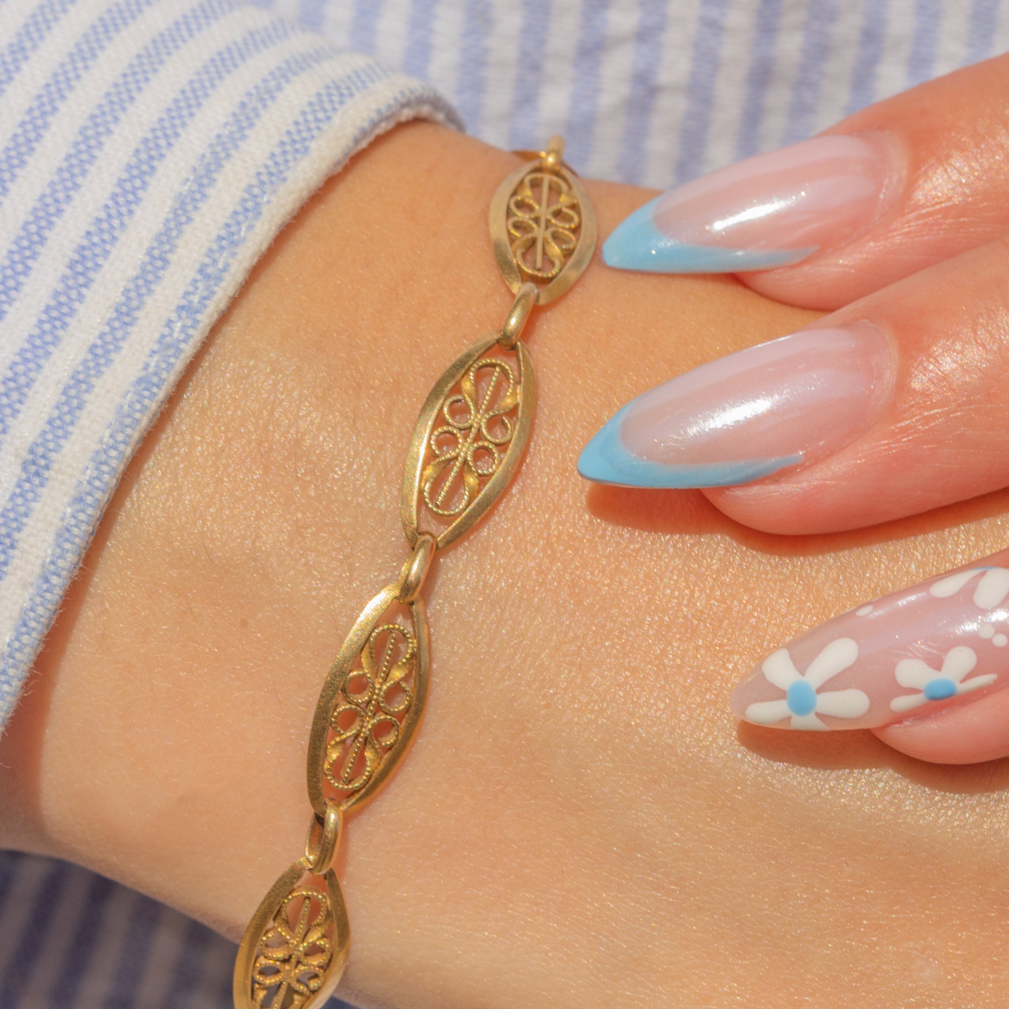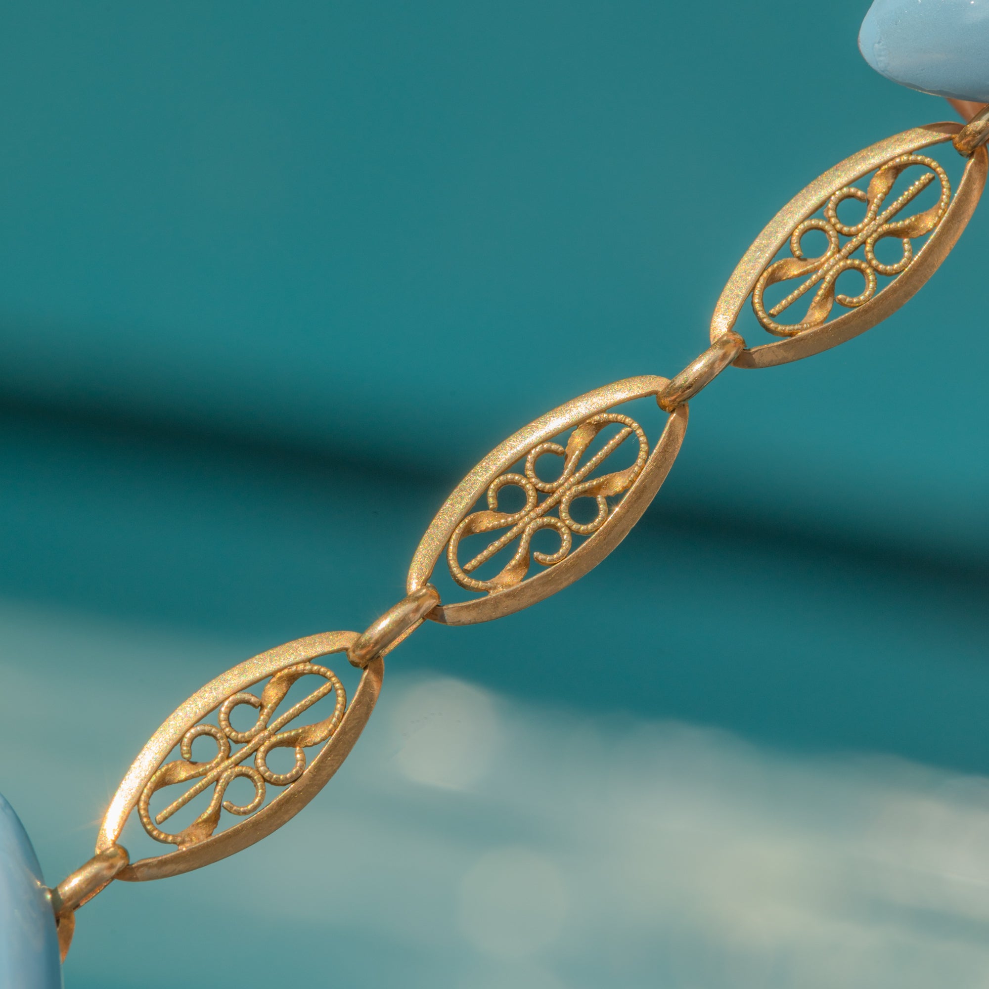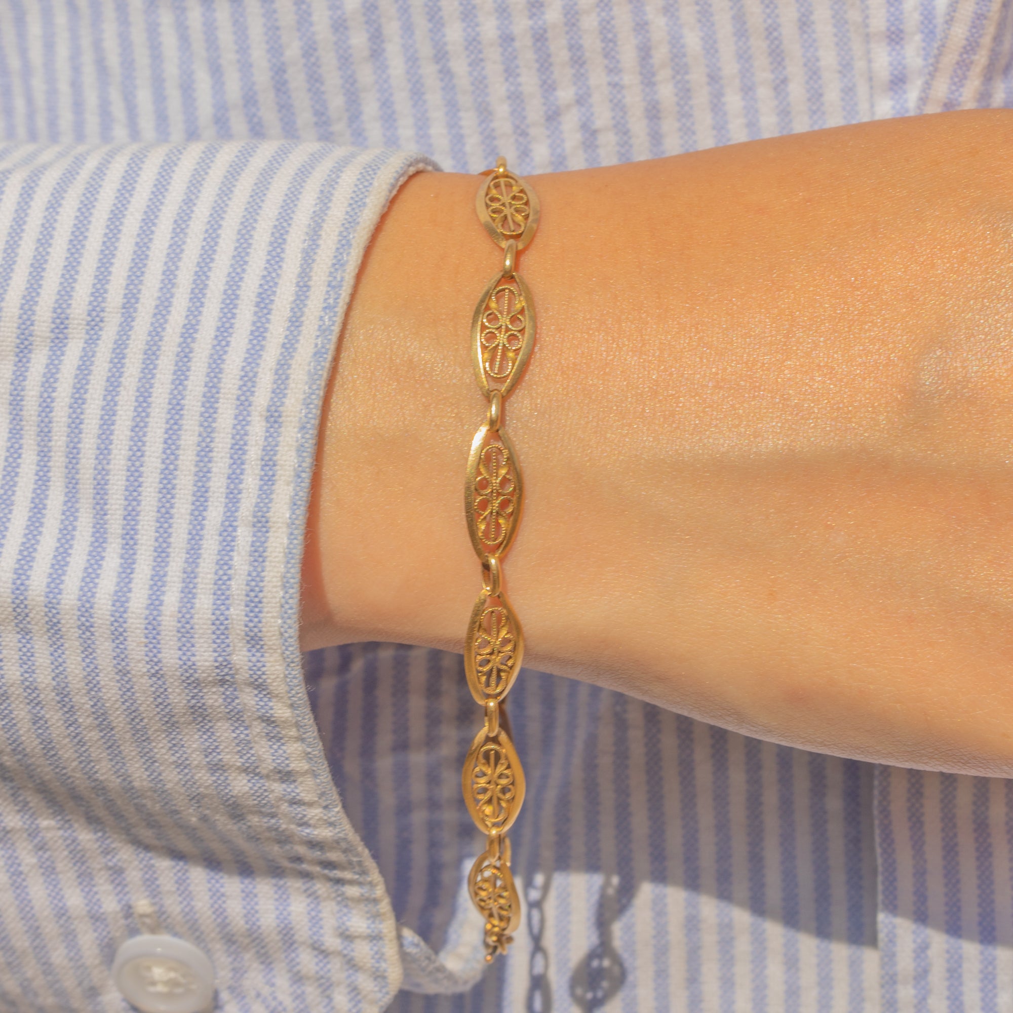 EXCELLENT: The Gold is richly saturated, and each link is securely connected with the filigree detailing remaining intact. There is some light surface wear throughout, expected with age, and light discolouration on the bolt-ring, which will not be noticeable when the bracelet is worn. The bolt-ring is in perfect working condition, allowing you to wear this Victorian Gold bracelet with utmost confidence!
