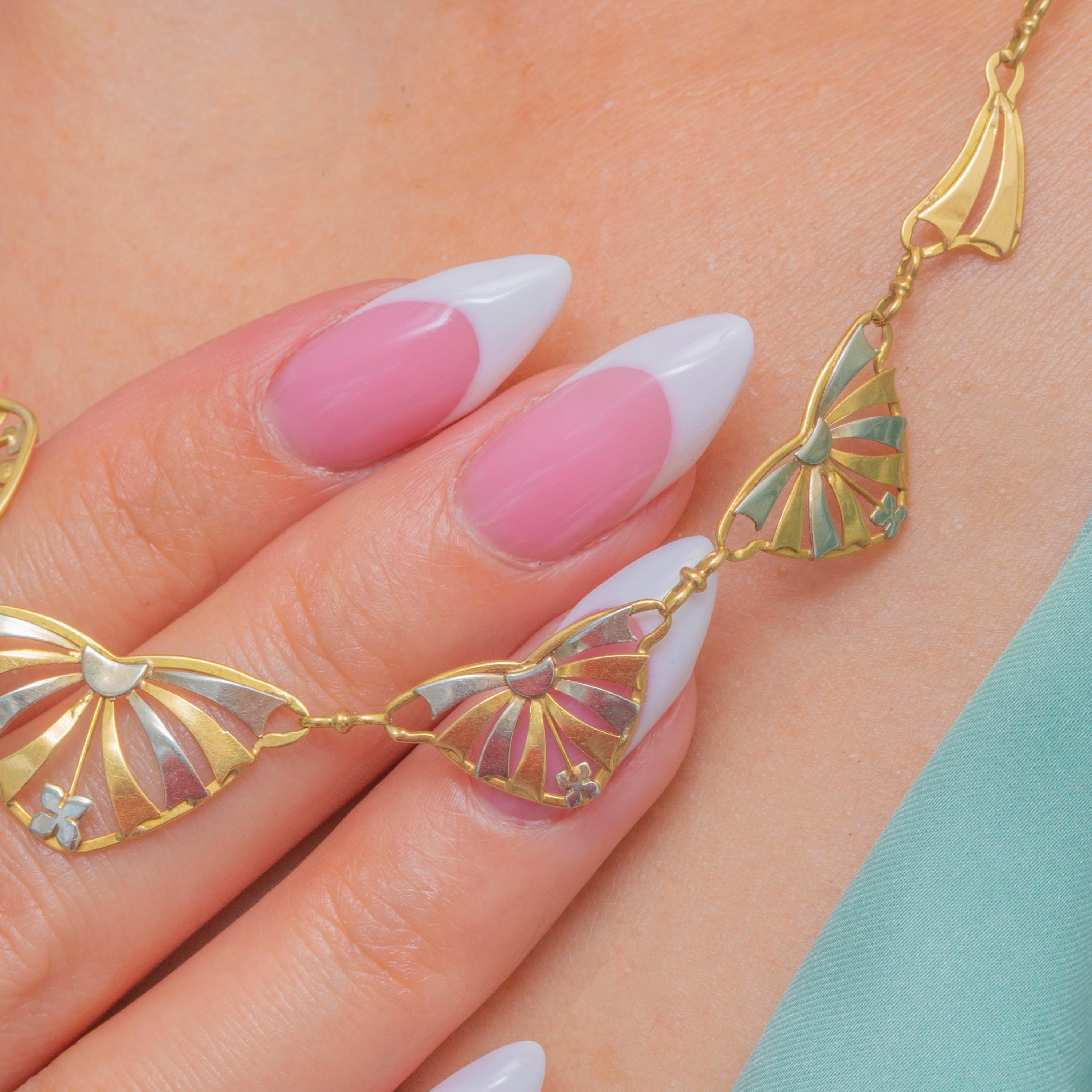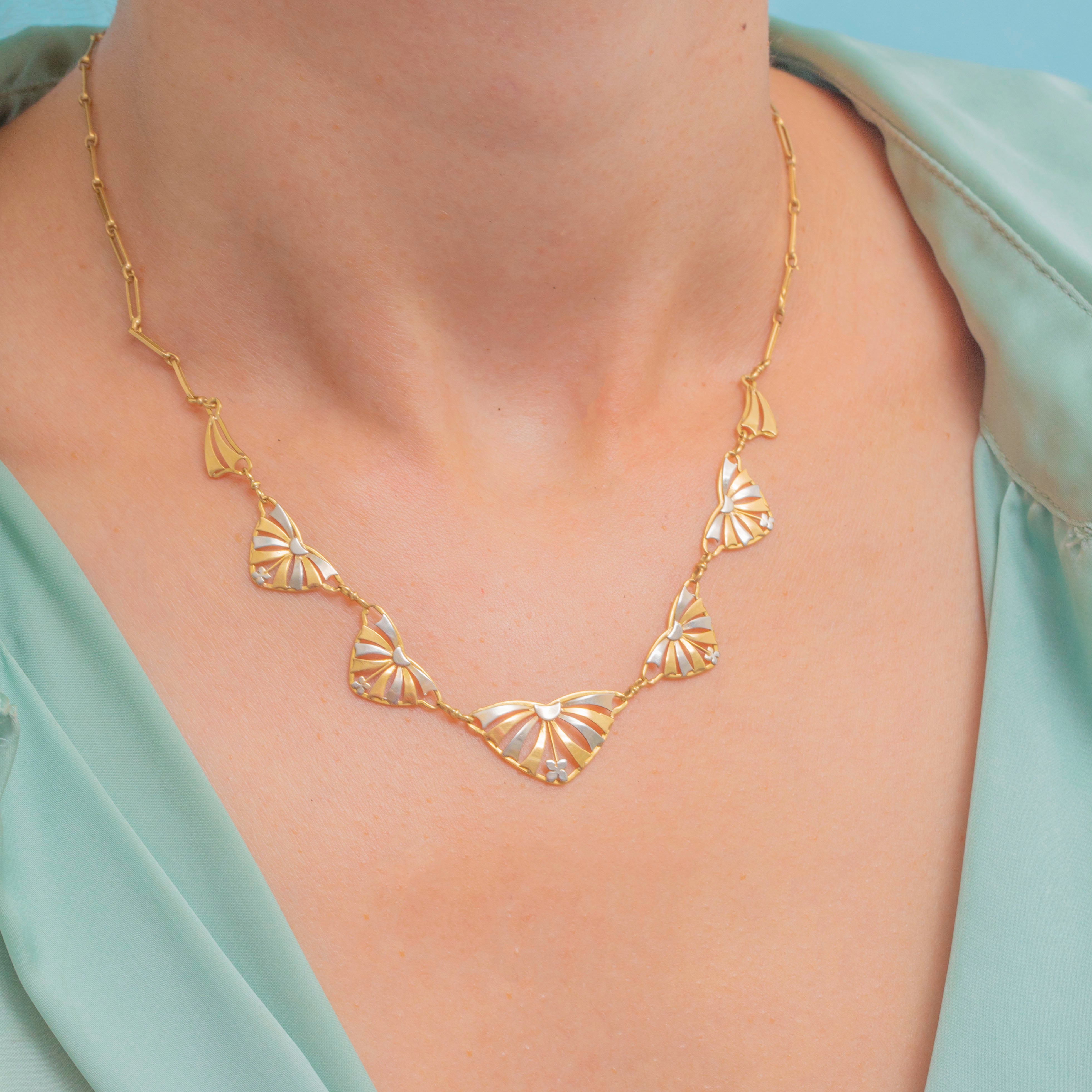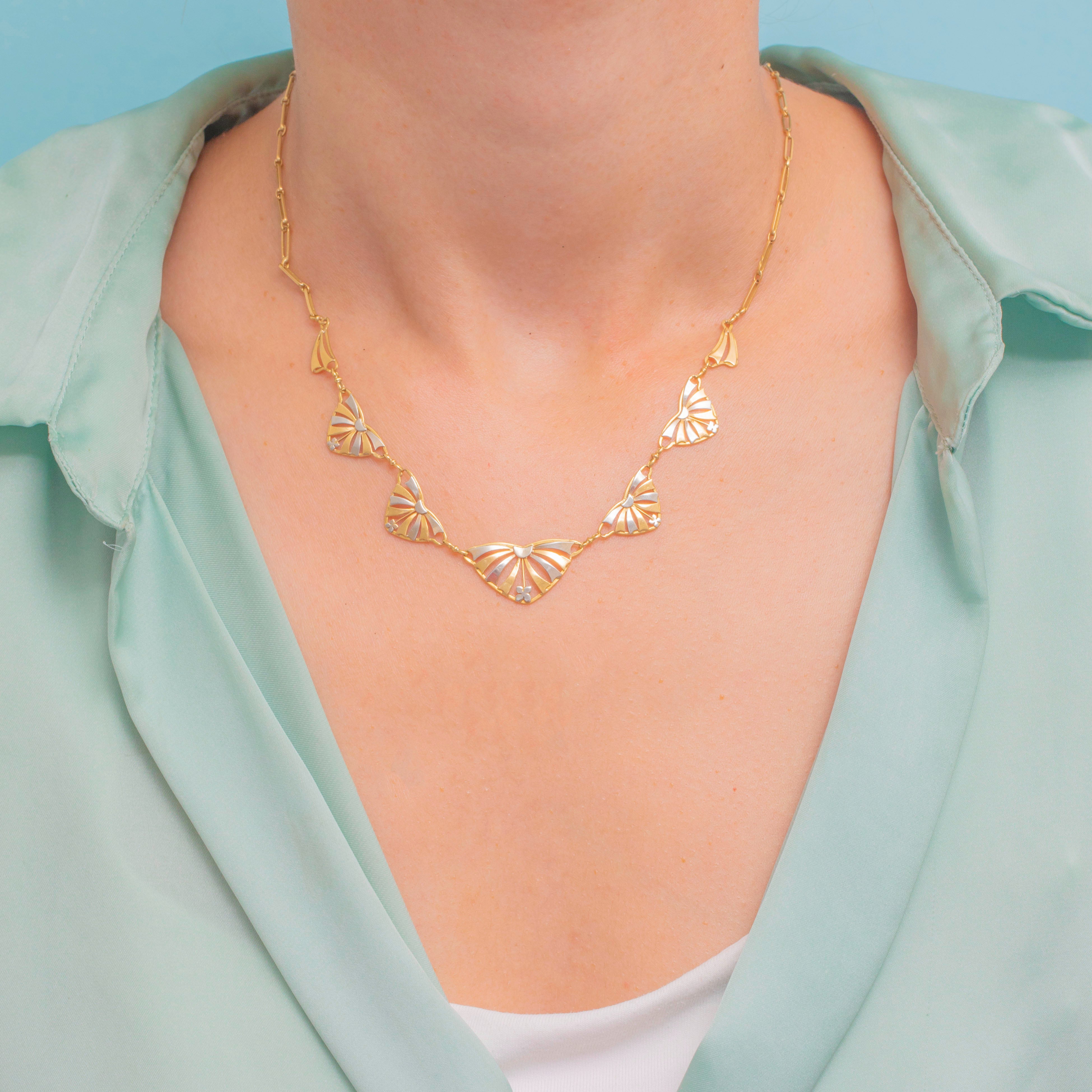 This French Art Deco necklace will make a fabulous addition to your collection. The 17" necklace has an alluring fan-shaped fringe that draws in the eye, crafted from solid 18ct Gold with White Gold accents creating a gorgeous two-tone effect!