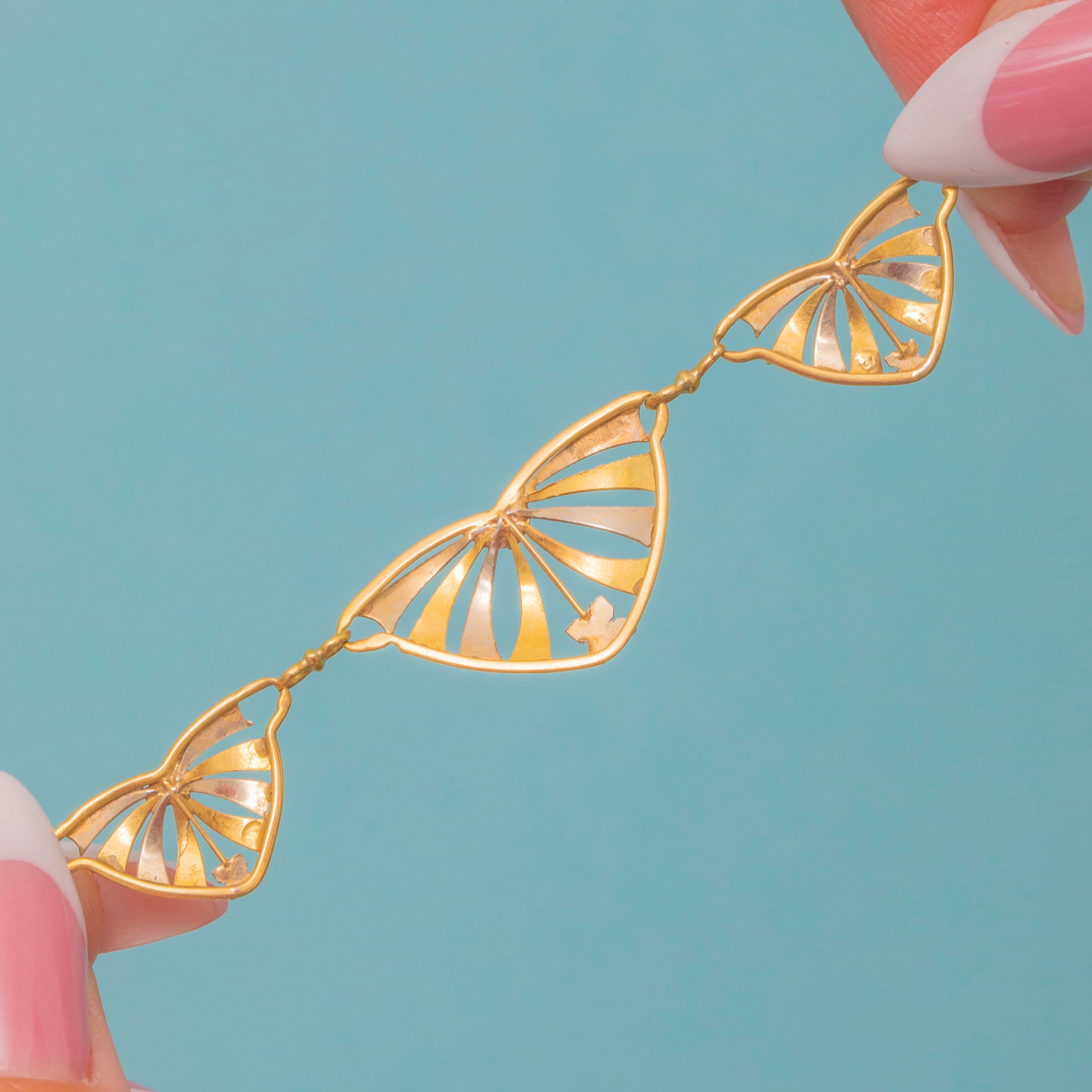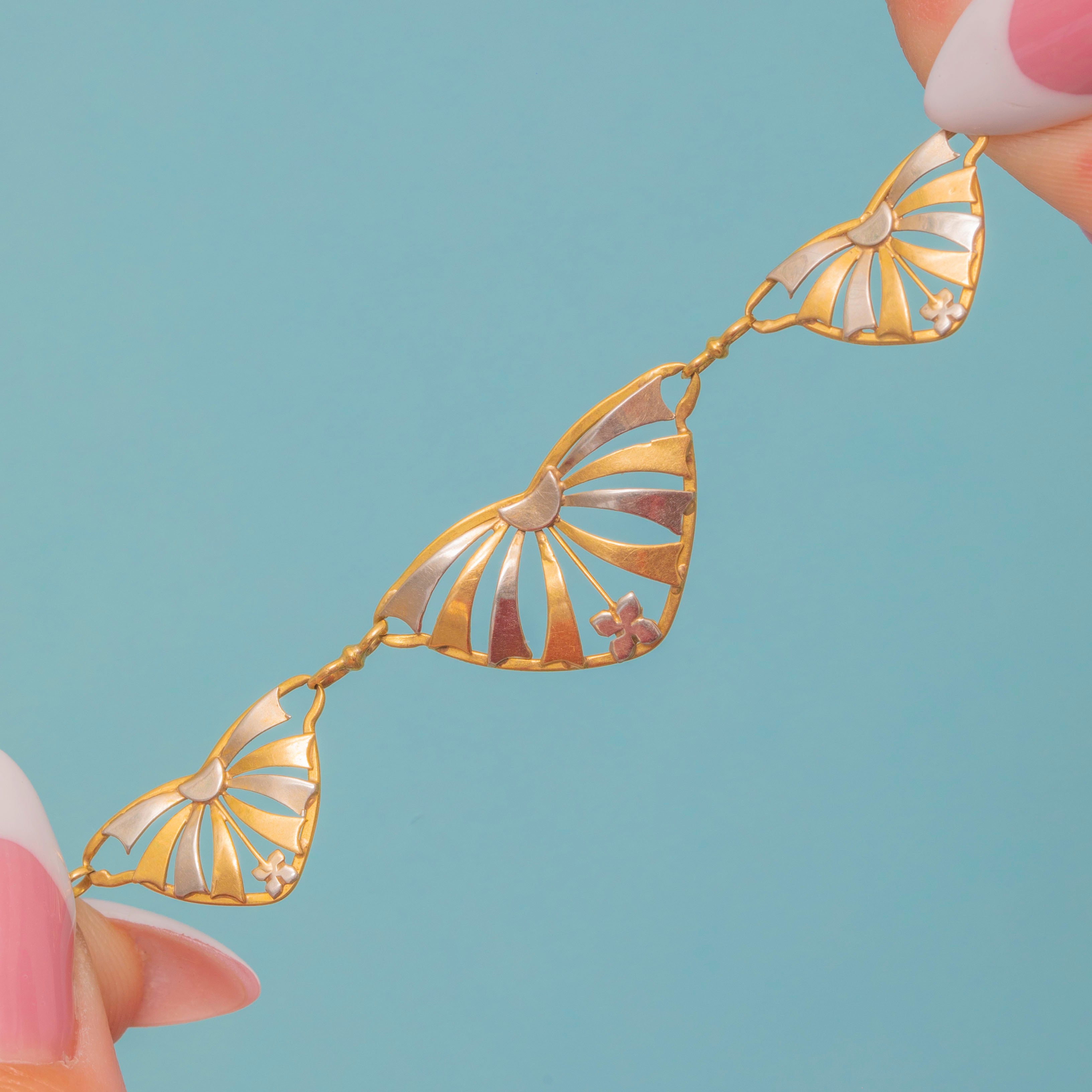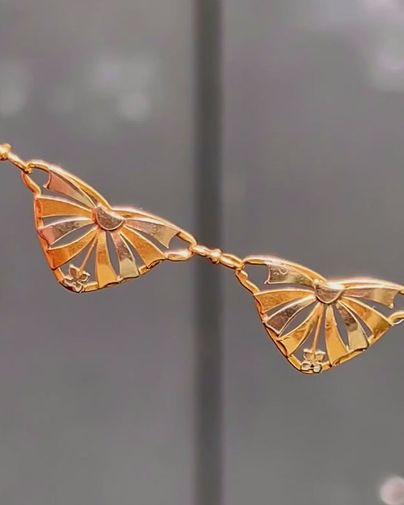 This French Art Deco necklace will make a fabulous addition to your collection. The 17" necklace has an alluring fan-shaped fringe that draws in the eye, crafted from solid 18ct Gold with White Gold accents creating a gorgeous two-tone effect!