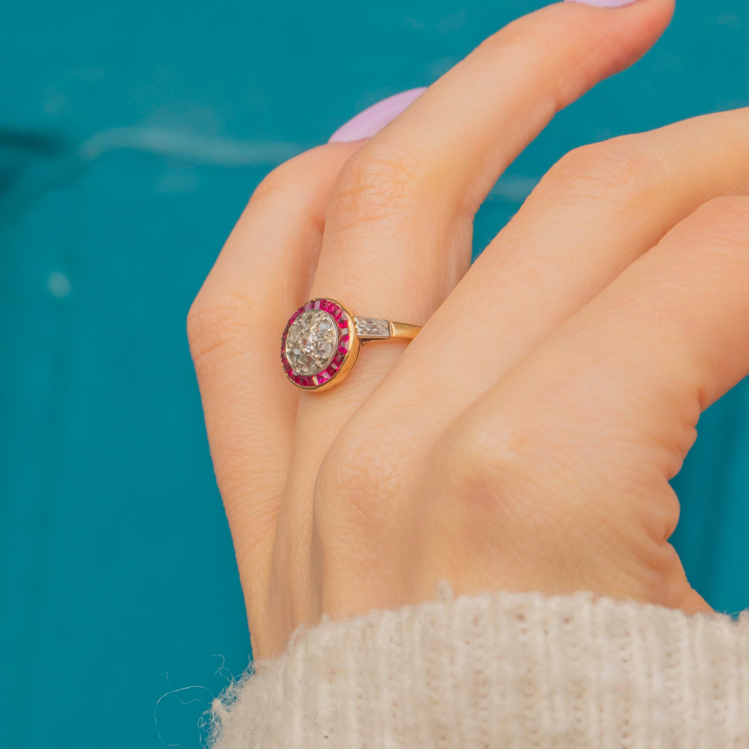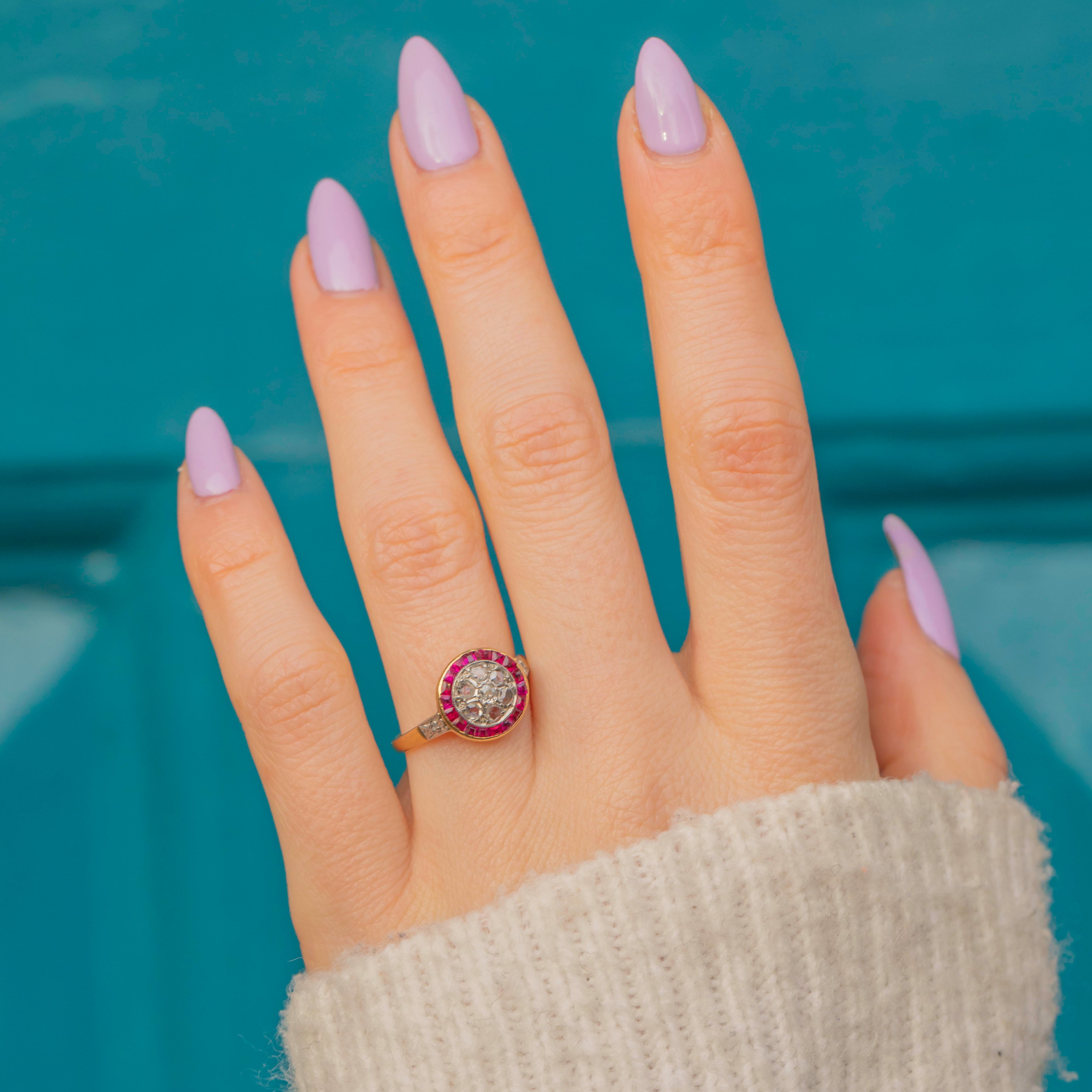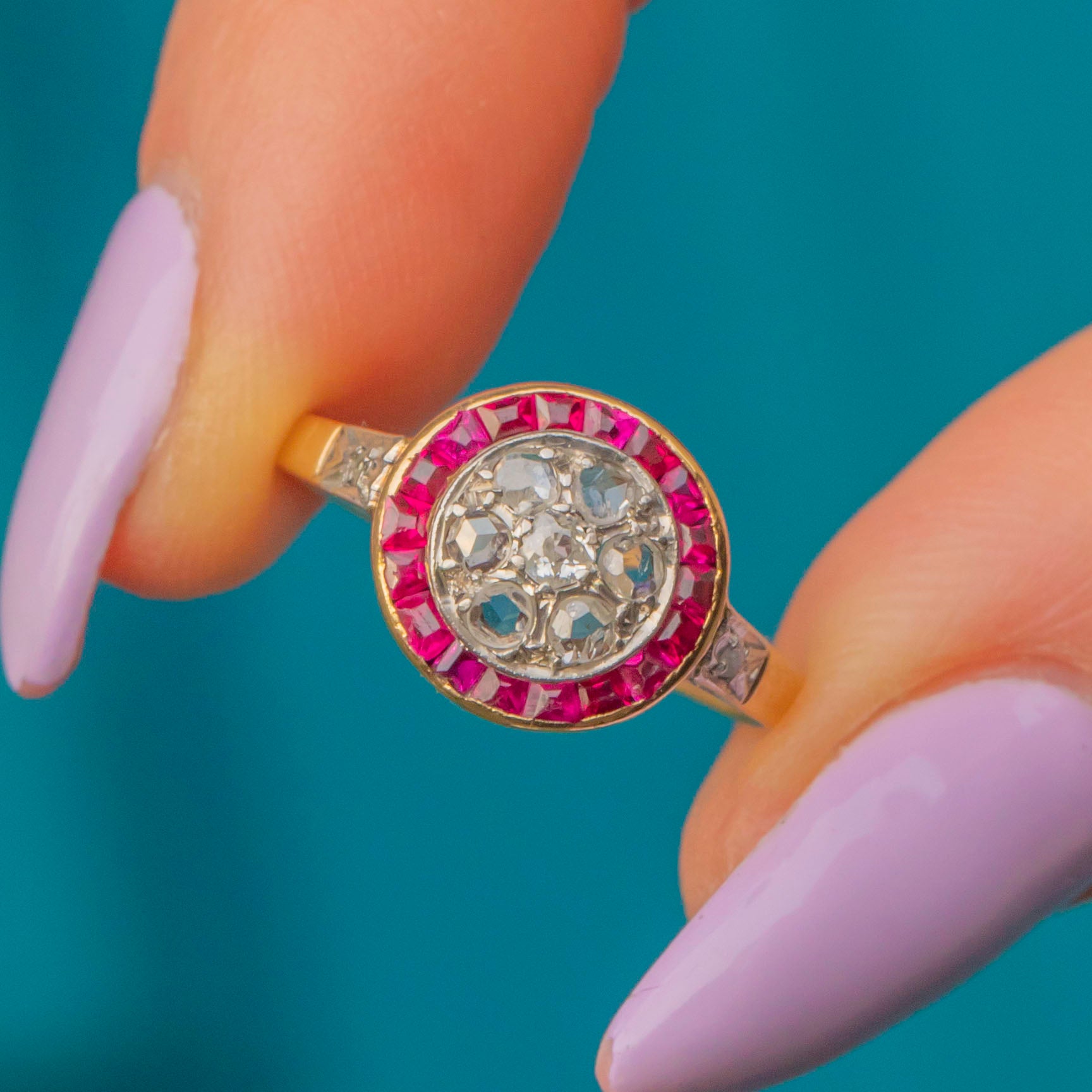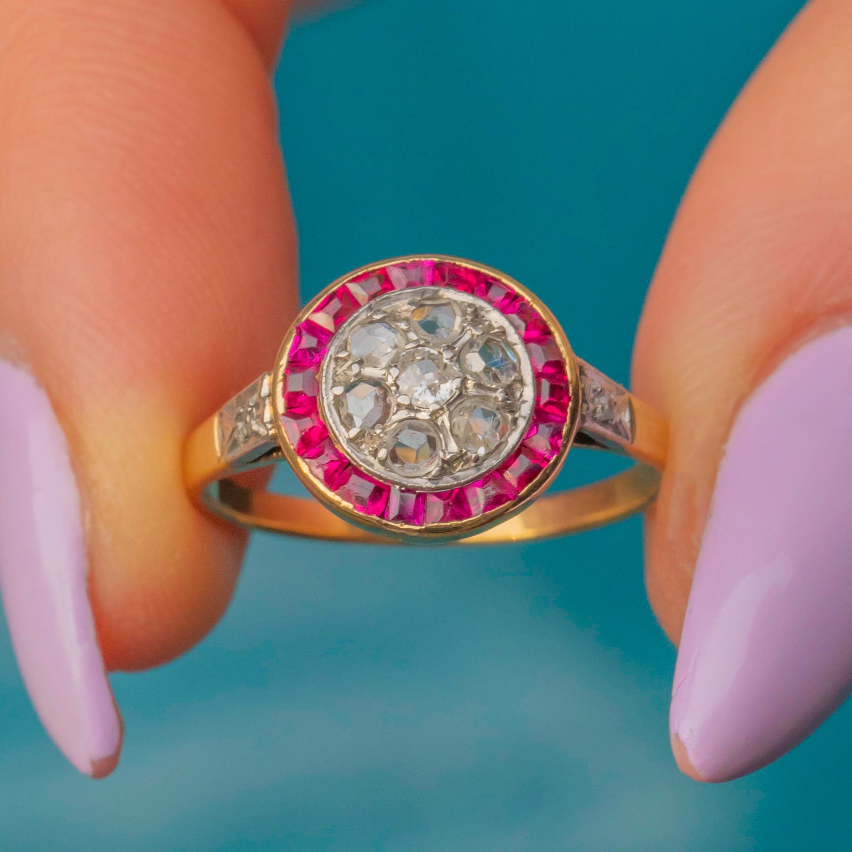 This French Art Deco 18ct Gold Ruby Diamond target cluster ring is a fantastic example of the glamour of the era! The target design is classically Art Deco, and only the finest materials have been used to make this antique French Ruby and Diamond ring.