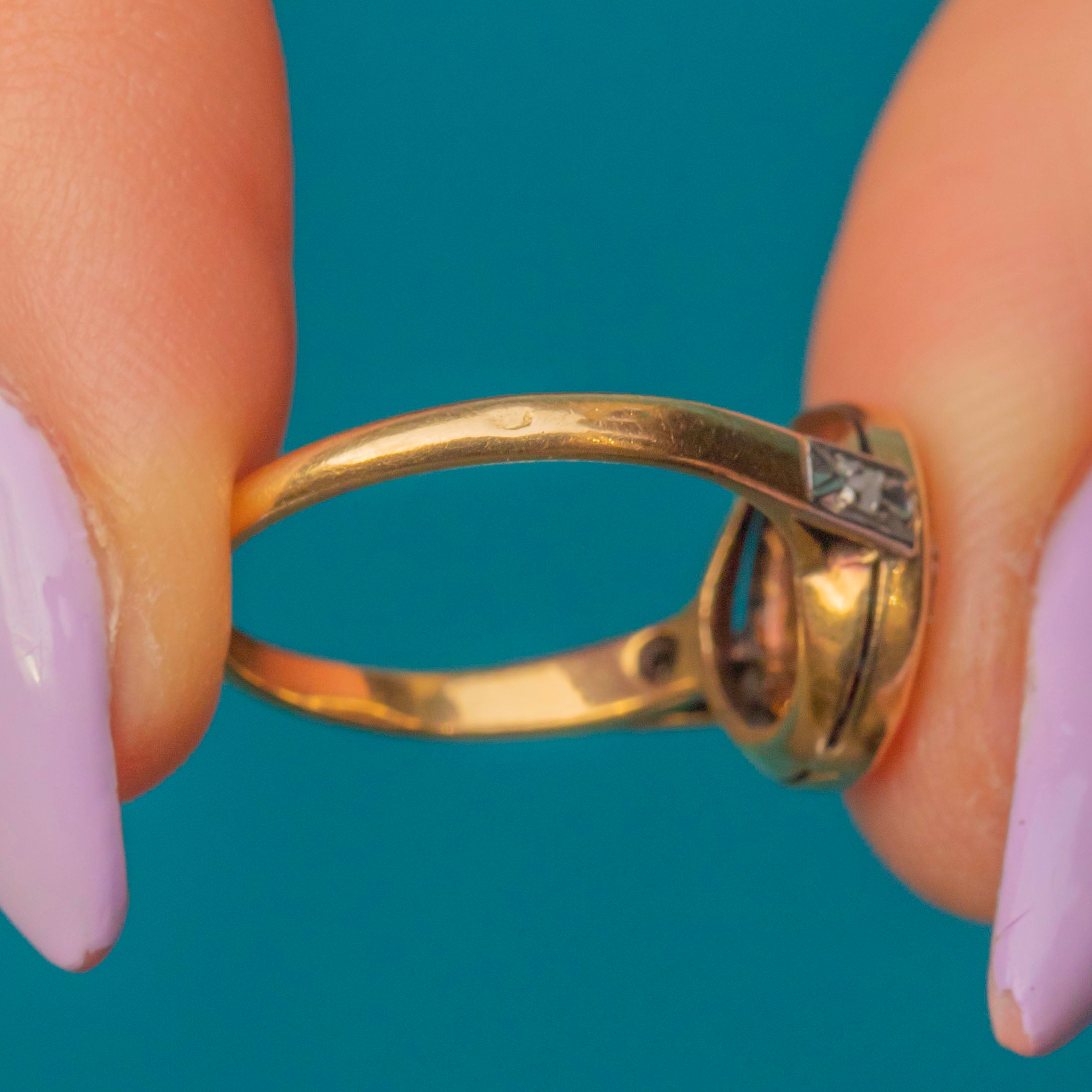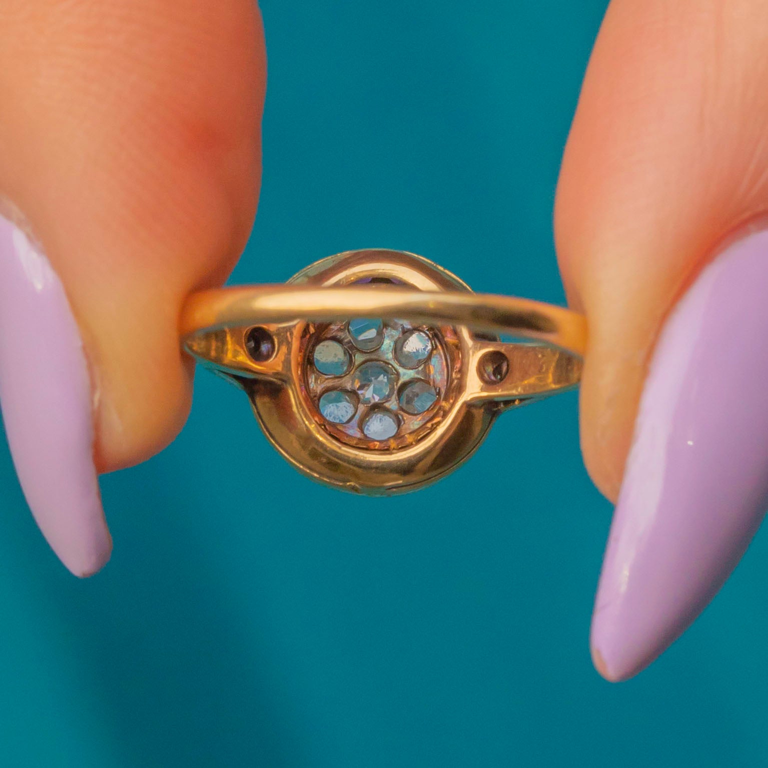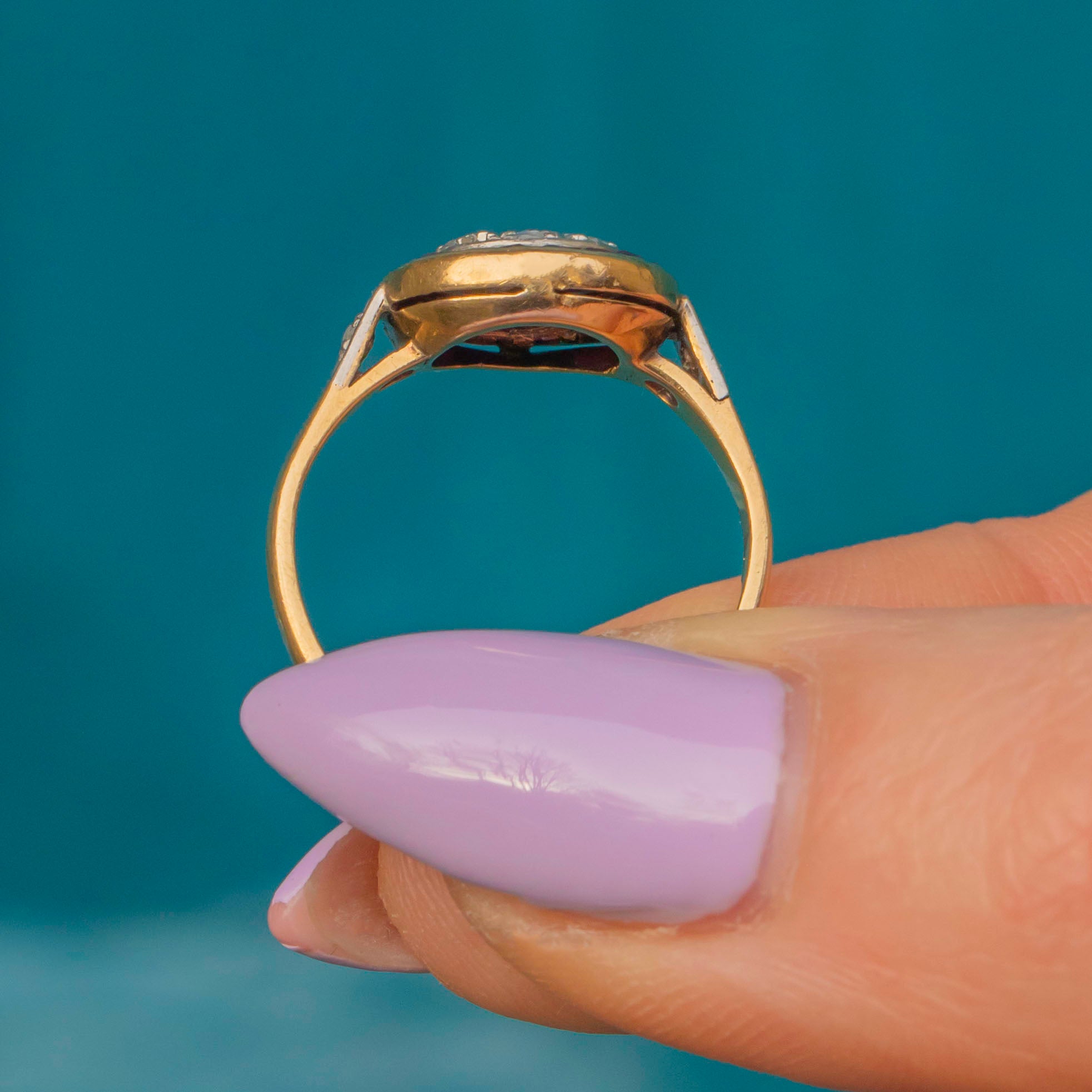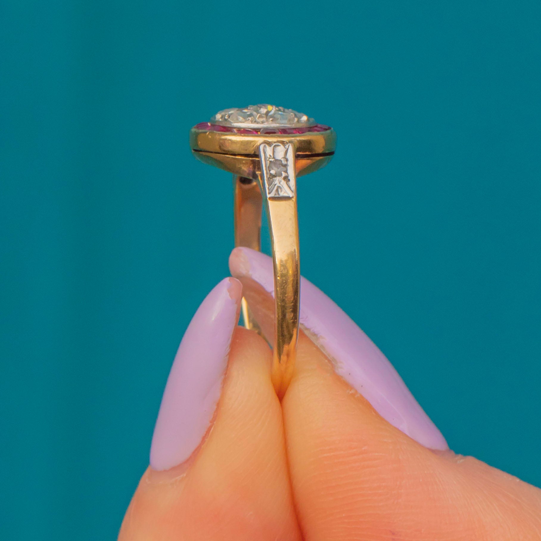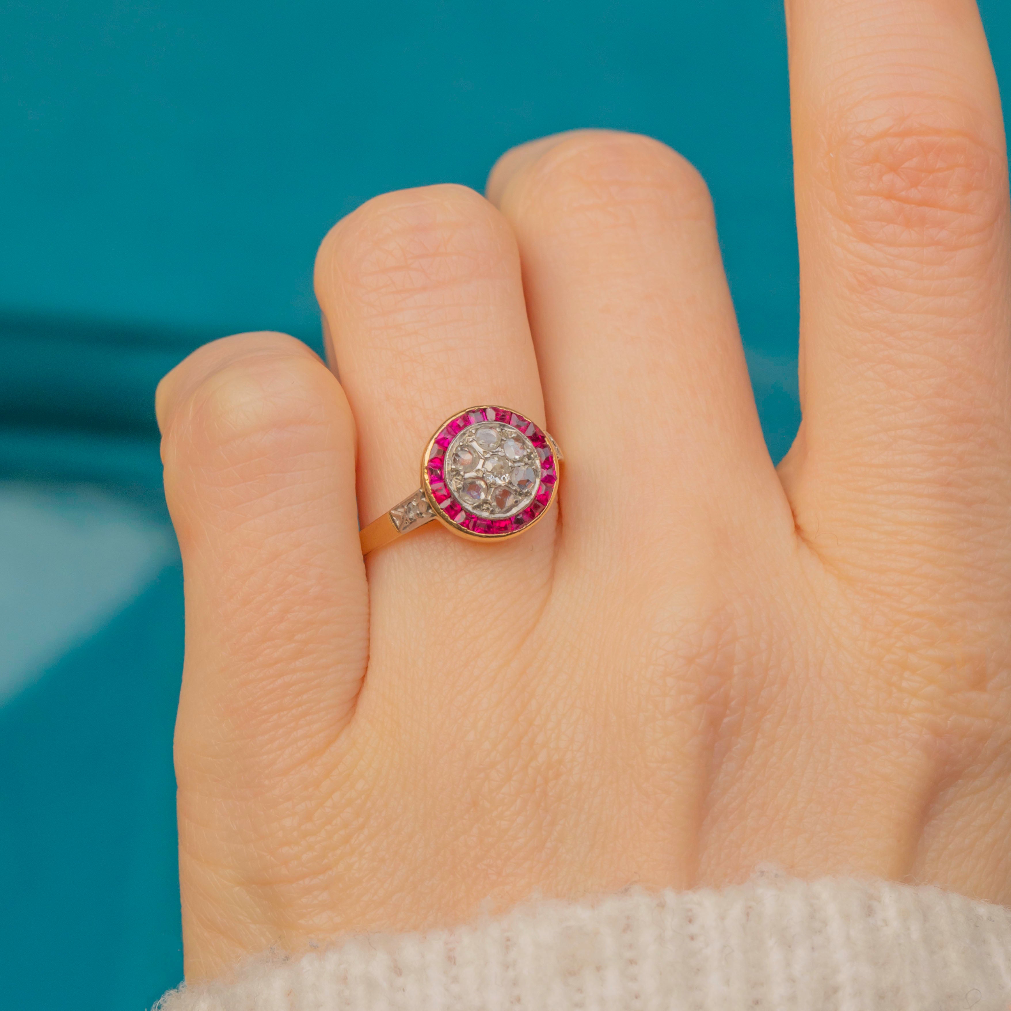 VERY GOOD. This French Art Deco 18ct Gold Ruby Diamond target cluster ring is in very good condition throughout! The stones are present and securely set, and while a few have minor surface wear, this is only visible under close inspection. Her 18ct Gold band is beautifully rich and saturated with only some mild age-related wear. This one-of-a-kind ring is ready to be worn and enjoyed!